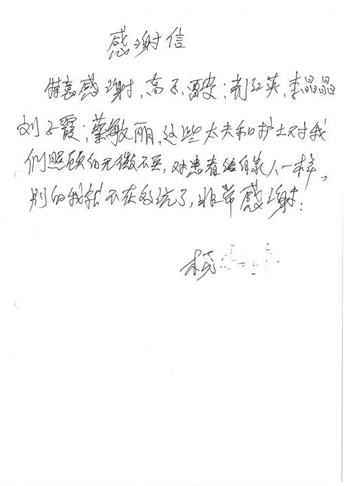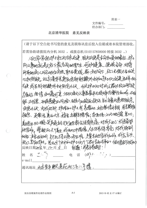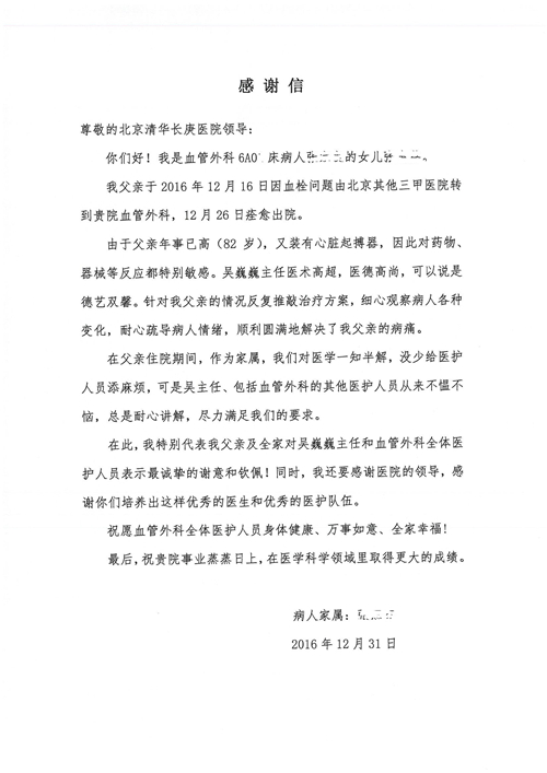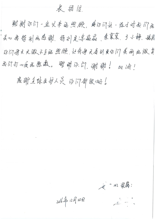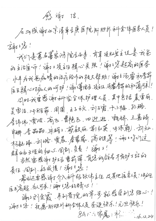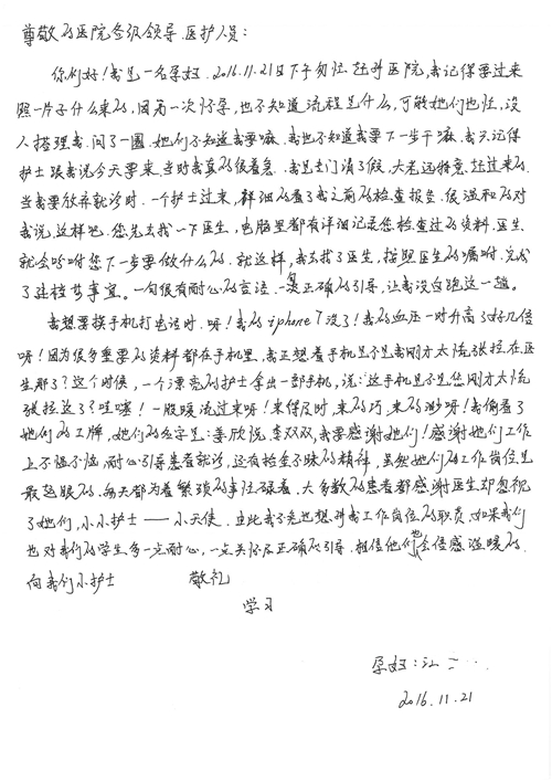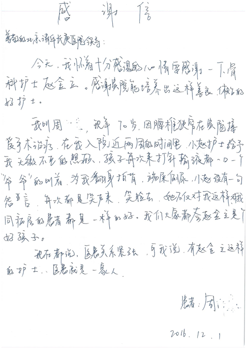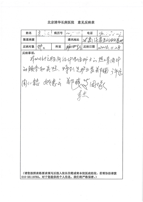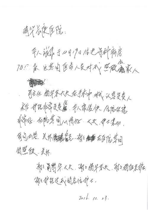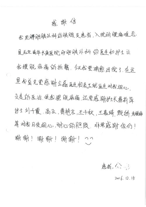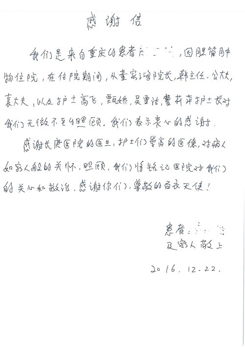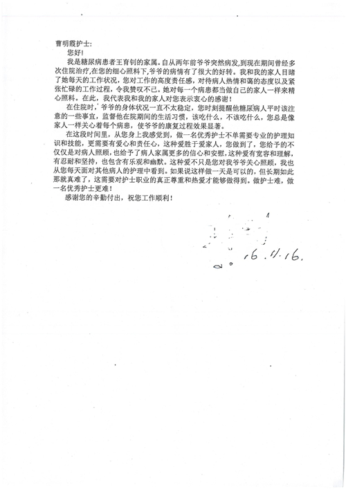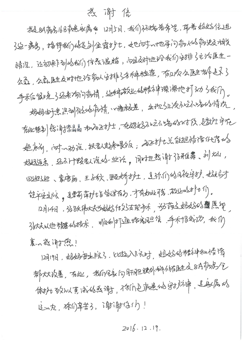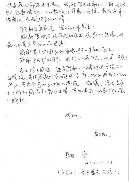 2016年12月,我院共接到患者及家属感谢信81封,其中肝胆外科董家鸿主任医师、张洪义主任医师、张跃伟主任医师、石军副主任医师、韩东冬副主任医师、项灿宏副主任医师、公磊医师、杨世伟医师、汤睿医师、李昂医师、袁玉斌医师,普通外科罗斌主任医师、李元新主任医师、刘伯涛主治医师、白熠州主治医师、汤洁莹医师、赵传多医师、朱融融医师,骨科肖嵩华主任医师、宋飞主治医师、杨华东主治医师、顾苏熙主治医师,泌尿外科张鑫副主任医师、王澍医师,心脏内科张萍主任医师、缪国斌主任医师、薛亚军主治医师,肾脏内科李月红主任医师、庄震主治医师,消化内科相马宁主任医师、刘佳文主治医师,血液及肿瘤内科刘兆祥住院医师,妇产科黄振宇副主任医师、张蕾副主任医师、马珂副主任医师、刘晨副主任医师、刘瑛医师、王奔医师、王晓茜医师,儿科季丽娜副主任医师,内分泌科蓸沉香主治医师,眼科胡胡运韬主任医师、郭立斌副主任医师、司山成医师,耳鼻咽喉头颈外科叶京英主任医师、伊海金副主任医师、尹国平主治医师,急诊科周杰医师,ICU许媛主任医师,医事处李俊男,保卫处马班长,保洁员刘玉芳,护理部袁雪丽、吴雪洁、李伟伟、孙璐、蔡敏丽、李晶晶、秦蒙蒙、于小梅、张雅绯、周圆、王子秋、刘子霞、贾波、高飞、曹艳飞、田迎迎、甄娇、王嘉琦、申姗、李晶晶、宋辉辉、荆红英、张保乾、刘灿、杨钰琢、贾晨、高雅、曹莉萍、戚欣、刘金霞、曹明霞、杨旭东、叶露、李文静、李慧、林景熠、王梦瑶、许丽、杨秀玉、徐洋洋、许平平、谢娟娟、谢兰兰、季静、郭莹莹、代海栾、苑贵芳、杜双双、李亚灵、张慧文、方玲、于洋洋、黄婧倩、刘宇琛、李冰、赵金立、刘天玉、杨凯、赵宝晶、张晓岚、刘盼、陈晓红、赵杰、王宇、赵金立、郑楠、刘晶钰、姚惠云、许乐、周小懿、郑爽、李杰、李双双、姜欣悦、潘景娜、张东鑫、李梦莹、宋研研、范李璐以及缪国斌医护团队,心脏内科、骨科、血管外科、肝胆外科、妇产科、ICU、肾脏内科全体医护人员,6B、9A、普通外科全体护士收到具名表扬。特此公告,以资鼓励!