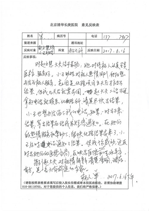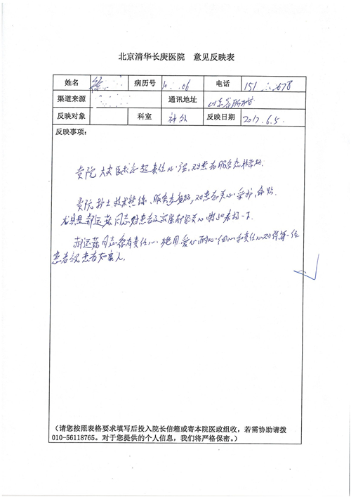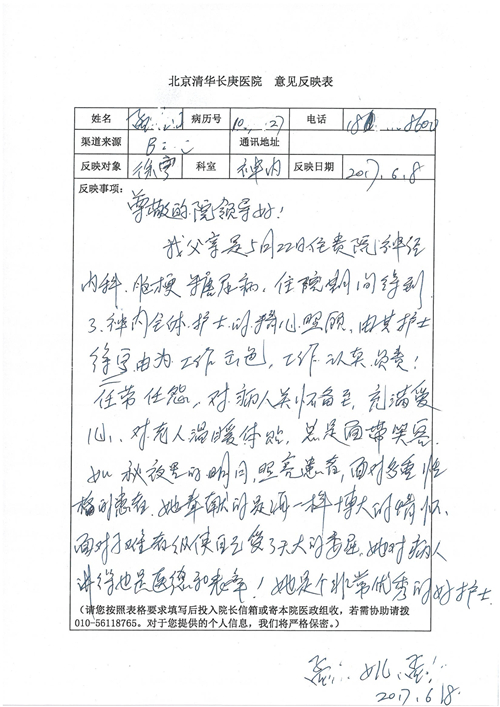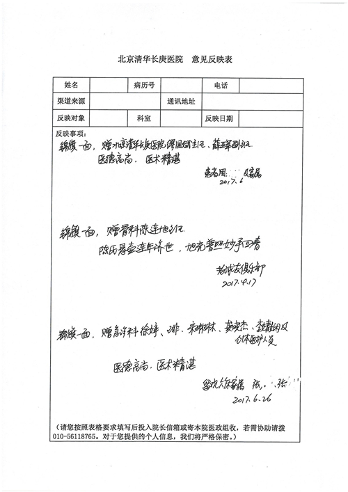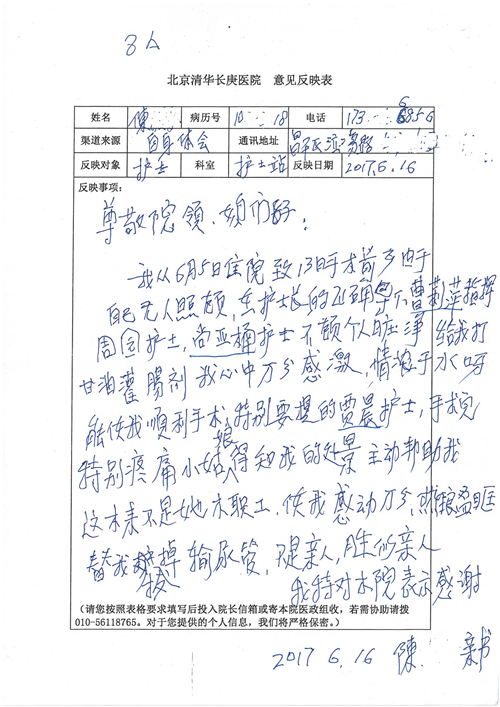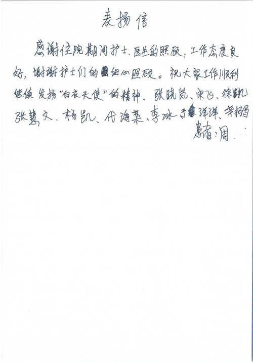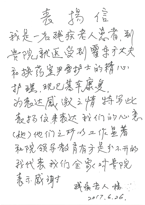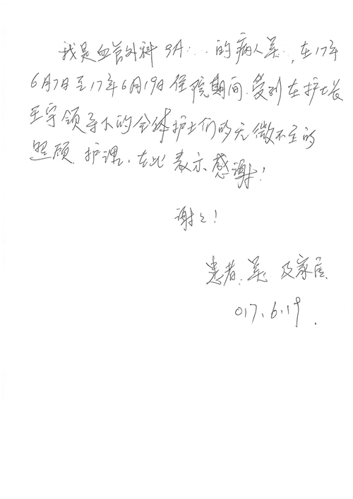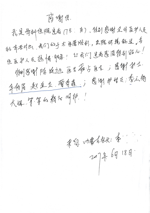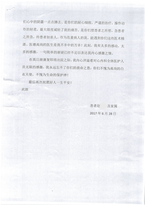 2017年6月,我院共接到患者及家属感谢信44封,其中神经外科苏伟主治医师、李伟医师,普通外科霍东方主治医师,骨科肖嵩华主任医师、陈连旭主任医师、宋飞主治医师、徐凯医师,疼痛治疗科刘芳主治医师,心脏内科缪国斌主任医师、王伟民主任医师、薛亚军主治医师,神经内科武剑主任医师,肾脏内科庄震副主任医师,血液肿瘤内科王燕婴医师,妇产科廖秦平主任医师、张蕾副主任医师、马珂副主任医师,康复医学科陈固稳,内分泌科赵文惠副主任医师,皮肤科赵邑主任医师、蒋源副主任医师,眼科胡运韬主任医师,中医科刘承主治医师,耳鼻咽喉头颈外科叶京英主任医师、曲玥医师,急诊科王非主治医师、宋琳琳主治医师、徐婷主治医师、龚晓杰主治医师、李静娴医师,超声科白志勇副主任医师,放射治疗科蒋静副主任医师,临床药学科胡永芳主任药师,医事处杨水晶、孙小乐,护理员李玉梅,保洁员张景琴,护理部郝运茹、张文文、张青丹、徐宁、韩雨亭、曹莉萍、尚亚楠、贾晨、张莎、钱月、张晓岚、宋飞、徐凯、张慧文、杨凯、代海栾、李冰、于洋洋、辛扬眉、李冰、赵金立、曹奇菲、邵婷婷、石慧、韩允、黄帅、王宇、齐苗苗、申姗、何子倩、尹雪、陈莹、张轶慧、李政辉、刘晨,ICU、心脏内科、急诊科、产科、眼科全体医护人员及神经内科、8A、骨科全体护士收到具名表扬。特此公告,以资鼓励!