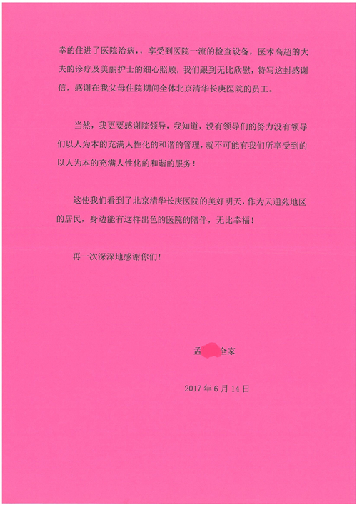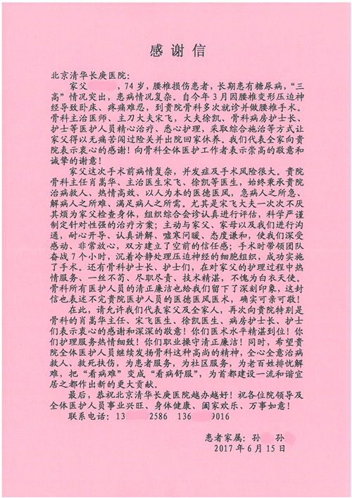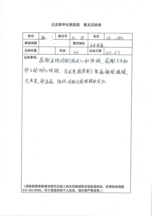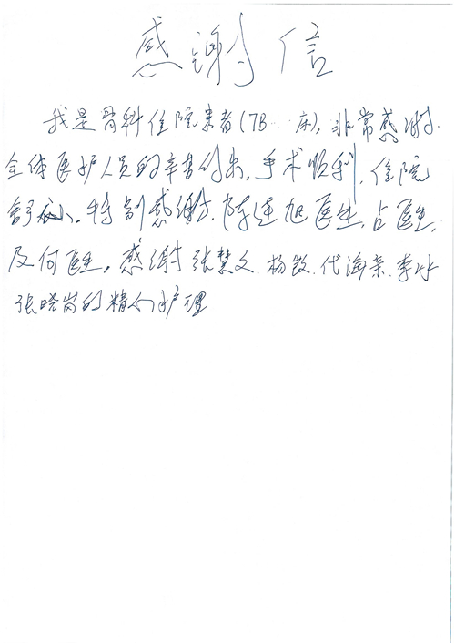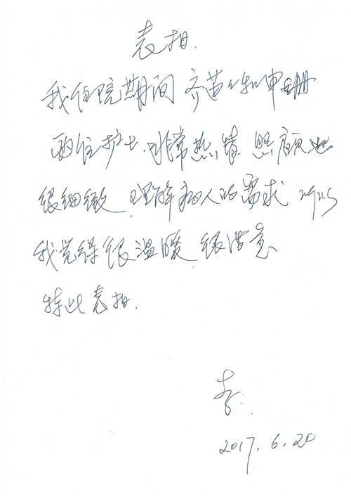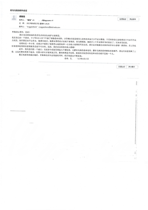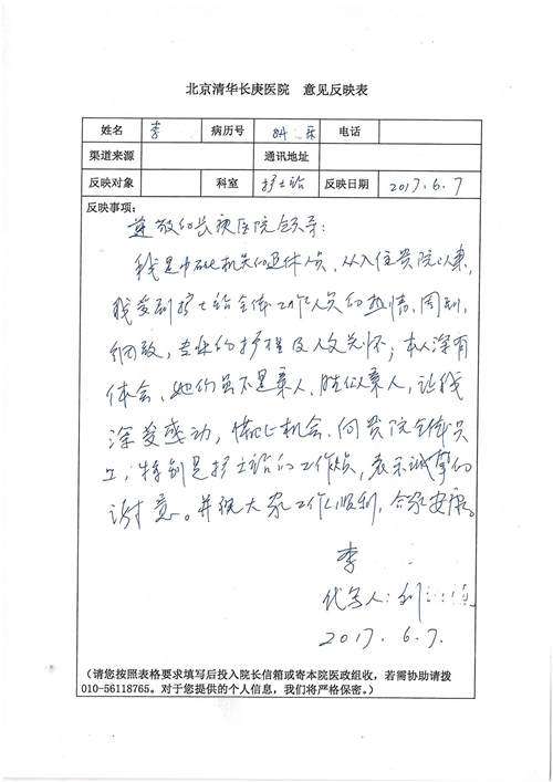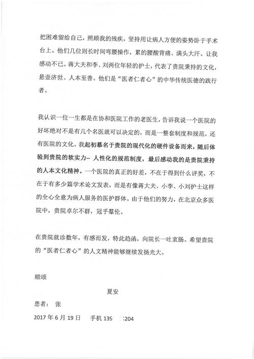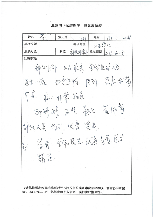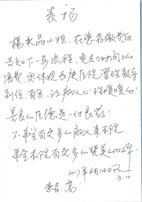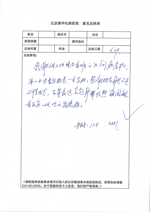 2017年6月,我院共接到患者及家属感谢信44封,其中神经外科苏伟主治医师、李伟医师,普通外科霍东方主治医师,骨科肖嵩华主任医师、陈连旭主任医师、宋飞主治医师、徐凯医师,疼痛治疗科刘芳主治医师,心脏内科缪国斌主任医师、王伟民主任医师、薛亚军主治医师,神经内科武剑主任医师,肾脏内科庄震副主任医师,血液肿瘤内科王燕婴医师,妇产科廖秦平主任医师、张蕾副主任医师、马珂副主任医师,康复医学科陈固稳,内分泌科赵文惠副主任医师,皮肤科赵邑主任医师、蒋源副主任医师,眼科胡运韬主任医师,中医科刘承主治医师,耳鼻咽喉头颈外科叶京英主任医师、曲玥医师,急诊科王非主治医师、宋琳琳主治医师、徐婷主治医师、龚晓杰主治医师、李静娴医师,超声科白志勇副主任医师,放射治疗科蒋静副主任医师,临床药学科胡永芳主任药师,医事处杨水晶、孙小乐,护理员李玉梅,保洁员张景琴,护理部郝运茹、张文文、张青丹、徐宁、韩雨亭、曹莉萍、尚亚楠、贾晨、张莎、钱月、张晓岚、宋飞、徐凯、张慧文、杨凯、代海栾、李冰、于洋洋、辛扬眉、李冰、赵金立、曹奇菲、邵婷婷、石慧、韩允、黄帅、王宇、齐苗苗、申姗、何子倩、尹雪、陈莹、张轶慧、李政辉、刘晨,ICU、心脏内科、急诊科、产科、眼科全体医护人员及神经内科、8A、骨科全体护士收到具名表扬。特此公告,以资鼓励!