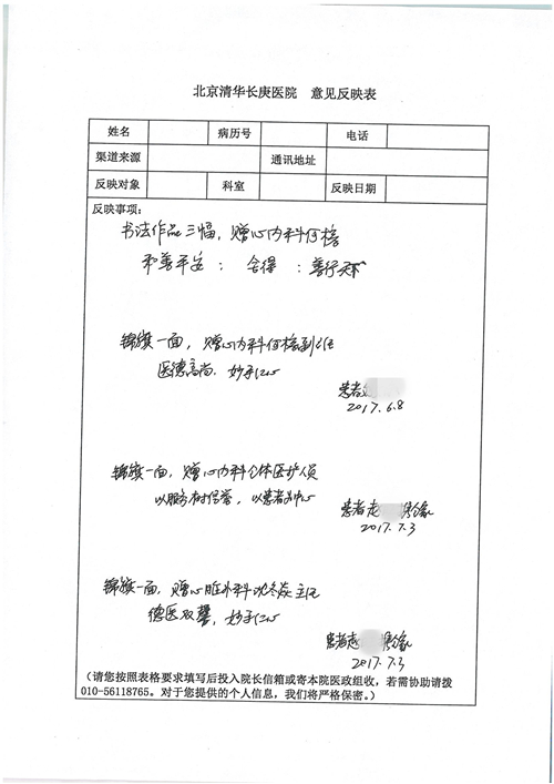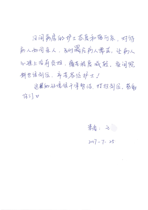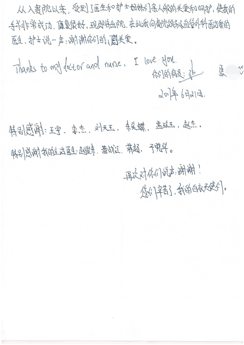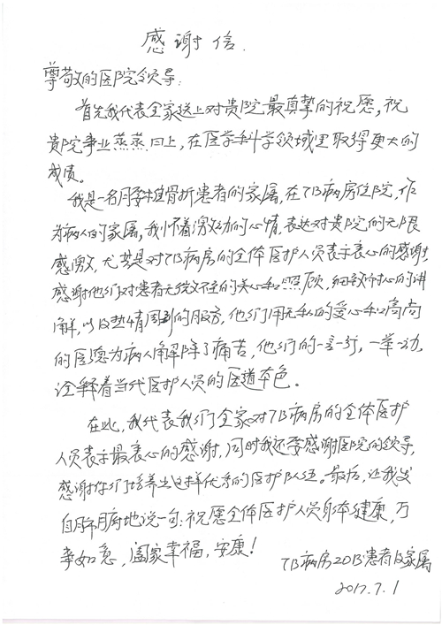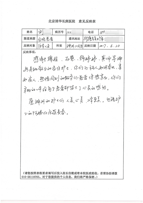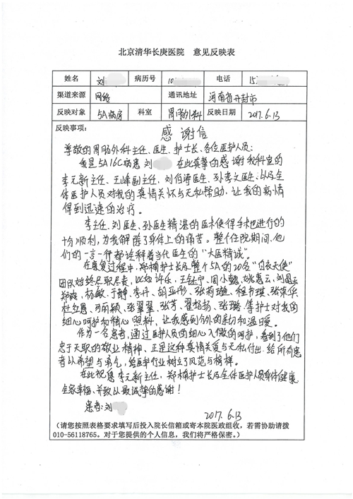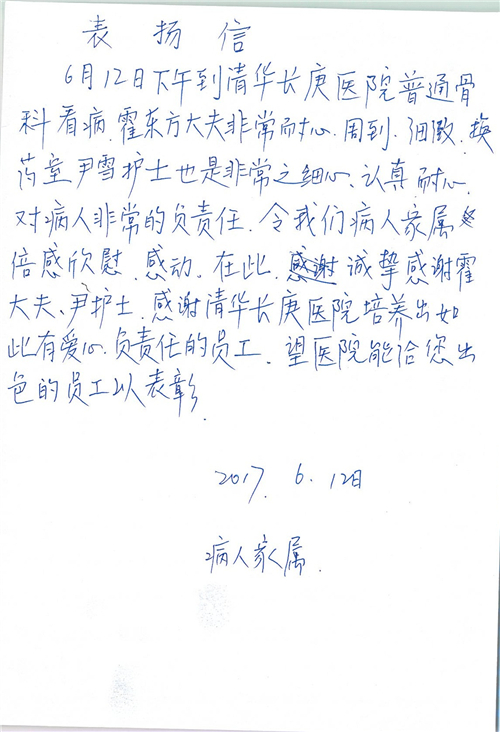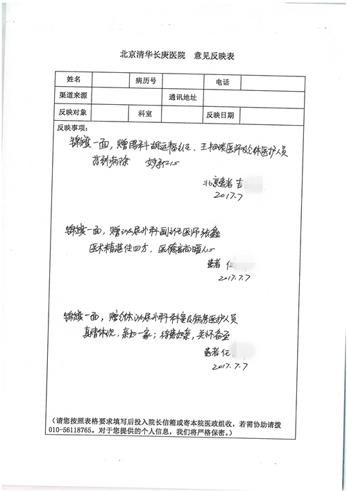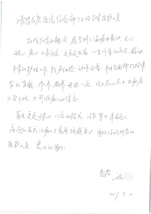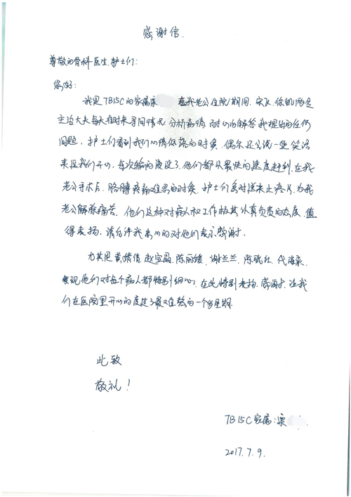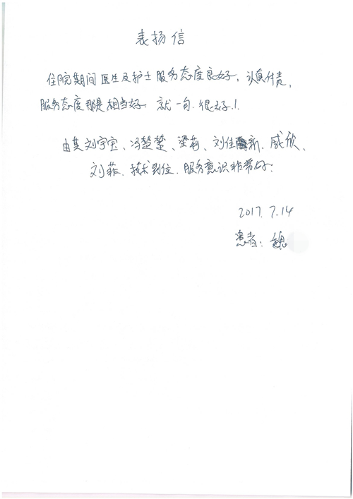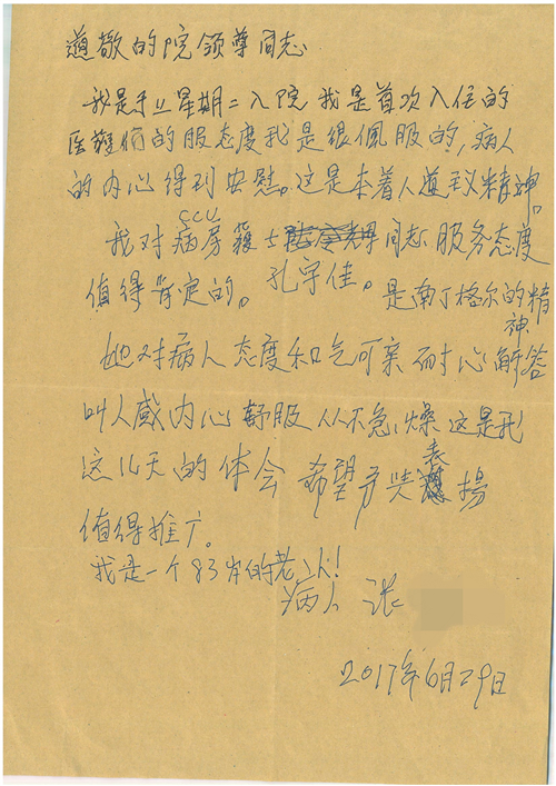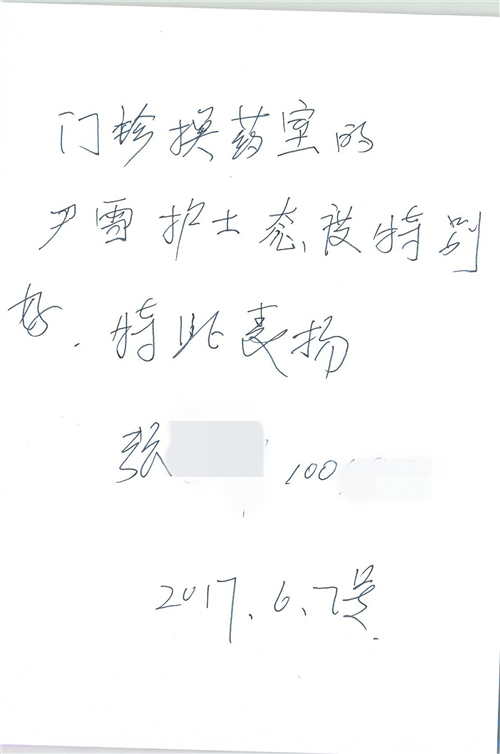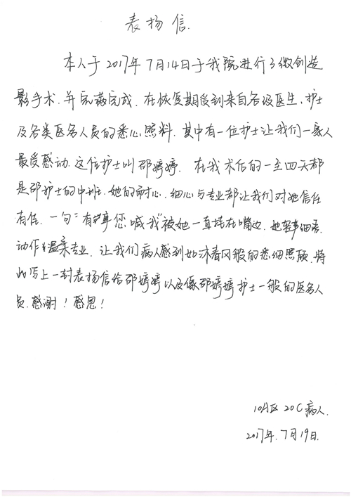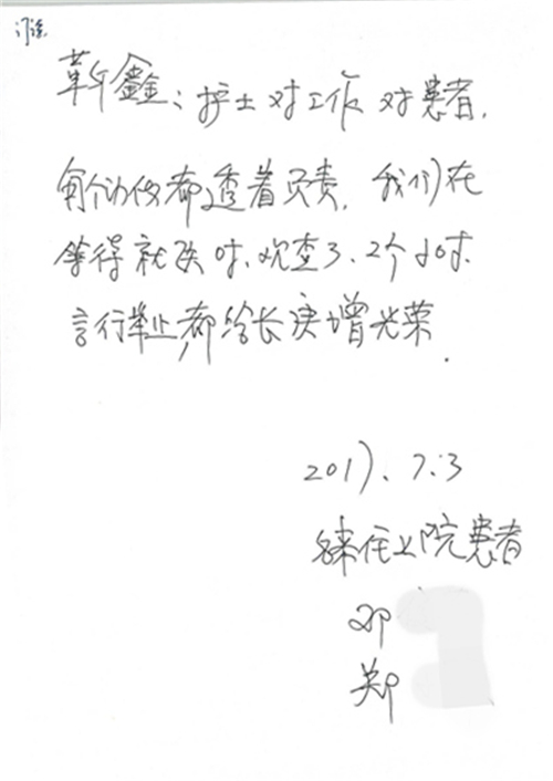 2017年7月,我院共接到患者及家属感谢信85封,其中肝胆外科董家鸿主任医师、张洪义主任医师;神经外科王劲主任医师、孙振兴医师、王振泽医师;普通外科罗斌主任医师、霍东方主治医师、马天翼医师、刘安阳医师;胃肠外科李元新主任医师、王峰副主任医师、蔺宏伟副主任医师、刘伯涛主治医师、王会元主治医师、孙孝文医师;骨科蔡谞主任医师、宋飞主治医师、杨华东主治医师、徐凯医师;血管外科吴巍巍主任医师、赵俊来主治医师、曹战江医师、蒋超医师、杨宇医师;泌尿外科李建兴主任医师、张鑫主任医师、肖博主治医师;心脏外科沈冬焱副主任医师;心脏内科张萍主任医师、缪国斌主任医师、刘元伟副主任医师、何榕副主任医师、王伟民主治医师、薛亚军主治医师、孙巍医师;神经内科武剑主任医师;肾脏内科李月红主任医师、李敏侠主治医师、庄震主治医师、温雯医师;普通内科马序竹副主任医师、王逸群主治医师、冯莉莉主治医师、李妮医师;消化内科刘佳文主治医师;妇产科黄振宇副主任医师、刘晨副主任医师;儿科晁爽副主任医师、李然主治医师;康复医学科李欣主治医师;皮肤科黄晨昱副主任医师、蒋源副主任医师;口腔科张雪梅主治医师;眼科胡运韬主任医师、刘瑄副主任医师、郭立斌副主任医师、宋丹副主任医师、王韧琰主治医师;耳鼻咽喉头颈外科纪育斌副主任医师;放射治疗科蒋静副主任医师;医事处金菲、贯诗君、杨水晶、张思雨、谢晶文、刘艳凤、霍占娟、曾斌,护理部辛扬眉、郑楠、王宇、王珍、李建华、李政辉、刘晨、王宇、李杰、刘天玉、朱笑蝶、孟玲玉、赵杰、于晓华、穆娟、石慧、舒婷婷、黄帅、刘子霞、高飞、尹雪、靳鑫、黄倩倩、赵宝晶、陈丽媛、谢兰兰、陈晓红、代海栾、赵宝晶、张晓岚、杨凯、苑贵芳、黄倩倩、曹奇菲、宿文琪、李爽尽、李泽源、李美婷、尚明燕、聂文博、石晨燕、孔宇佳、刘宇保、冯楚楚、梁丽、刘佳新、戚欣、刘菲、邵婷婷、韩允、李怡然、薄艳娜,耳鼻喉科、心脏内科、骨科、泌尿外科、眼科、妇产科、普通内科、放射治疗科、普通外科、廖秦平主任团队全体医护人员及郑楠护士团队、普通外科全体护士收到具名表扬。特此公告,以资鼓励!