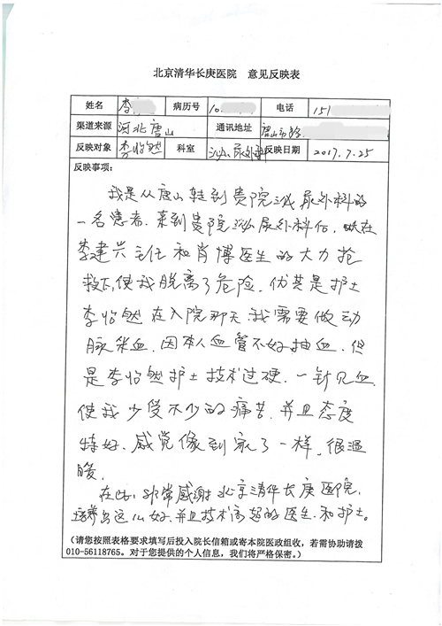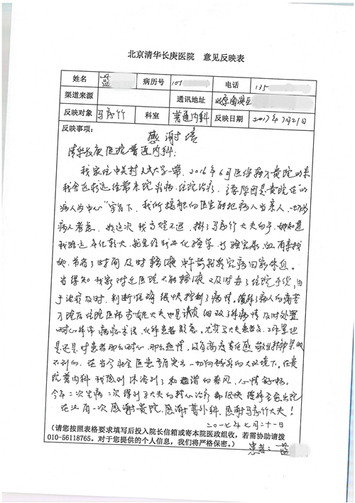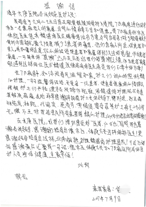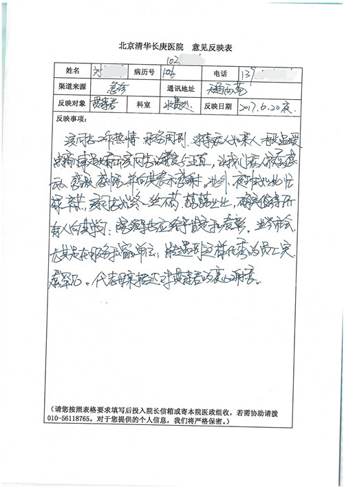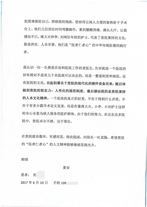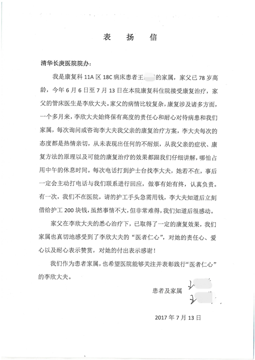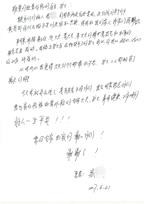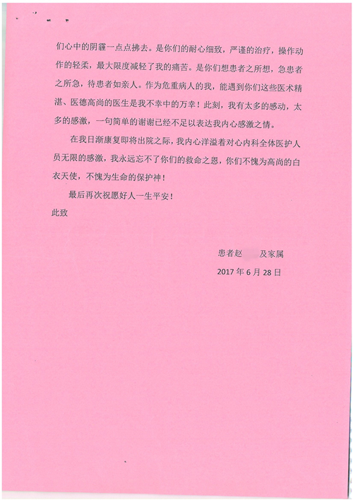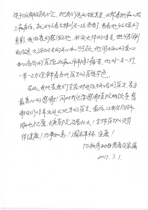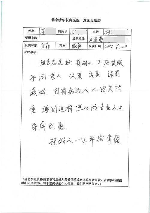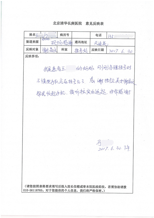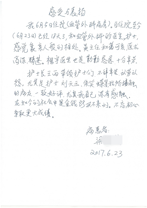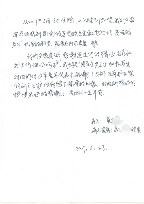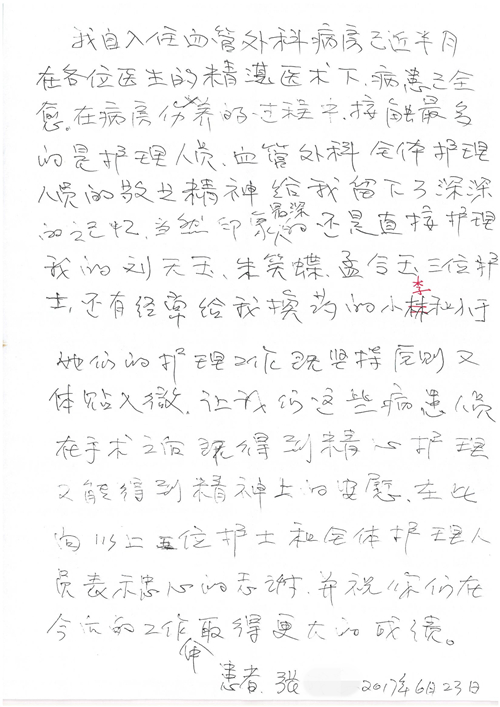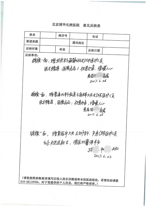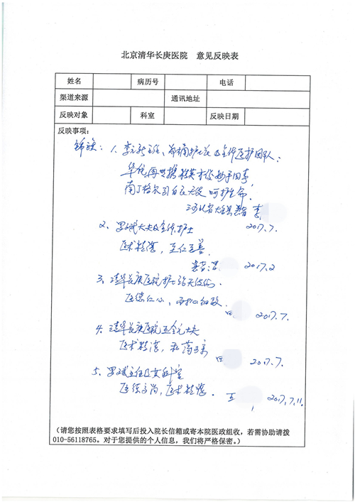 2017年7月,我院共接到患者及家属感谢信85封,其中肝胆外科董家鸿主任医师、张洪义主任医师;神经外科王劲主任医师、孙振兴医师、王振泽医师;普通外科罗斌主任医师、霍东方主治医师、马天翼医师、刘安阳医师;胃肠外科李元新主任医师、王峰副主任医师、蔺宏伟副主任医师、刘伯涛主治医师、王会元主治医师、孙孝文医师;骨科蔡谞主任医师、宋飞主治医师、杨华东主治医师、徐凯医师;血管外科吴巍巍主任医师、赵俊来主治医师、曹战江医师、蒋超医师、杨宇医师;泌尿外科李建兴主任医师、张鑫主任医师、肖博主治医师;心脏外科沈冬焱副主任医师;心脏内科张萍主任医师、缪国斌主任医师、刘元伟副主任医师、何榕副主任医师、王伟民主治医师、薛亚军主治医师、孙巍医师;神经内科武剑主任医师;肾脏内科李月红主任医师、李敏侠主治医师、庄震主治医师、温雯医师;普通内科马序竹副主任医师、王逸群主治医师、冯莉莉主治医师、李妮医师;消化内科刘佳文主治医师;妇产科黄振宇副主任医师、刘晨副主任医师;儿科晁爽副主任医师、李然主治医师;康复医学科李欣主治医师;皮肤科黄晨昱副主任医师、蒋源副主任医师;口腔科张雪梅主治医师;眼科胡运韬主任医师、刘瑄副主任医师、郭立斌副主任医师、宋丹副主任医师、王韧琰主治医师;耳鼻咽喉头颈外科纪育斌副主任医师;放射治疗科蒋静副主任医师;医事处金菲、贯诗君、杨水晶、张思雨、谢晶文、刘艳凤、霍占娟、曾斌,护理部辛扬眉、郑楠、王宇、王珍、李建华、李政辉、刘晨、王宇、李杰、刘天玉、朱笑蝶、孟玲玉、赵杰、于晓华、穆娟、石慧、舒婷婷、黄帅、刘子霞、高飞、尹雪、靳鑫、黄倩倩、赵宝晶、陈丽媛、谢兰兰、陈晓红、代海栾、赵宝晶、张晓岚、杨凯、苑贵芳、黄倩倩、曹奇菲、宿文琪、李爽尽、李泽源、李美婷、尚明燕、聂文博、石晨燕、孔宇佳、刘宇保、冯楚楚、梁丽、刘佳新、戚欣、刘菲、邵婷婷、韩允、李怡然、薄艳娜,耳鼻喉科、心脏内科、骨科、泌尿外科、眼科、妇产科、普通内科、放射治疗科、普通外科、廖秦平主任团队全体医护人员及郑楠护士团队、普通外科全体护士收到具名表扬。特此公告,以资鼓励!