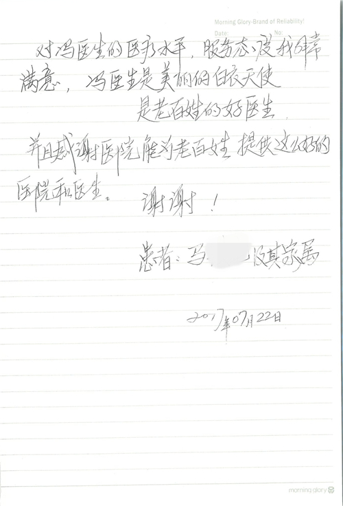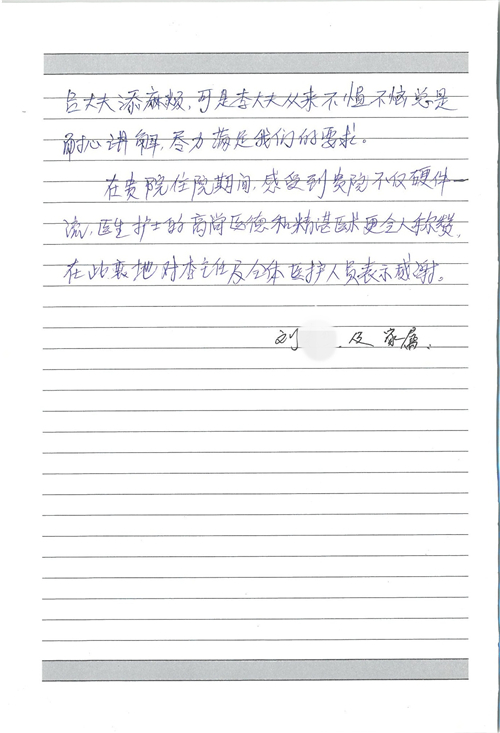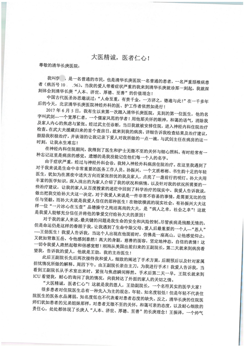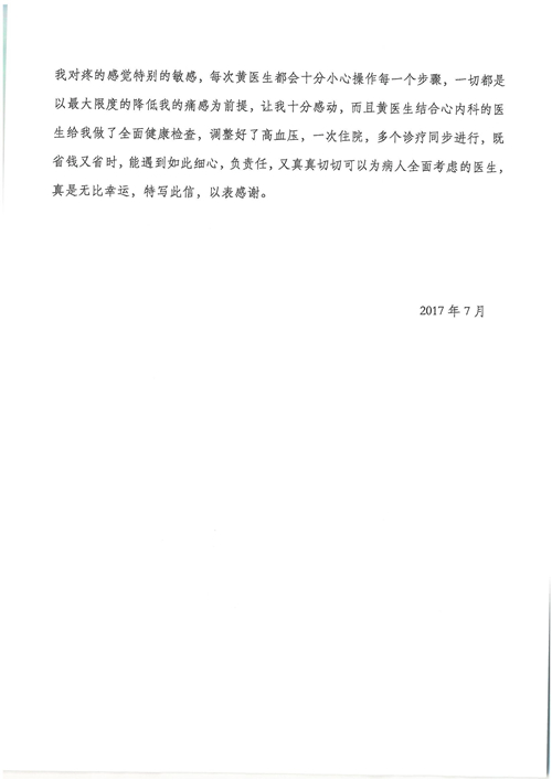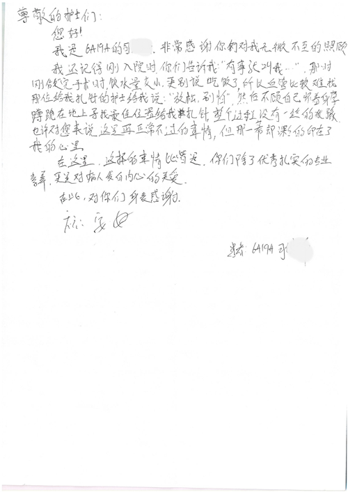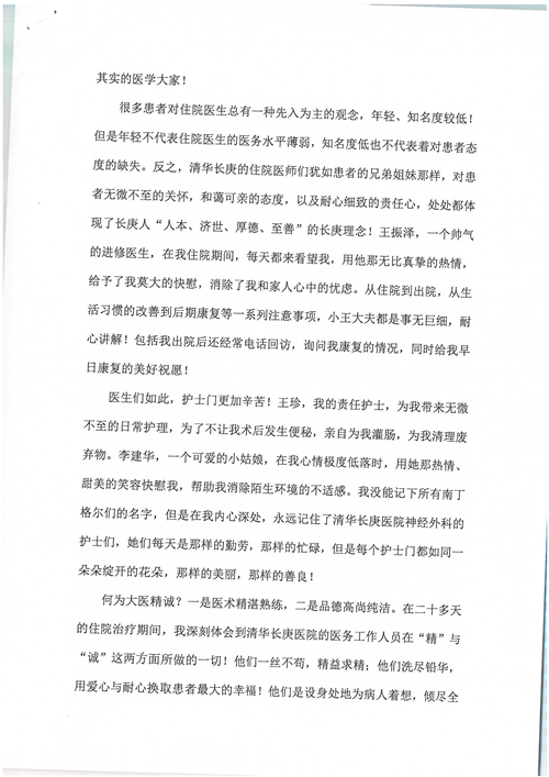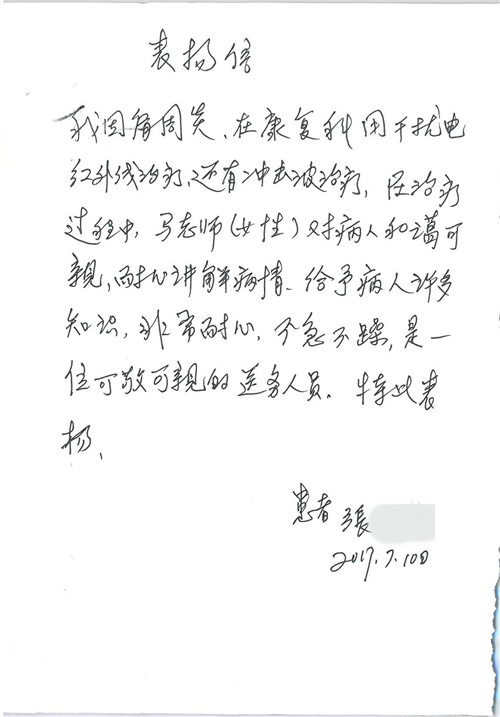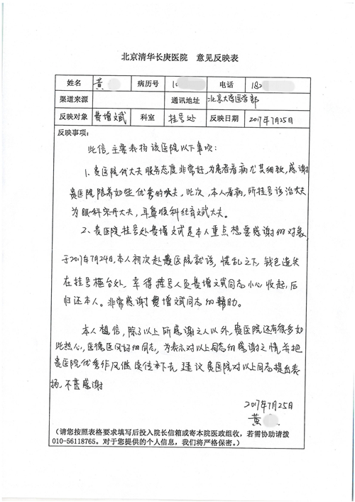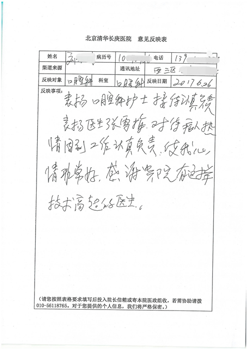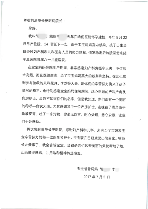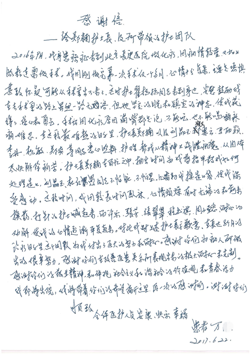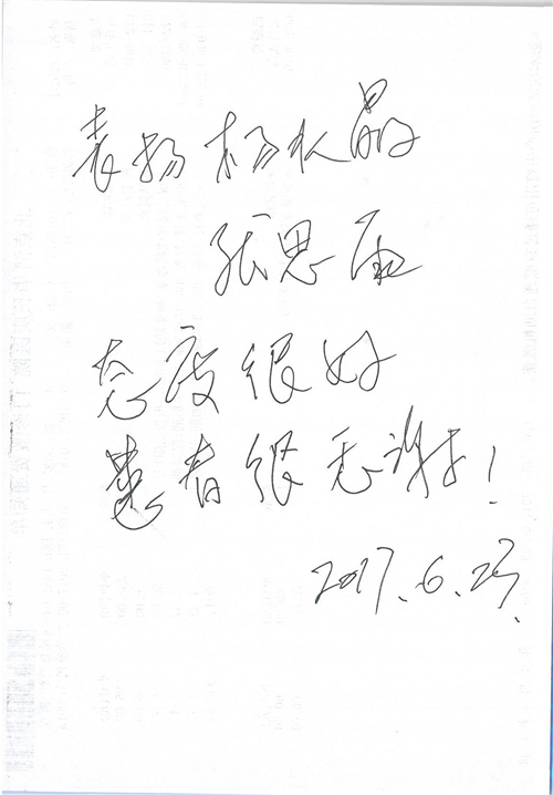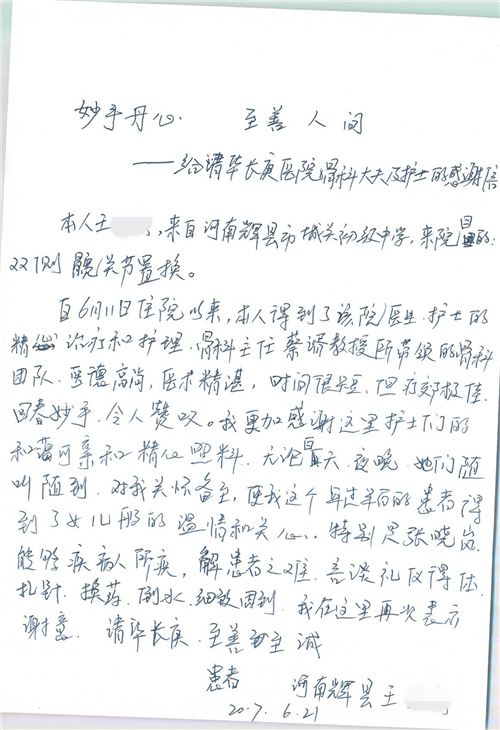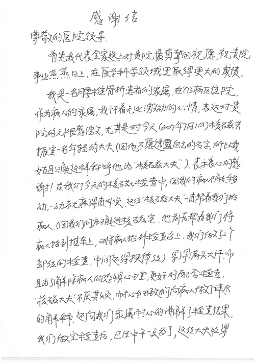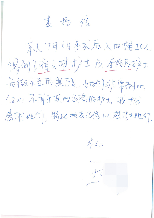 2017年7月,我院共接到患者及家属感谢信85封,其中肝胆外科董家鸿主任医师、张洪义主任医师;神经外科王劲主任医师、孙振兴医师、王振泽医师;普通外科罗斌主任医师、霍东方主治医师、马天翼医师、刘安阳医师;胃肠外科李元新主任医师、王峰副主任医师、蔺宏伟副主任医师、刘伯涛主治医师、王会元主治医师、孙孝文医师;骨科蔡谞主任医师、宋飞主治医师、杨华东主治医师、徐凯医师;血管外科吴巍巍主任医师、赵俊来主治医师、曹战江医师、蒋超医师、杨宇医师;泌尿外科李建兴主任医师、张鑫主任医师、肖博主治医师;心脏外科沈冬焱副主任医师;心脏内科张萍主任医师、缪国斌主任医师、刘元伟副主任医师、何榕副主任医师、王伟民主治医师、薛亚军主治医师、孙巍医师;神经内科武剑主任医师;肾脏内科李月红主任医师、李敏侠主治医师、庄震主治医师、温雯医师;普通内科马序竹副主任医师、王逸群主治医师、冯莉莉主治医师、李妮医师;消化内科刘佳文主治医师;妇产科黄振宇副主任医师、刘晨副主任医师;儿科晁爽副主任医师、李然主治医师;康复医学科李欣主治医师;皮肤科黄晨昱副主任医师、蒋源副主任医师;口腔科张雪梅主治医师;眼科胡运韬主任医师、刘瑄副主任医师、郭立斌副主任医师、宋丹副主任医师、王韧琰主治医师;耳鼻咽喉头颈外科纪育斌副主任医师;放射治疗科蒋静副主任医师;医事处金菲、贯诗君、杨水晶、张思雨、谢晶文、刘艳凤、霍占娟、曾斌,护理部辛扬眉、郑楠、王宇、王珍、李建华、李政辉、刘晨、王宇、李杰、刘天玉、朱笑蝶、孟玲玉、赵杰、于晓华、穆娟、石慧、舒婷婷、黄帅、刘子霞、高飞、尹雪、靳鑫、黄倩倩、赵宝晶、陈丽媛、谢兰兰、陈晓红、代海栾、赵宝晶、张晓岚、杨凯、苑贵芳、黄倩倩、曹奇菲、宿文琪、李爽尽、李泽源、李美婷、尚明燕、聂文博、石晨燕、孔宇佳、刘宇保、冯楚楚、梁丽、刘佳新、戚欣、刘菲、邵婷婷、韩允、李怡然、薄艳娜,耳鼻喉科、心脏内科、骨科、泌尿外科、眼科、妇产科、普通内科、放射治疗科、普通外科、廖秦平主任团队全体医护人员及郑楠护士团队、普通外科全体护士收到具名表扬。特此公告,以资鼓励!
