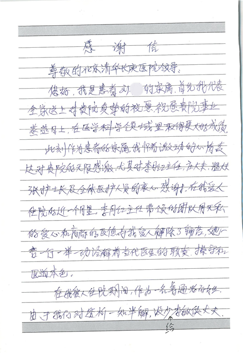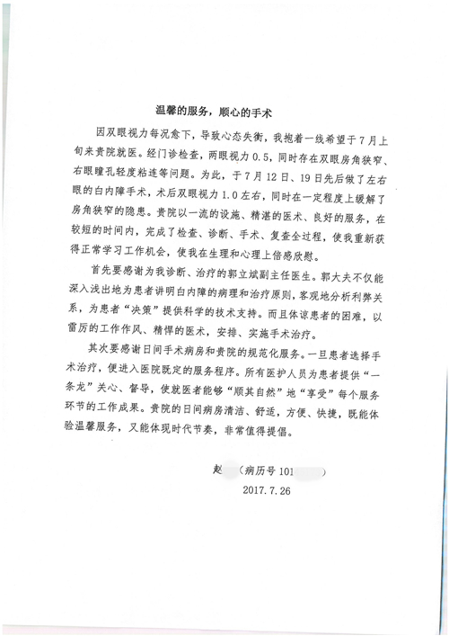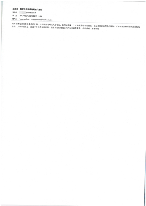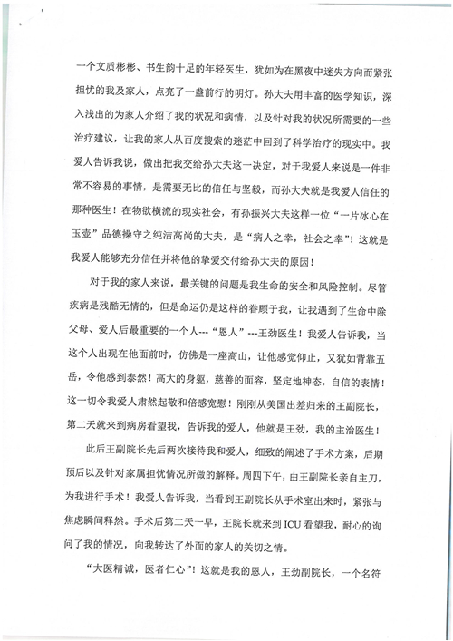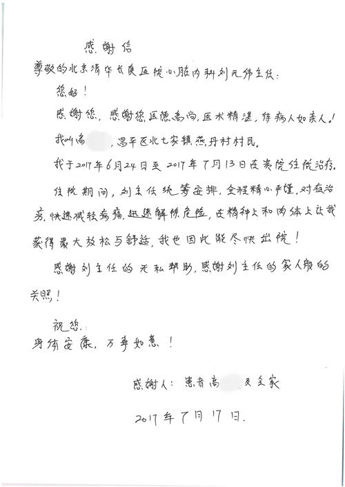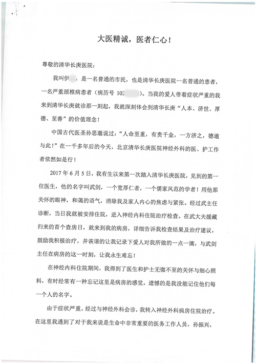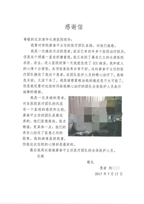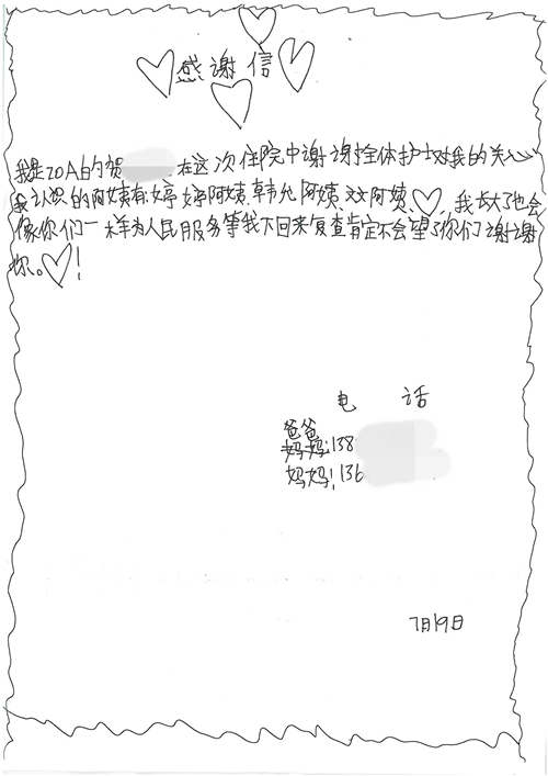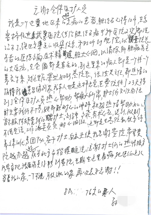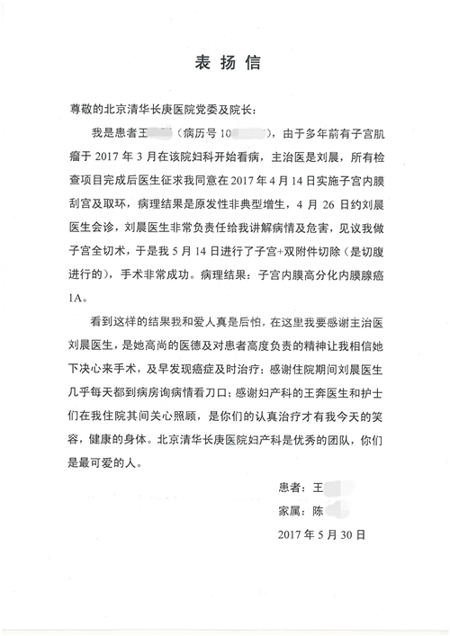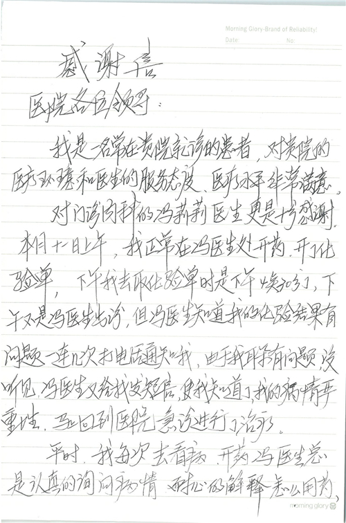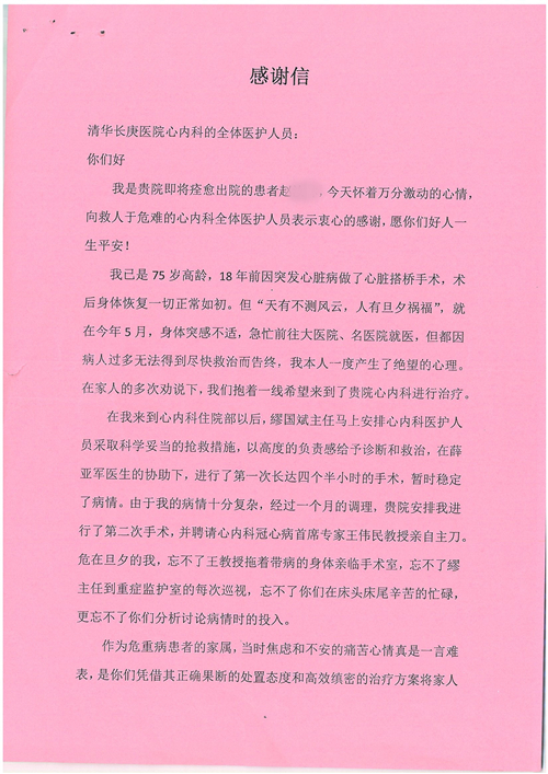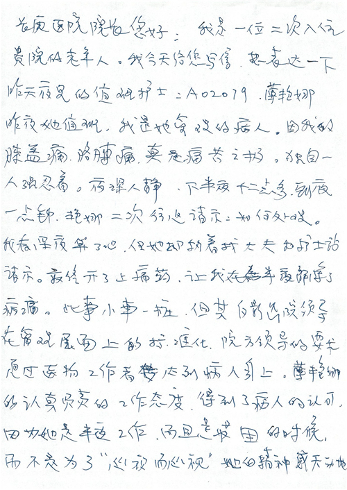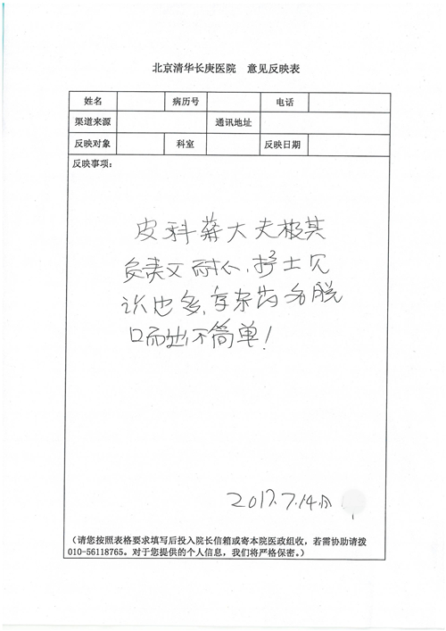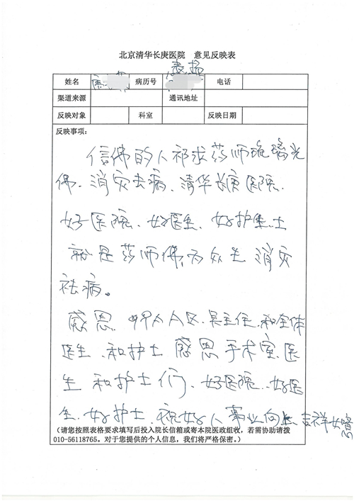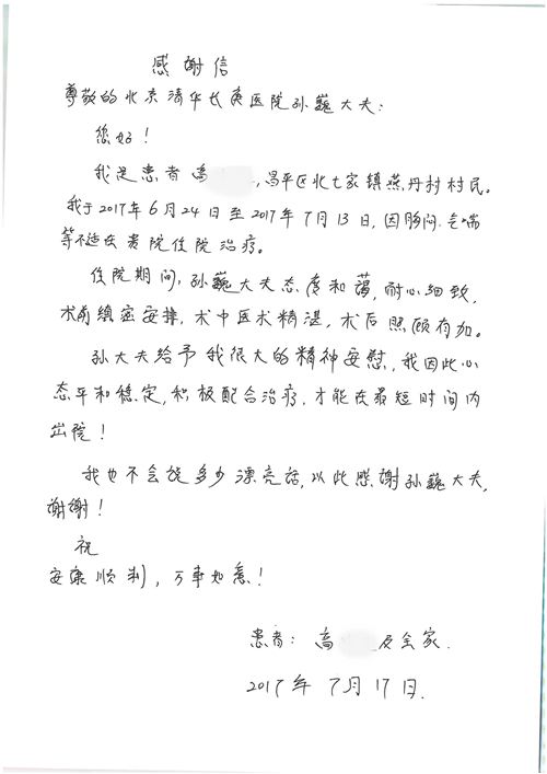 2017年7月,我院共接到患者及家属感谢信85封,其中肝胆外科董家鸿主任医师、张洪义主任医师;神经外科王劲主任医师、孙振兴医师、王振泽医师;普通外科罗斌主任医师、霍东方主治医师、马天翼医师、刘安阳医师;胃肠外科李元新主任医师、王峰副主任医师、蔺宏伟副主任医师、刘伯涛主治医师、王会元主治医师、孙孝文医师;骨科蔡谞主任医师、宋飞主治医师、杨华东主治医师、徐凯医师;血管外科吴巍巍主任医师、赵俊来主治医师、曹战江医师、蒋超医师、杨宇医师;泌尿外科李建兴主任医师、张鑫主任医师、肖博主治医师;心脏外科沈冬焱副主任医师;心脏内科张萍主任医师、缪国斌主任医师、刘元伟副主任医师、何榕副主任医师、王伟民主治医师、薛亚军主治医师、孙巍医师;神经内科武剑主任医师;肾脏内科李月红主任医师、李敏侠主治医师、庄震主治医师、温雯医师;普通内科马序竹副主任医师、王逸群主治医师、冯莉莉主治医师、李妮医师;消化内科刘佳文主治医师;妇产科黄振宇副主任医师、刘晨副主任医师;儿科晁爽副主任医师、李然主治医师;康复医学科李欣主治医师;皮肤科黄晨昱副主任医师、蒋源副主任医师;口腔科张雪梅主治医师;眼科胡运韬主任医师、刘瑄副主任医师、郭立斌副主任医师、宋丹副主任医师、王韧琰主治医师;耳鼻咽喉头颈外科纪育斌副主任医师;放射治疗科蒋静副主任医师;医事处金菲、贯诗君、杨水晶、张思雨、谢晶文、刘艳凤、霍占娟、曾斌,护理部辛扬眉、郑楠、王宇、王珍、李建华、李政辉、刘晨、王宇、李杰、刘天玉、朱笑蝶、孟玲玉、赵杰、于晓华、穆娟、石慧、舒婷婷、黄帅、刘子霞、高飞、尹雪、靳鑫、黄倩倩、赵宝晶、陈丽媛、谢兰兰、陈晓红、代海栾、赵宝晶、张晓岚、杨凯、苑贵芳、黄倩倩、曹奇菲、宿文琪、李爽尽、李泽源、李美婷、尚明燕、聂文博、石晨燕、孔宇佳、刘宇保、冯楚楚、梁丽、刘佳新、戚欣、刘菲、邵婷婷、韩允、李怡然、薄艳娜,耳鼻喉科、心脏内科、骨科、泌尿外科、眼科、妇产科、普通内科、放射治疗科、普通外科、廖秦平主任团队全体医护人员及郑楠护士团队、普通外科全体护士收到具名表扬。特此公告,以资鼓励!