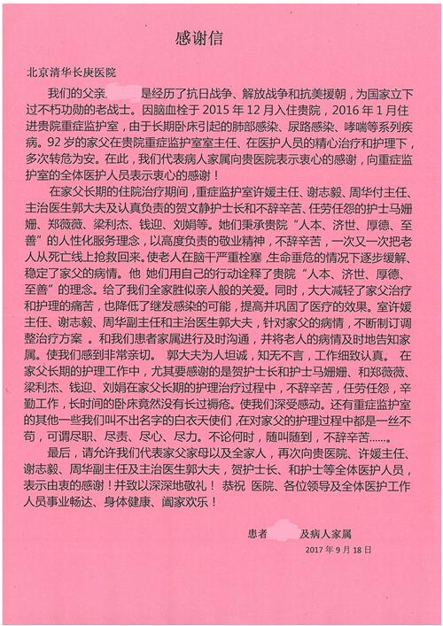 2017年9月,我院共接到患者及家属感谢信65封,其中肝胆外科张跃伟主任医师、杨世忠副主任医师、曾建平主治医师、公磊主治医师、张新静医师、任志忠医师、王良医师、杨世伟医师、朱融融医师;神经外科董生医师;普通外科罗斌主任医师;胃肠外科李元新主任医师、蔺宏伟副主任医师、张鹏主治医师、刘伯涛主治医师、孙孝文医师;骨科肖嵩华主任医师、邓玖征医师;血管外科吴巍巍主任医师、杨宇医师;胸腔外科陈东红副主任医师;麻醉科严思益主治医师;心脏内科张萍主任医师、缪国斌主任医师、李艳芳主任医师;呼吸内科王立万副主任医师、郭军副主任医师;肾脏内科李月红主任医师、李敏侠主治医师、庄震主治医师、吕佳璇医师;普通内科马序竹副主任医师、乔宇医师、杨靖医师、段瑶医师;消化内科王佳主治医师、郭晓娟医师、应小芳、李姣姣、霍雪茹;肝胆内科黄缘主任医师、王静月医师;妇产科张蕾副主任医师、杨曦主治医师、王晓茜主治医师;康复医学科潘钰主任医师、吴琼主治医师、徐泉主治医师、杨绯医师、张欢、朱红梅、谢平,皮肤科舒丹主治医师;口腔科朱静医师;眼科胡运韬主任医师;中医科秦建婷主治医师;耳鼻咽喉头颈外科伊海金副主任医师、秦贺副主任医师、许嘉医师、胡斌医师;急诊科张向阳副主任医师、宋琳琳主治医师、魏正杰医师;ICU许媛主任医师、谢志毅副主任医师、周华副主任医师;临床药学科张微微药师;医事处徐超、霍占娟;护理部李渝红、李冬蓉、林景熠、王雪君、李昌龙、张丽娜、袁雪丽、刘灿、张雅绯、荆红英、孙璐、张雅绯、田迎迎、贾晨、刘子霞、秦蒙蒙、宋辉辉、于小梅、周圆、贾波、吴雪洁、王帆、李晶、高飞、郑林霞、赵丹、薄艳娜、申姗、齐苗苗、刘伟芳、赵红杰、付焕丽、尤欣、周颖、杨秀玉、孟娇、杨秀玉、马阳阳、史金凤、尹雪、付焕丽、赵丹、严哲、刘天玉、朱笑蝶、李艺文、于晓华、孟令玉、甄娇、蒋红梅、高健、张静、朱鸿飞、刘岩、徐国良、成肖翠、李美婷、高国民、李春燕、朱文鹃、肖鑫、贺文静、马姗姗、郑薇薇、梁利杰、钱迎、刘娟、程美玲、孙雪洁、吴春慧、贾楠、胡春红;肖嵩华主任团队、吴巍巍主任团队、胡运韬主任团队、缪国斌主任团队以及胸外科全体医护人员收到具名表扬。特此公告,以资鼓励!