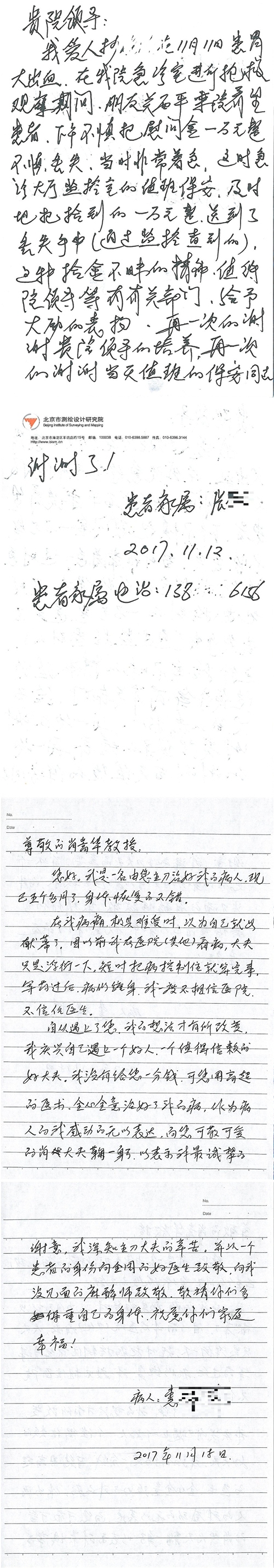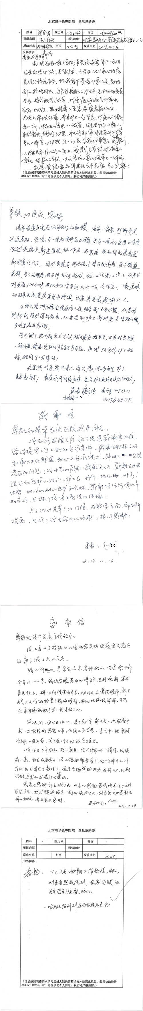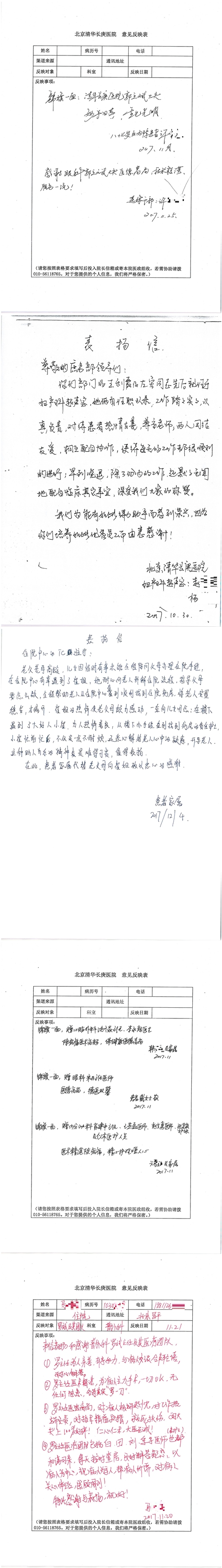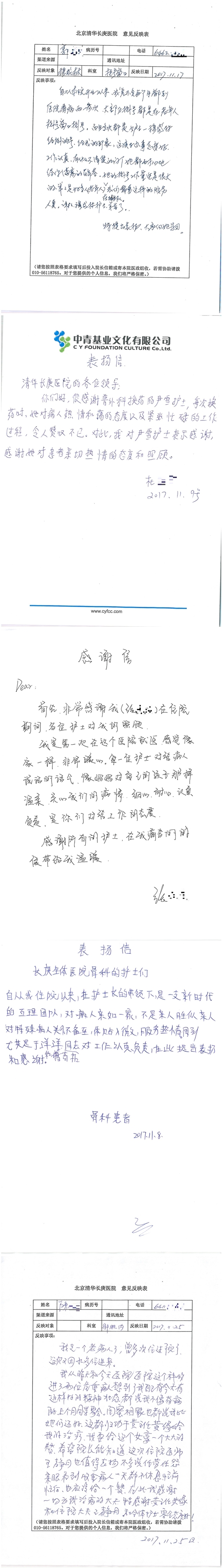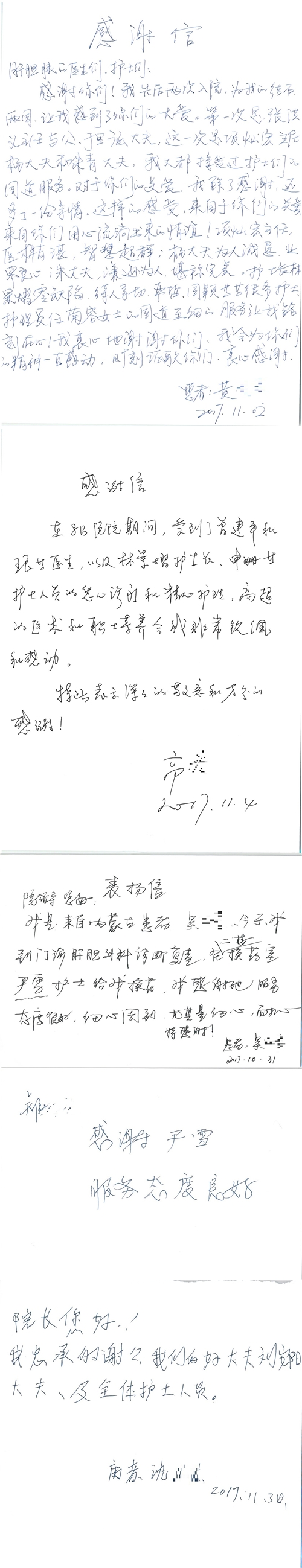 2017年11月,我院共接到患者及家属感谢信61封,其中肝胆外科张洪义主任医师、张跃伟主任医师、项灿宏副主任医师、公磊主治医师、王学栋主治医师、曾建平主治医师、王良主治医师、于飞医师、杨威医师、任志忠医师、于里涵医师、朱青医师;普通外科罗斌主任医师、白熠洲主治医师、刘安阳医师、田金翌医师;胃肠外科李元新主任医师、蔺宏伟副主任医师、季午阳医师;骨科肖嵩华主任医师、蔡谞主任医师;心脏外科沈冬焱副主任医师、李永超医师;心脏内科薛亚军主治医师;神经内科武剑主任医师;肝胆内科黄缘主任医师、王静月医师;妇产科廖秦平主任医师、张蕾副主任医师;儿科晁爽副主任医师;内分泌科肖建中主任医师、赵文惠副主任医师、王燕磊医师;眼科胡运韬主任医师、郭立斌副主任医师、宋丹副主任医师、司山成医师;全科医学科王仲主任医师;耳鼻咽喉头颈外科李欣副主任医师;医事处张平、穆成林、金菲;配送员崔玉茹、王利霞、左宏、曲阳;护理部闫伟娜、林景熠、张东敬、宋美娜、王雪燕、姚惠云、汪菲、杨钰琢、蒋帅男、田雪、尹雪、张芳、张璐、于静、杜红愚、王瑜玲、吕鹏、刘娟、郑微微、陈晨、尹雪、于洋、曹奇菲、王嘉琦、于小梅、田迎迎、于俊平、李硕、李思思、杨丽、陈丽媛、杨静、王瑛瑛、李惠惠、管艳艳、张翠翠、任菊容、申姗、9A全体护士;内分泌科、神经外科全体医护人员收到具名表扬。特此公告,以资鼓励!