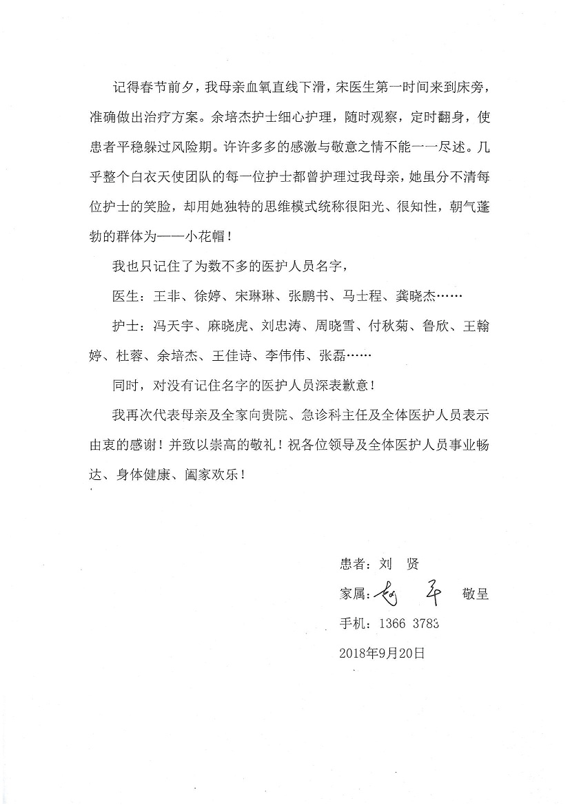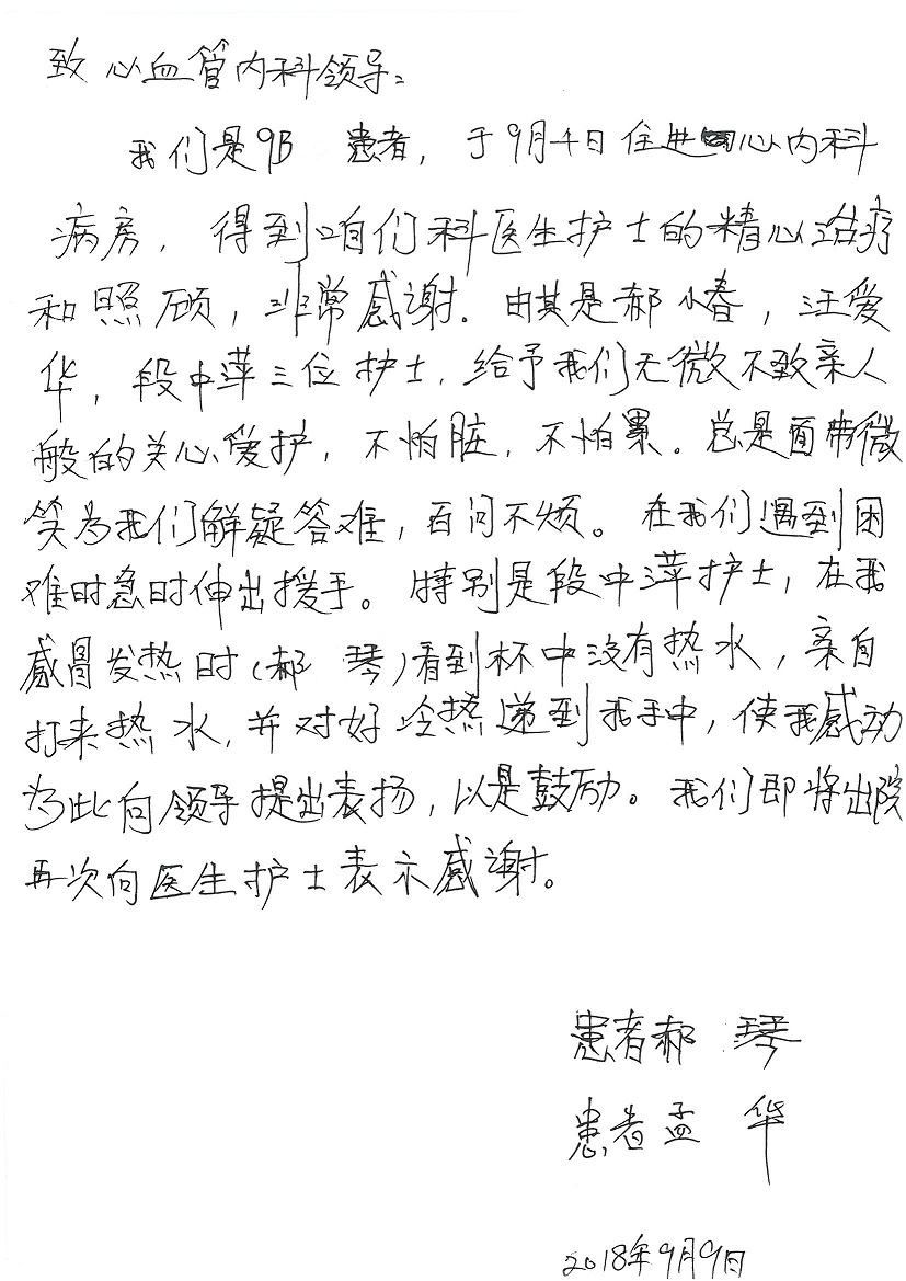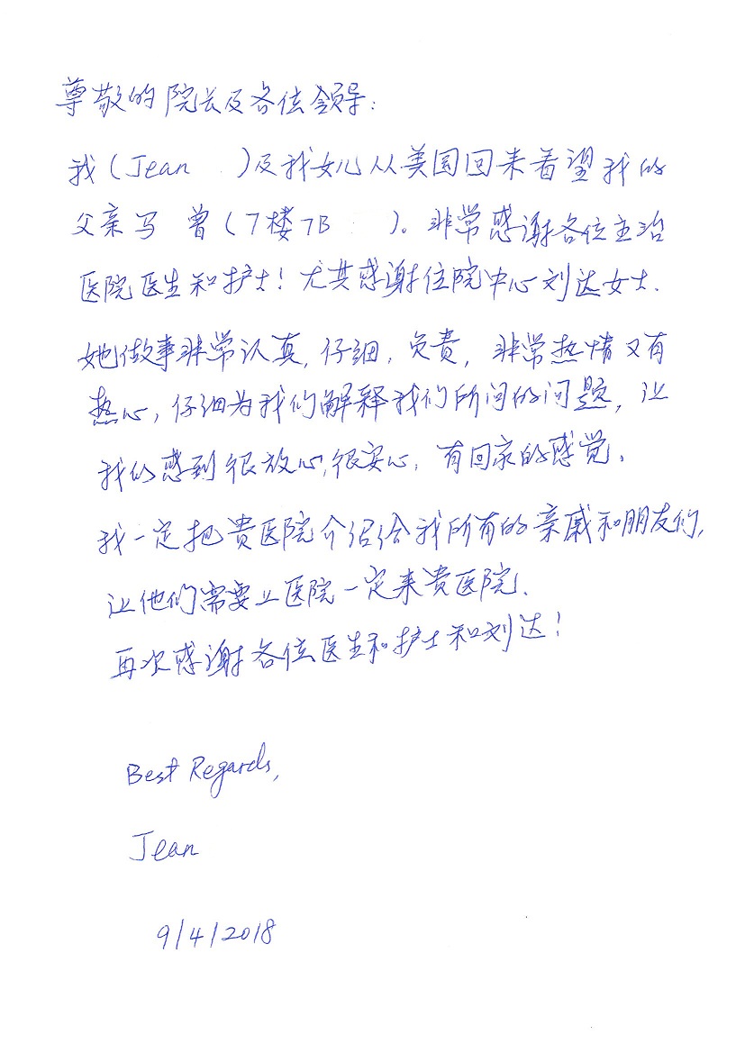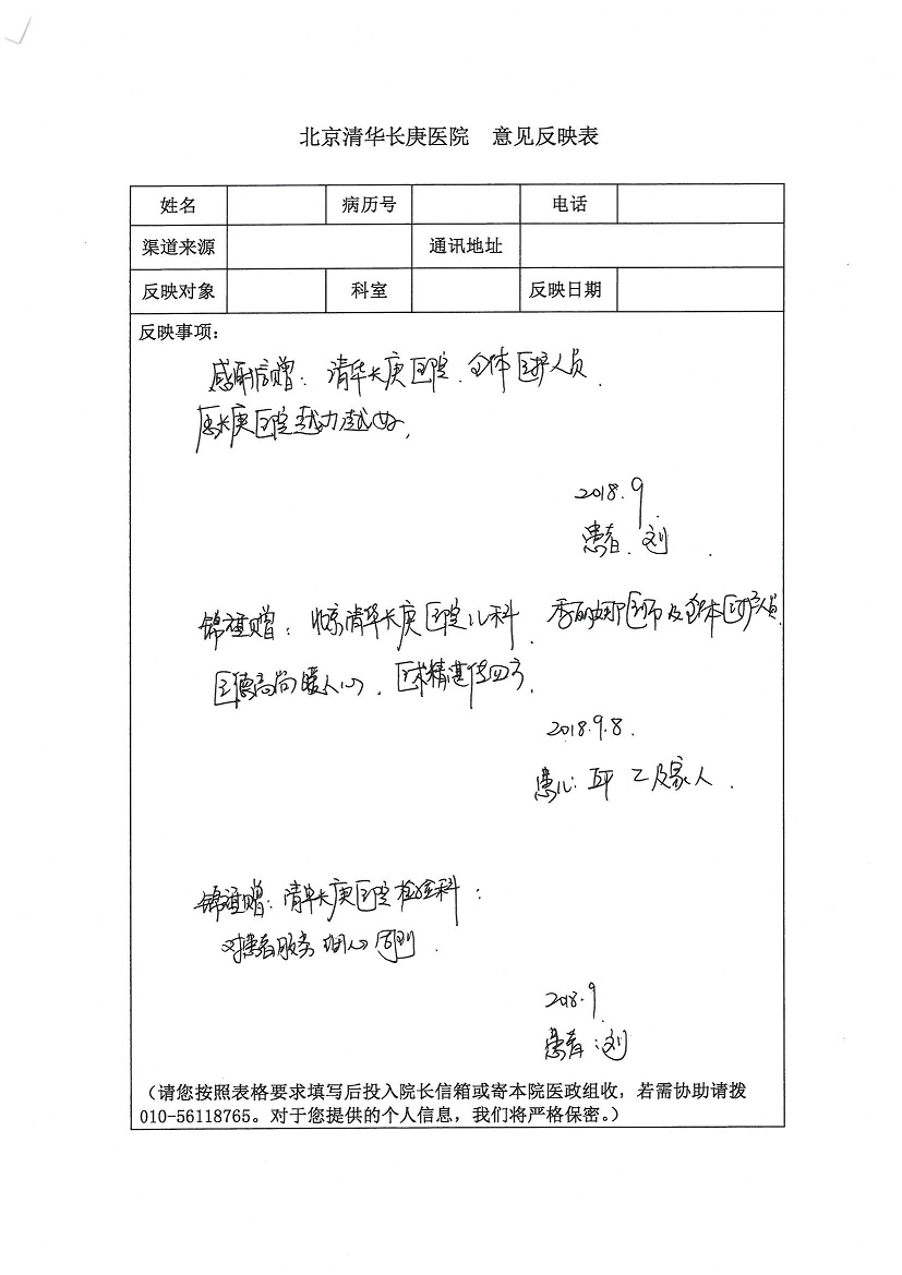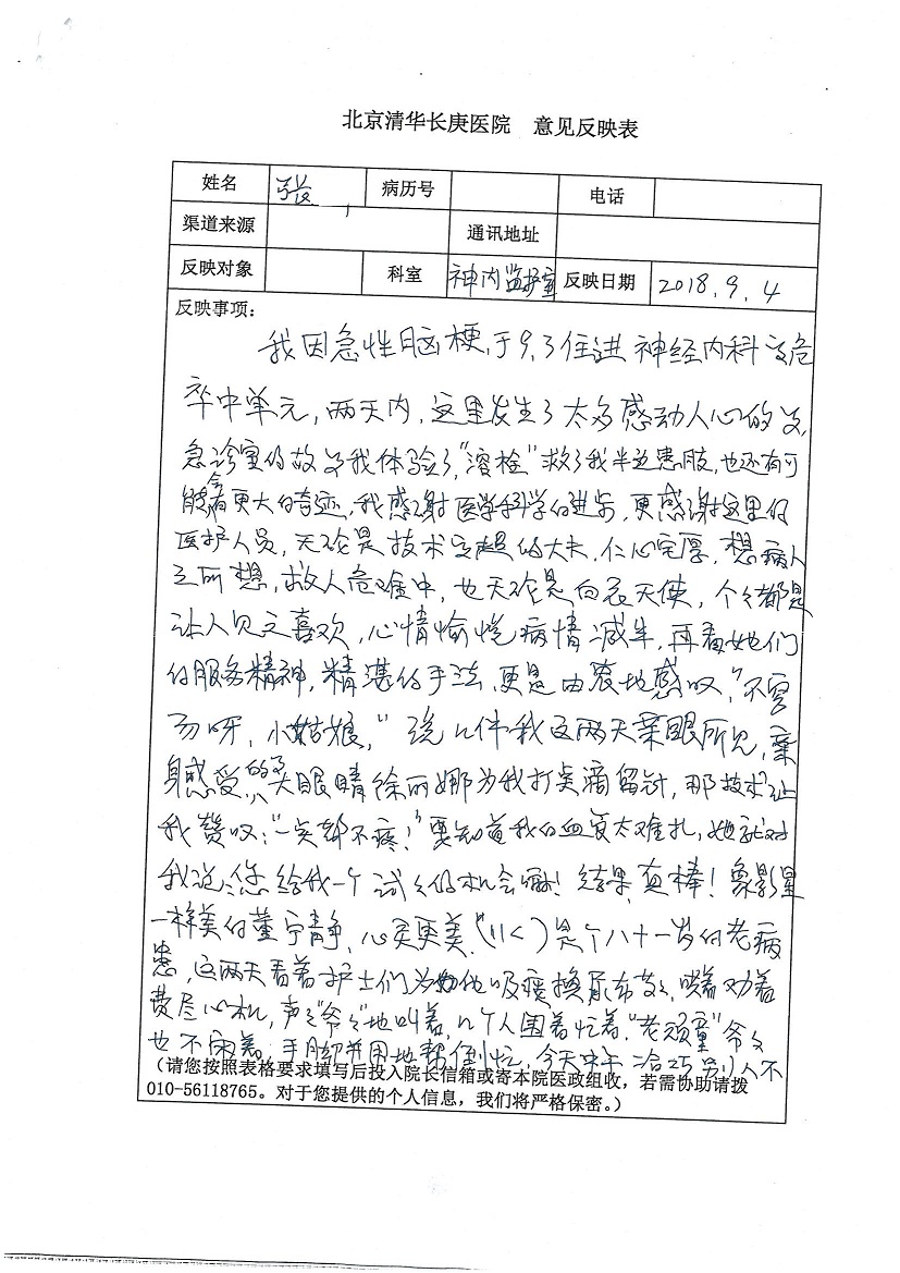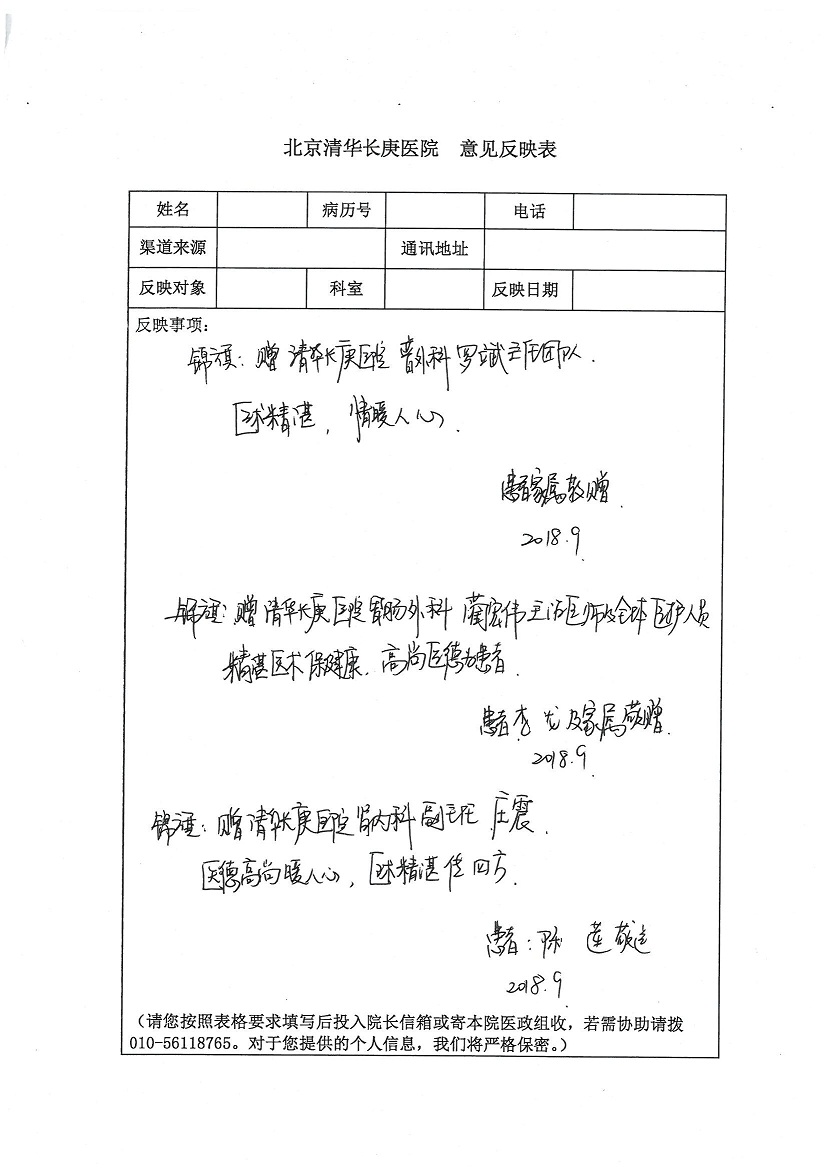 2018年9月我院共接到患者及家属感谢信56封,其中耳鼻咽喉头颈外科胡斌主治医师、尹国平主治医师、曲玥医师,妇产科廖秦平主任医师,肝胆胰外科董家鸿主任医师、卢倩副主任医师、韩东冬副主任医师、杨世忠副主任医师、汤睿主治医师、公磊主治医师、李昂医师、张新静医师、李易津医师、廖梦娇医师、尹杰医师、黄鑫医师、李小雯医师,肝胆胰介入科张琳副主任医师,骨科宋飞副主任医师,血液肿瘤科于卓副主任医师、黄月华主治医师、于凡主治医师、王燕婴主治医师、李婧娴医师,心脏内科缪国斌主任医师、王伟民主任医师、李艳芳主任医师、何榕副主任医师、刘元伟副主任医师、佘飞副主任医师、薛亚军主治医师、周杰医师、赵兰婷医师、王银堂医师、张鸥医师,急诊科张向阳主任医师、王非主治医师、徐婷医师、宋琳琳医师、张鹏书医师、马士程医师、龚晓杰医师,心脏外科沈冬焱副主任医师、李永超医师,儿科季丽娜主任医师,康复医学科潘钰主任医师,口腔科聂小汉主治医师、蒲媛医师,泌尿外科李建兴主任医师、胡卫国副主任医师、陈松副主任医师、唐禹哲医师、吉晓琳医师、王强医师,皮肤科赵邑主任医师,神经内科张小峰主治医师,神经外科王贵怀主任医师、刘东康医师、乌尤图医师、董生医师,胃肠外科李元新主任医师、蔺宏伟副主任医师、刘伯涛主治医师,消化内科王佳主治医师,眼科司山成主治医师、宋丹医师,整形外科杨建民主任医师,临床药学科胡永芳主任药师,护理部林景熠、安金杰、薄艳娜、丁杰、付焕利、刘伟芳、孟娇、申姗、苏阳、宋辉辉、杨秀玉、尤欣、张莉莉、张洋洋、赵丹、赵红杰、郑林霞、周颖,郝小春,汪爱华,段中萍、孙鹤、莫晶晶、汪菲、司红艳、刘晶、程柳、赵丹、张东敬、王金华、韩允、赵雪莲、覃丽妮、郝云茹、张晓晶、徐丽娜、董宁静、徐宁、吴月坤、管琦、刘天玉、李杰,王迎春、周欣彤、闫威、肖江彬、李艳梅、冯天宇、麻晓虎、刘忠涛、周晓雪、付秋菊、鲁欣、王翰婷、杜蓉、余培杰、王佳诗、李伟伟、张磊、张会芳,放射科崔宸,康复治疗师严红松、苏胜民,器官移植协调员郝华媛,医事处刘艳凤、刘达,总务处秦淑华收到具名表扬。特此公告,以资鼓励!