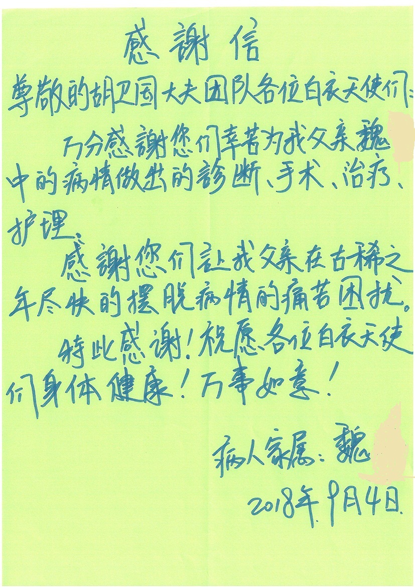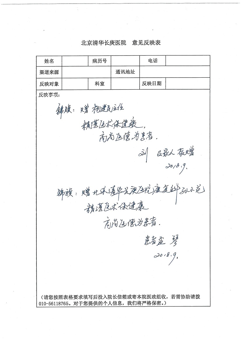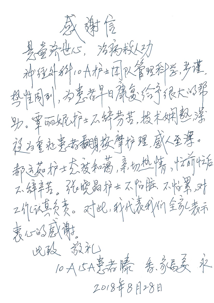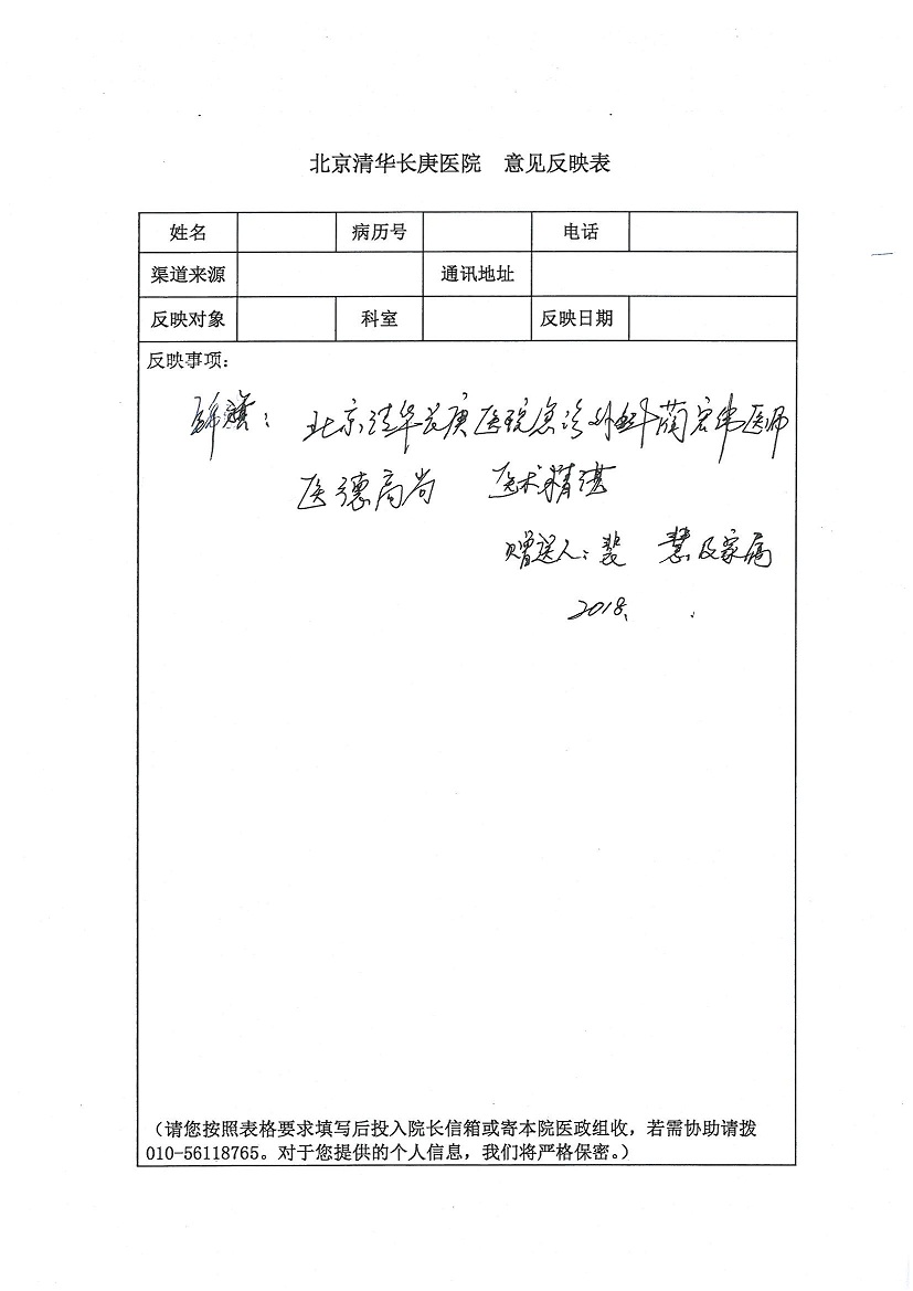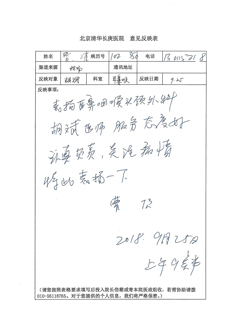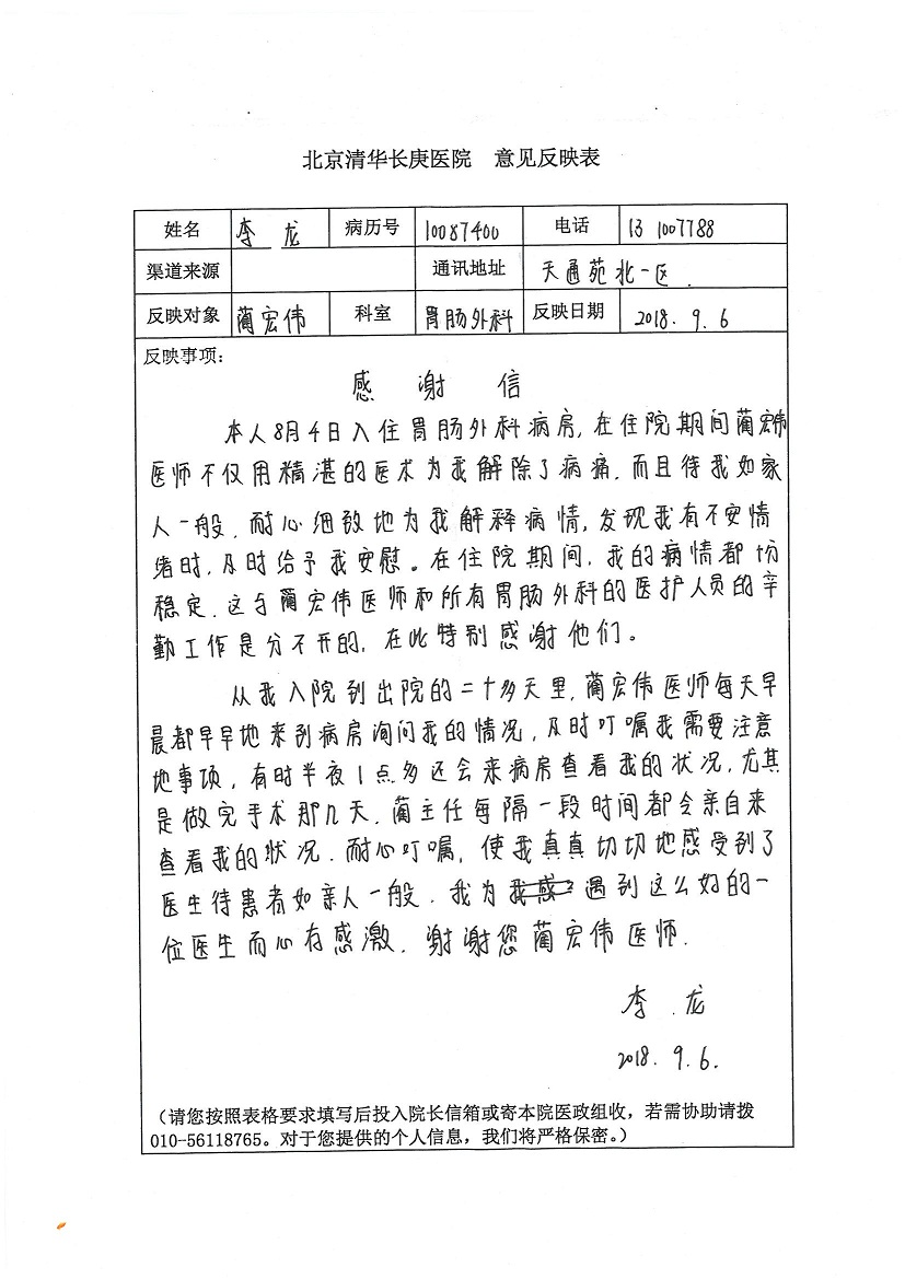 2018年9月我院共接到患者及家属感谢信56封,其中耳鼻咽喉头颈外科胡斌主治医师、尹国平主治医师、曲玥医师,妇产科廖秦平主任医师,肝胆胰外科董家鸿主任医师、卢倩副主任医师、韩东冬副主任医师、杨世忠副主任医师、汤睿主治医师、公磊主治医师、李昂医师、张新静医师、李易津医师、廖梦娇医师、尹杰医师、黄鑫医师、李小雯医师,肝胆胰介入科张琳副主任医师,骨科宋飞副主任医师,血液肿瘤科于卓副主任医师、黄月华主治医师、于凡主治医师、王燕婴主治医师、李婧娴医师,心脏内科缪国斌主任医师、王伟民主任医师、李艳芳主任医师、何榕副主任医师、刘元伟副主任医师、佘飞副主任医师、薛亚军主治医师、周杰医师、赵兰婷医师、王银堂医师、张鸥医师,急诊科张向阳主任医师、王非主治医师、徐婷医师、宋琳琳医师、张鹏书医师、马士程医师、龚晓杰医师,心脏外科沈冬焱副主任医师、李永超医师,儿科季丽娜主任医师,康复医学科潘钰主任医师,口腔科聂小汉主治医师、蒲媛医师,泌尿外科李建兴主任医师、胡卫国副主任医师、陈松副主任医师、唐禹哲医师、吉晓琳医师、王强医师,皮肤科赵邑主任医师,神经内科张小峰主治医师,神经外科王贵怀主任医师、刘东康医师、乌尤图医师、董生医师,胃肠外科李元新主任医师、蔺宏伟副主任医师、刘伯涛主治医师,消化内科王佳主治医师,眼科司山成主治医师、宋丹医师,整形外科杨建民主任医师,临床药学科胡永芳主任药师,护理部林景熠、安金杰、薄艳娜、丁杰、付焕利、刘伟芳、孟娇、申姗、苏阳、宋辉辉、杨秀玉、尤欣、张莉莉、张洋洋、赵丹、赵红杰、郑林霞、周颖,郝小春,汪爱华,段中萍、孙鹤、莫晶晶、汪菲、司红艳、刘晶、程柳、赵丹、张东敬、王金华、韩允、赵雪莲、覃丽妮、郝云茹、张晓晶、徐丽娜、董宁静、徐宁、吴月坤、管琦、刘天玉、李杰,王迎春、周欣彤、闫威、肖江彬、李艳梅、冯天宇、麻晓虎、刘忠涛、周晓雪、付秋菊、鲁欣、王翰婷、杜蓉、余培杰、王佳诗、李伟伟、张磊、张会芳,放射科崔宸,康复治疗师严红松、苏胜民,器官移植协调员郝华媛,医事处刘艳凤、刘达,总务处秦淑华收到具名表扬。特此公告,以资鼓励!