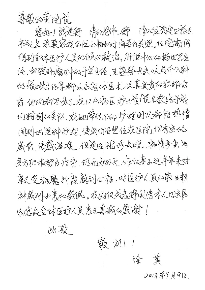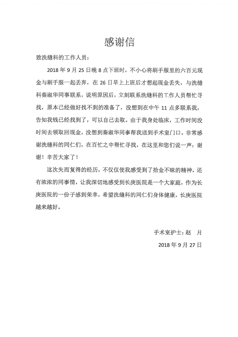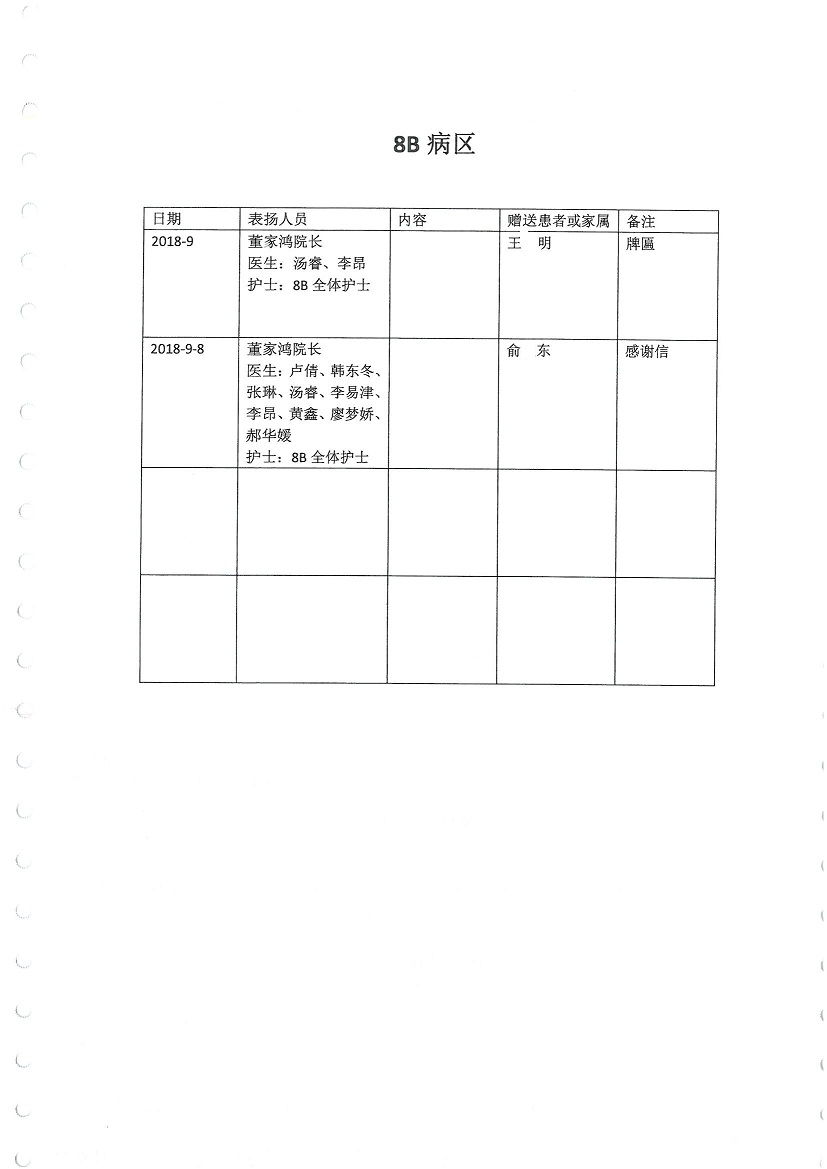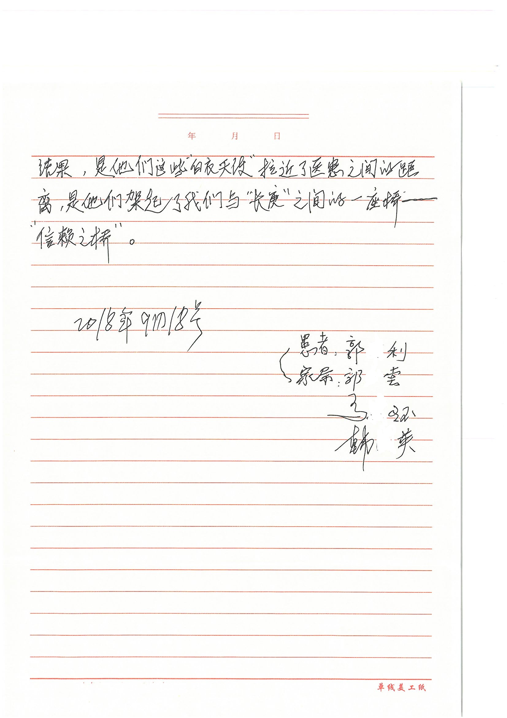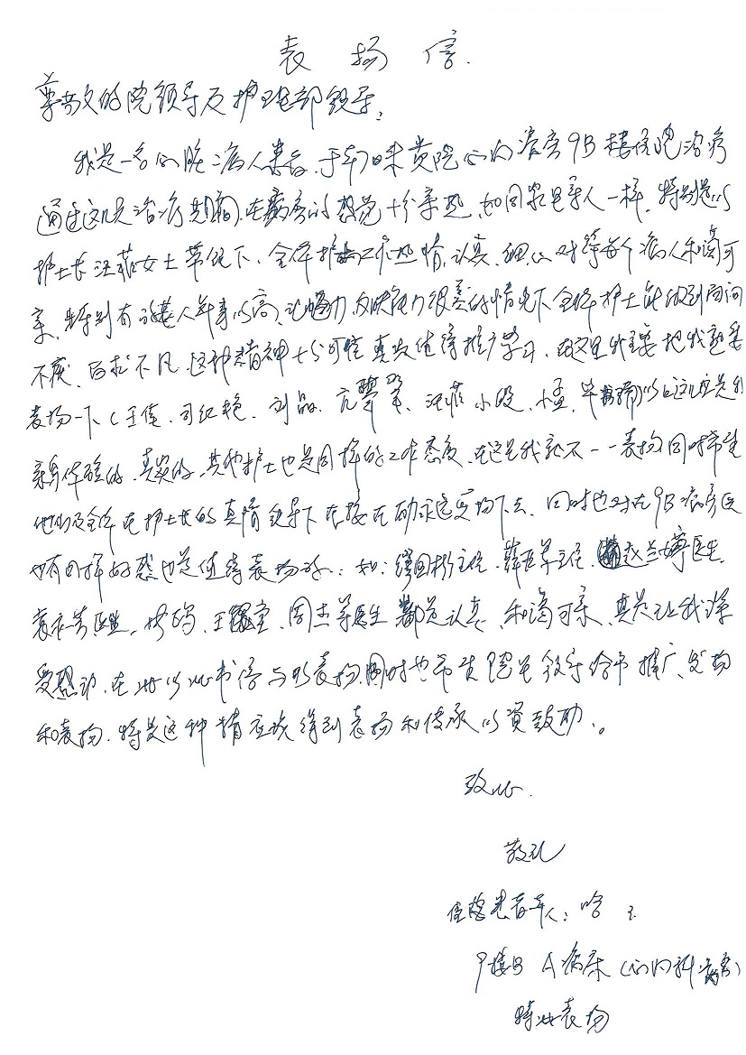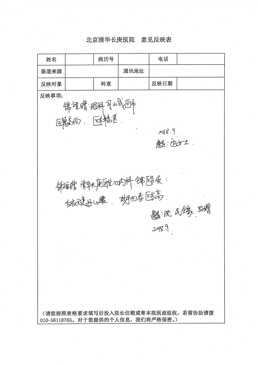 2018年9月我院共接到患者及家属感谢信56封,其中耳鼻咽喉头颈外科胡斌主治医师、尹国平主治医师、曲玥医师,妇产科廖秦平主任医师,肝胆胰外科董家鸿主任医师、卢倩副主任医师、韩东冬副主任医师、杨世忠副主任医师、汤睿主治医师、公磊主治医师、李昂医师、张新静医师、李易津医师、廖梦娇医师、尹杰医师、黄鑫医师、李小雯医师,肝胆胰介入科张琳副主任医师,骨科宋飞副主任医师,血液肿瘤科于卓副主任医师、黄月华主治医师、于凡主治医师、王燕婴主治医师、李婧娴医师,心脏内科缪国斌主任医师、王伟民主任医师、李艳芳主任医师、何榕副主任医师、刘元伟副主任医师、佘飞副主任医师、薛亚军主治医师、周杰医师、赵兰婷医师、王银堂医师、张鸥医师,急诊科张向阳主任医师、王非主治医师、徐婷医师、宋琳琳医师、张鹏书医师、马士程医师、龚晓杰医师,心脏外科沈冬焱副主任医师、李永超医师,儿科季丽娜主任医师,康复医学科潘钰主任医师,口腔科聂小汉主治医师、蒲媛医师,泌尿外科李建兴主任医师、胡卫国副主任医师、陈松副主任医师、唐禹哲医师、吉晓琳医师、王强医师,皮肤科赵邑主任医师,神经内科张小峰主治医师,神经外科王贵怀主任医师、刘东康医师、乌尤图医师、董生医师,胃肠外科李元新主任医师、蔺宏伟副主任医师、刘伯涛主治医师,消化内科王佳主治医师,眼科司山成主治医师、宋丹医师,整形外科杨建民主任医师,临床药学科胡永芳主任药师,护理部林景熠、安金杰、薄艳娜、丁杰、付焕利、刘伟芳、孟娇、申姗、苏阳、宋辉辉、杨秀玉、尤欣、张莉莉、张洋洋、赵丹、赵红杰、郑林霞、周颖,郝小春,汪爱华,段中萍、孙鹤、莫晶晶、汪菲、司红艳、刘晶、程柳、赵丹、张东敬、王金华、韩允、赵雪莲、覃丽妮、郝云茹、张晓晶、徐丽娜、董宁静、徐宁、吴月坤、管琦、刘天玉、李杰,王迎春、周欣彤、闫威、肖江彬、李艳梅、冯天宇、麻晓虎、刘忠涛、周晓雪、付秋菊、鲁欣、王翰婷、杜蓉、余培杰、王佳诗、李伟伟、张磊、张会芳,放射科崔宸,康复治疗师严红松、苏胜民,器官移植协调员郝华媛,医事处刘艳凤、刘达,总务处秦淑华收到具名表扬。特此公告,以资鼓励!