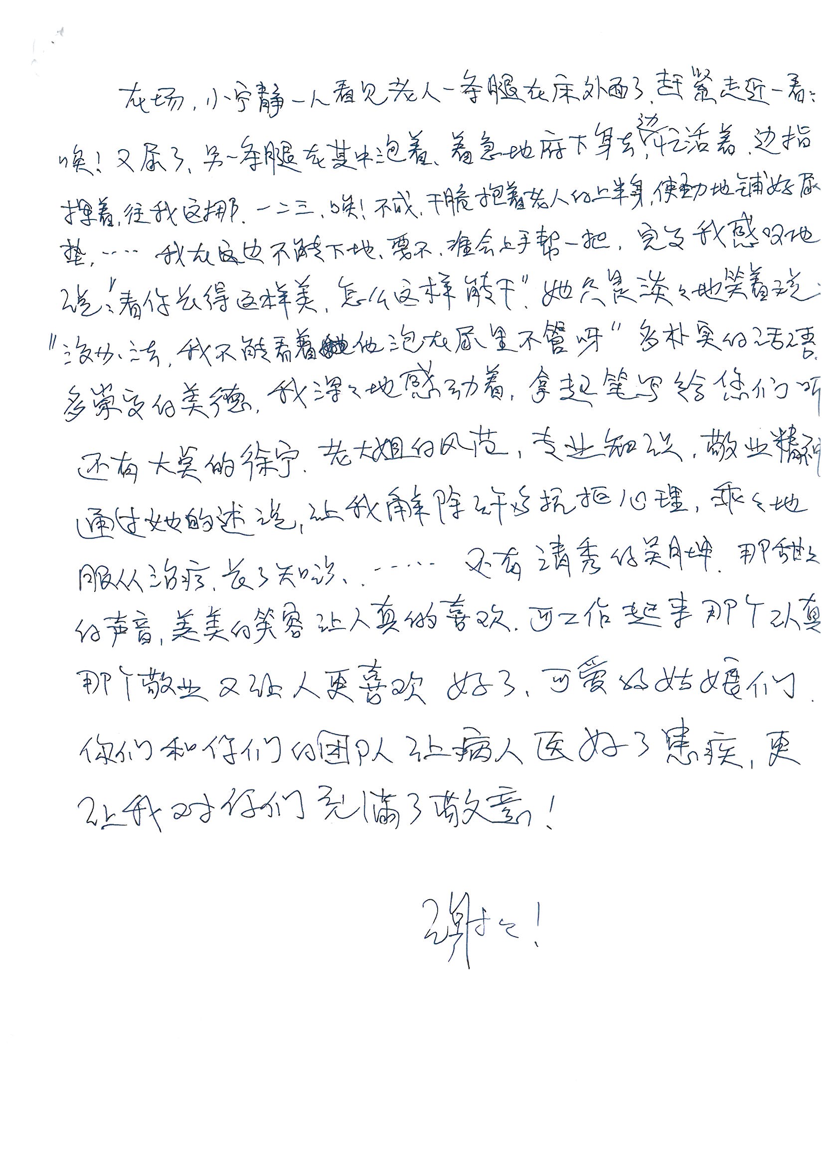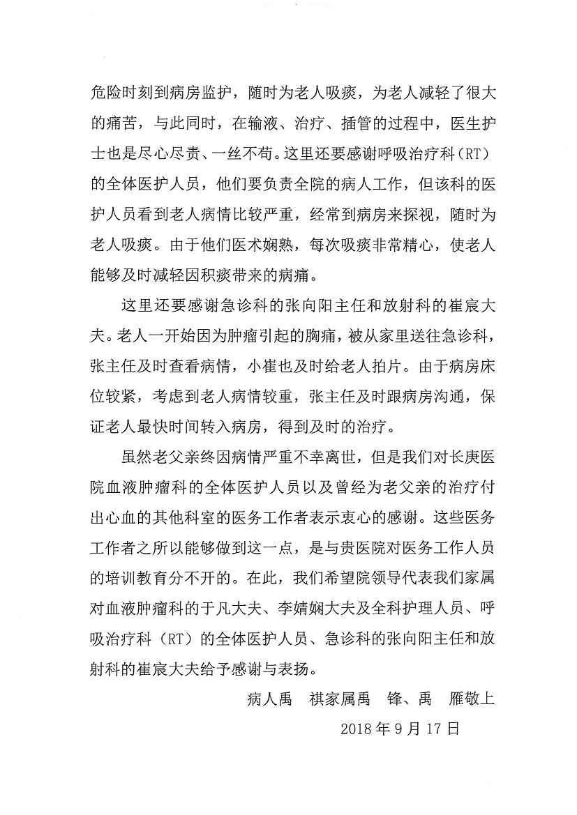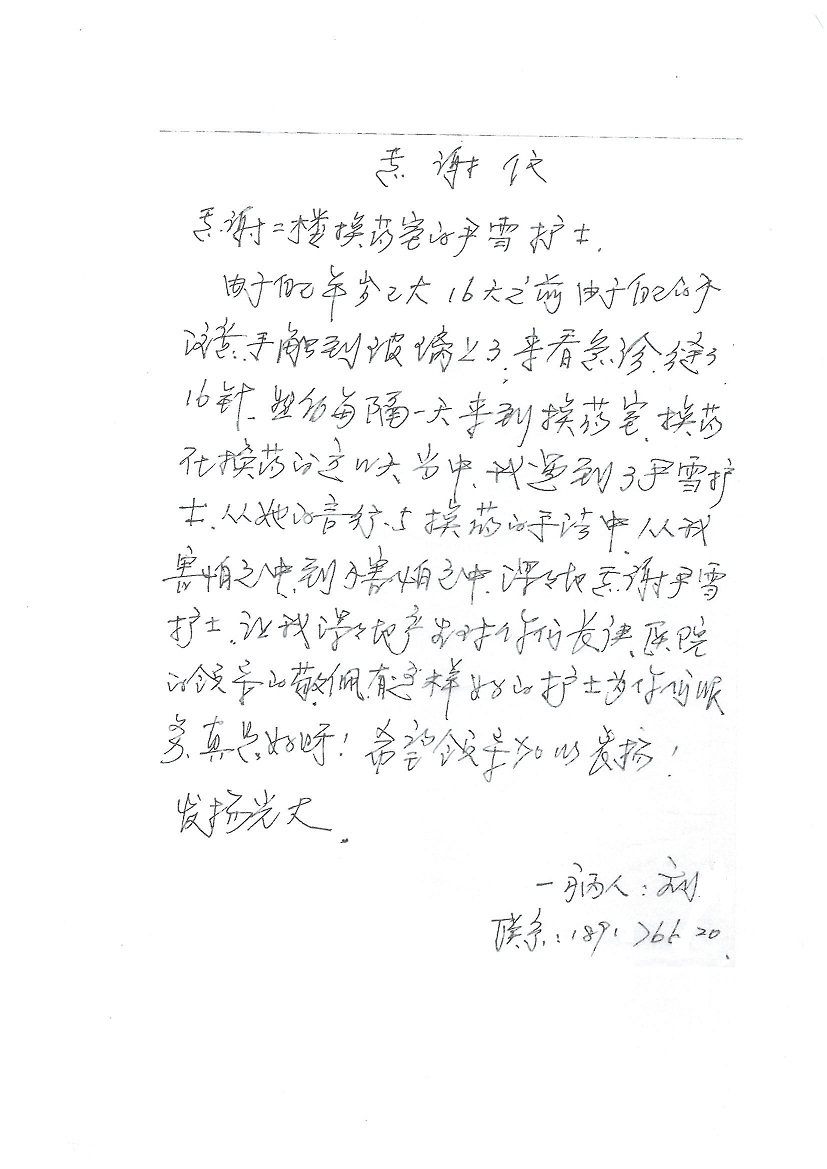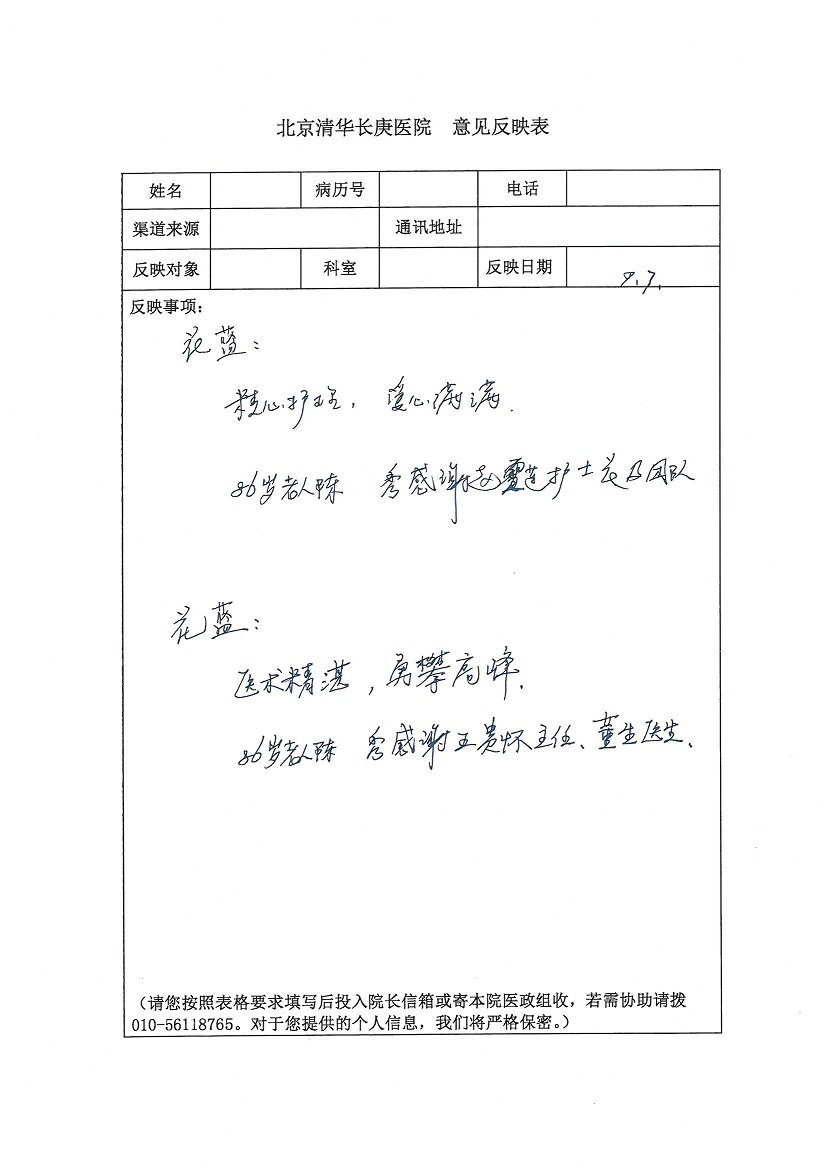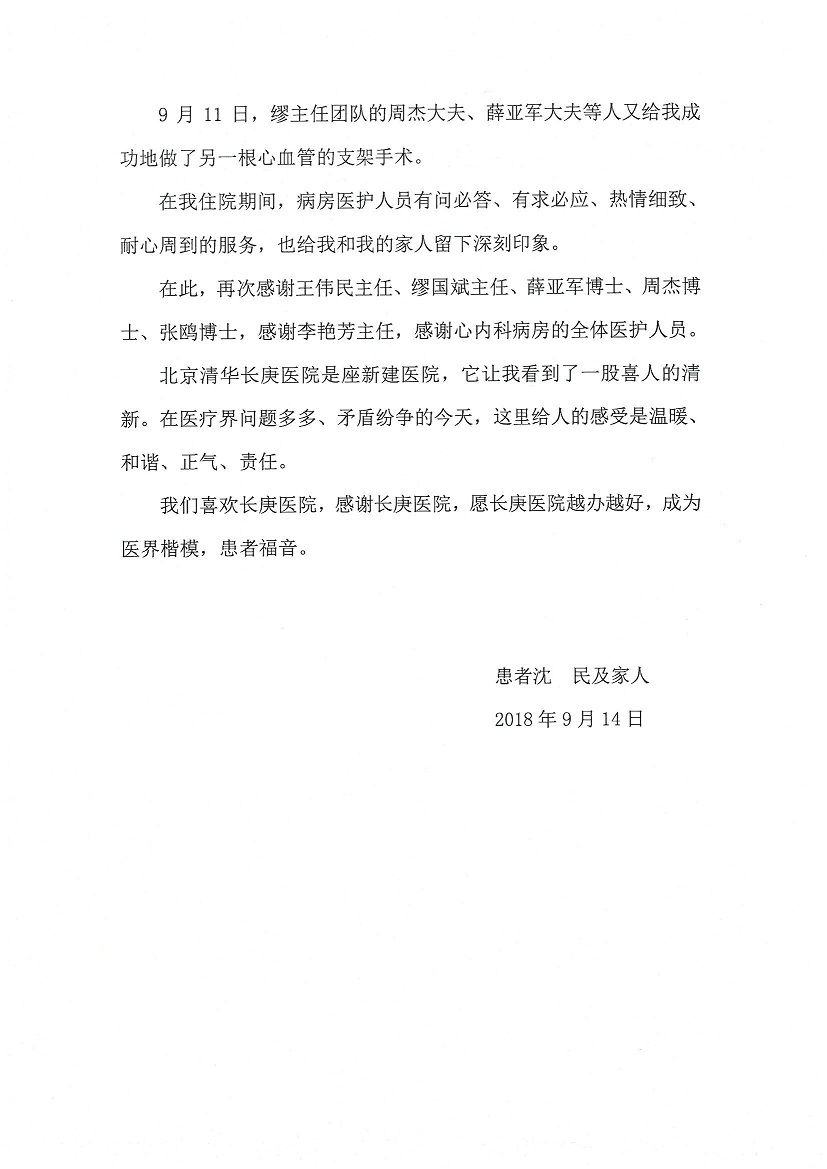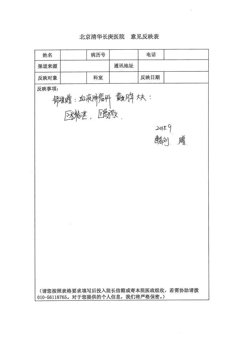 2018年9月我院共接到患者及家属感谢信56封,其中耳鼻咽喉头颈外科胡斌主治医师、尹国平主治医师、曲玥医师,妇产科廖秦平主任医师,肝胆胰外科董家鸿主任医师、卢倩副主任医师、韩东冬副主任医师、杨世忠副主任医师、汤睿主治医师、公磊主治医师、李昂医师、张新静医师、李易津医师、廖梦娇医师、尹杰医师、黄鑫医师、李小雯医师,肝胆胰介入科张琳副主任医师,骨科宋飞副主任医师,血液肿瘤科于卓副主任医师、黄月华主治医师、于凡主治医师、王燕婴主治医师、李婧娴医师,心脏内科缪国斌主任医师、王伟民主任医师、李艳芳主任医师、何榕副主任医师、刘元伟副主任医师、佘飞副主任医师、薛亚军主治医师、周杰医师、赵兰婷医师、王银堂医师、张鸥医师,急诊科张向阳主任医师、王非主治医师、徐婷医师、宋琳琳医师、张鹏书医师、马士程医师、龚晓杰医师,心脏外科沈冬焱副主任医师、李永超医师,儿科季丽娜主任医师,康复医学科潘钰主任医师,口腔科聂小汉主治医师、蒲媛医师,泌尿外科李建兴主任医师、胡卫国副主任医师、陈松副主任医师、唐禹哲医师、吉晓琳医师、王强医师,皮肤科赵邑主任医师,神经内科张小峰主治医师,神经外科王贵怀主任医师、刘东康医师、乌尤图医师、董生医师,胃肠外科李元新主任医师、蔺宏伟副主任医师、刘伯涛主治医师,消化内科王佳主治医师,眼科司山成主治医师、宋丹医师,整形外科杨建民主任医师,临床药学科胡永芳主任药师,护理部林景熠、安金杰、薄艳娜、丁杰、付焕利、刘伟芳、孟娇、申姗、苏阳、宋辉辉、杨秀玉、尤欣、张莉莉、张洋洋、赵丹、赵红杰、郑林霞、周颖,郝小春,汪爱华,段中萍、孙鹤、莫晶晶、汪菲、司红艳、刘晶、程柳、赵丹、张东敬、王金华、韩允、赵雪莲、覃丽妮、郝云茹、张晓晶、徐丽娜、董宁静、徐宁、吴月坤、管琦、刘天玉、李杰,王迎春、周欣彤、闫威、肖江彬、李艳梅、冯天宇、麻晓虎、刘忠涛、周晓雪、付秋菊、鲁欣、王翰婷、杜蓉、余培杰、王佳诗、李伟伟、张磊、张会芳,放射科崔宸,康复治疗师严红松、苏胜民,器官移植协调员郝华媛,医事处刘艳凤、刘达,总务处秦淑华收到具名表扬。特此公告,以资鼓励!
