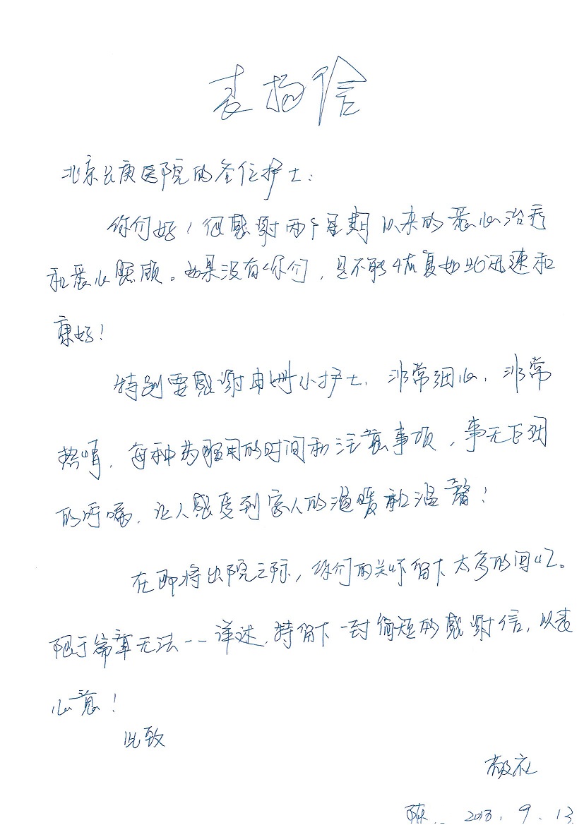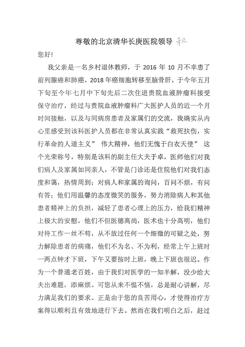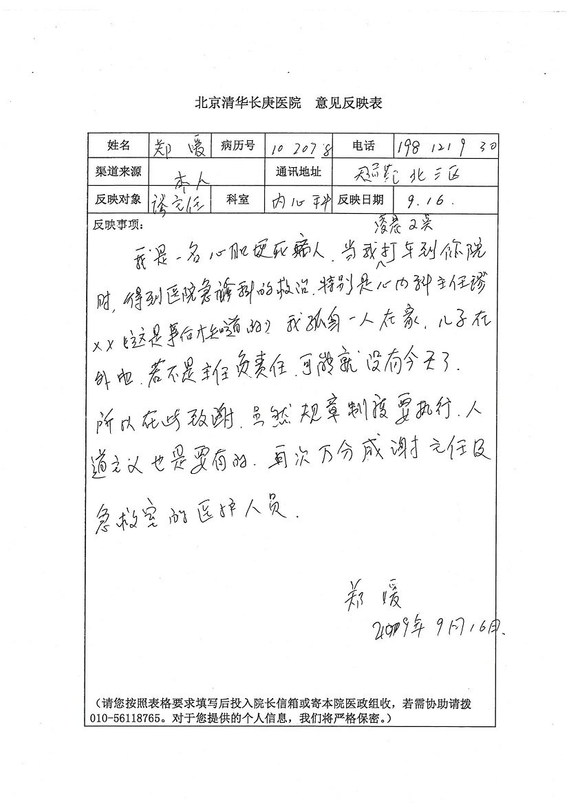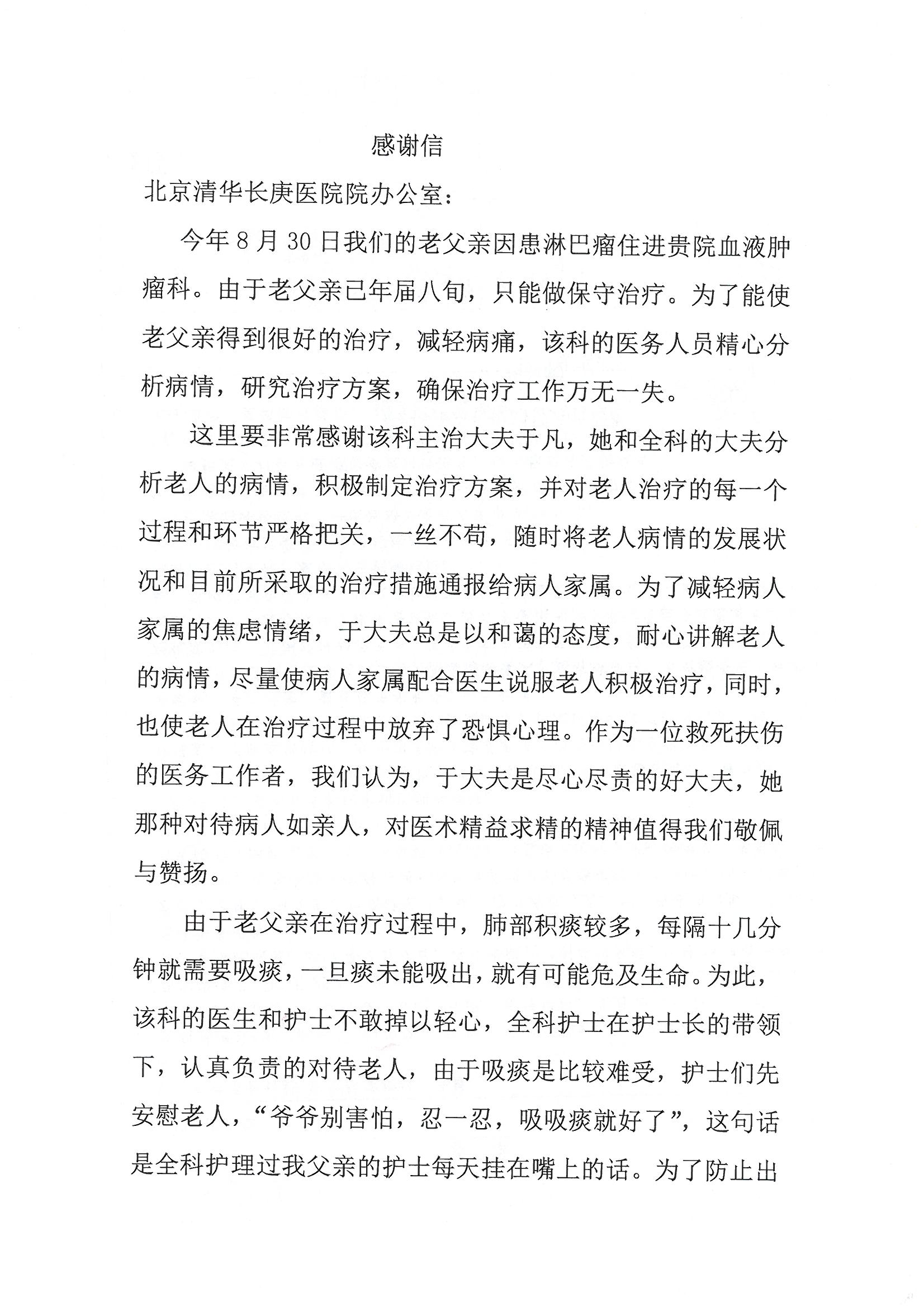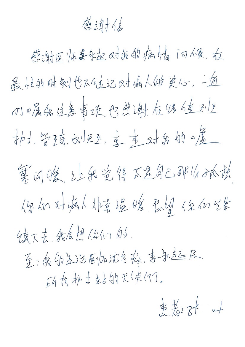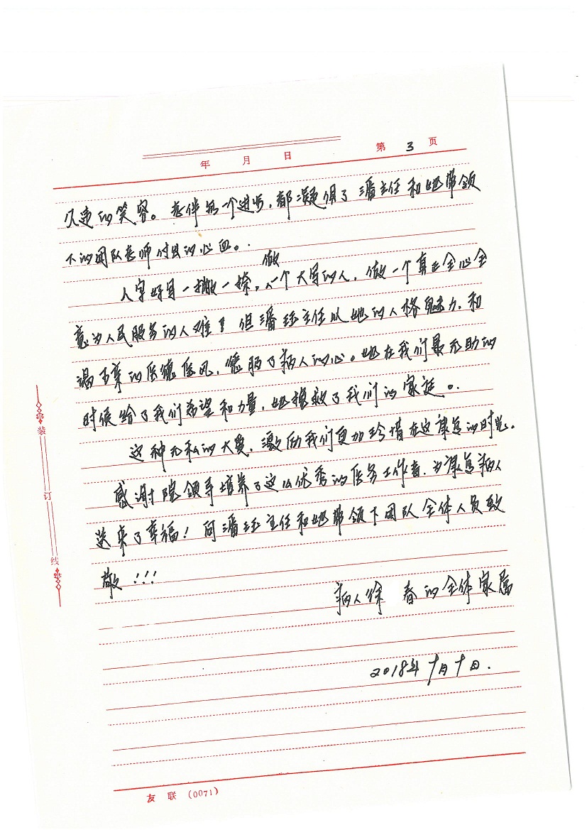 2018年9月我院共接到患者及家属感谢信56封,其中耳鼻咽喉头颈外科胡斌主治医师、尹国平主治医师、曲玥医师,妇产科廖秦平主任医师,肝胆胰外科董家鸿主任医师、卢倩副主任医师、韩东冬副主任医师、杨世忠副主任医师、汤睿主治医师、公磊主治医师、李昂医师、张新静医师、李易津医师、廖梦娇医师、尹杰医师、黄鑫医师、李小雯医师,肝胆胰介入科张琳副主任医师,骨科宋飞副主任医师,血液肿瘤科于卓副主任医师、黄月华主治医师、于凡主治医师、王燕婴主治医师、李婧娴医师,心脏内科缪国斌主任医师、王伟民主任医师、李艳芳主任医师、何榕副主任医师、刘元伟副主任医师、佘飞副主任医师、薛亚军主治医师、周杰医师、赵兰婷医师、王银堂医师、张鸥医师,急诊科张向阳主任医师、王非主治医师、徐婷医师、宋琳琳医师、张鹏书医师、马士程医师、龚晓杰医师,心脏外科沈冬焱副主任医师、李永超医师,儿科季丽娜主任医师,康复医学科潘钰主任医师,口腔科聂小汉主治医师、蒲媛医师,泌尿外科李建兴主任医师、胡卫国副主任医师、陈松副主任医师、唐禹哲医师、吉晓琳医师、王强医师,皮肤科赵邑主任医师,神经内科张小峰主治医师,神经外科王贵怀主任医师、刘东康医师、乌尤图医师、董生医师,胃肠外科李元新主任医师、蔺宏伟副主任医师、刘伯涛主治医师,消化内科王佳主治医师,眼科司山成主治医师、宋丹医师,整形外科杨建民主任医师,临床药学科胡永芳主任药师,护理部林景熠、安金杰、薄艳娜、丁杰、付焕利、刘伟芳、孟娇、申姗、苏阳、宋辉辉、杨秀玉、尤欣、张莉莉、张洋洋、赵丹、赵红杰、郑林霞、周颖,郝小春,汪爱华,段中萍、孙鹤、莫晶晶、汪菲、司红艳、刘晶、程柳、赵丹、张东敬、王金华、韩允、赵雪莲、覃丽妮、郝云茹、张晓晶、徐丽娜、董宁静、徐宁、吴月坤、管琦、刘天玉、李杰,王迎春、周欣彤、闫威、肖江彬、李艳梅、冯天宇、麻晓虎、刘忠涛、周晓雪、付秋菊、鲁欣、王翰婷、杜蓉、余培杰、王佳诗、李伟伟、张磊、张会芳,放射科崔宸,康复治疗师严红松、苏胜民,器官移植协调员郝华媛,医事处刘艳凤、刘达,总务处秦淑华收到具名表扬。特此公告,以资鼓励!
