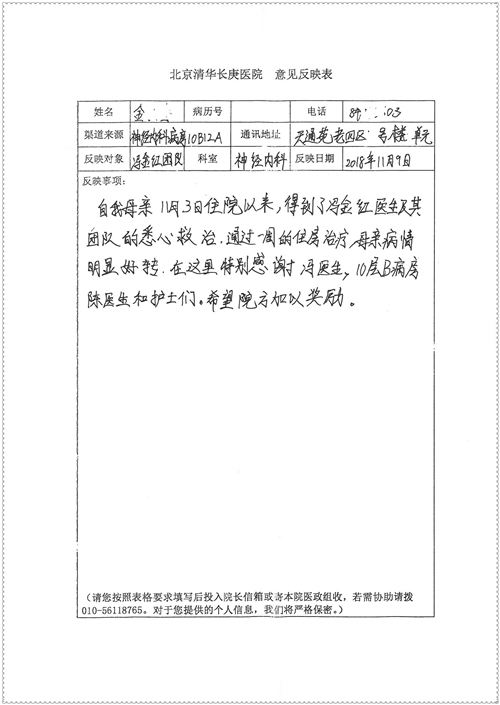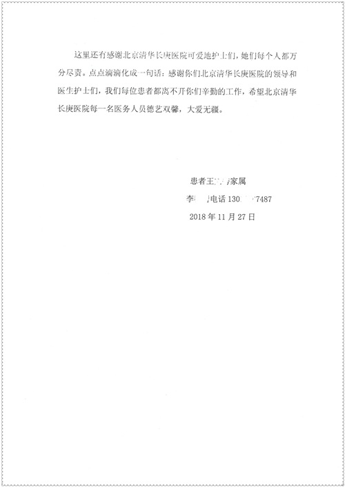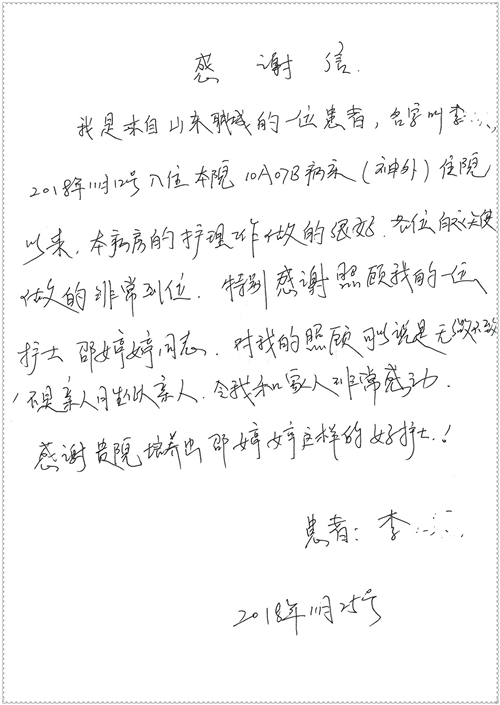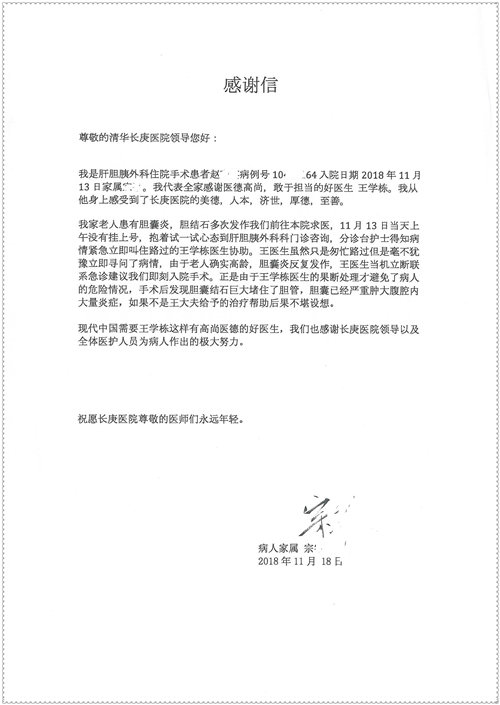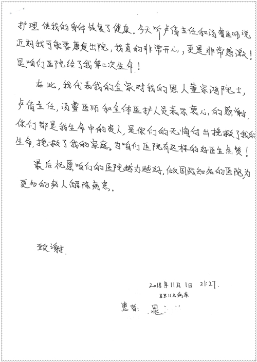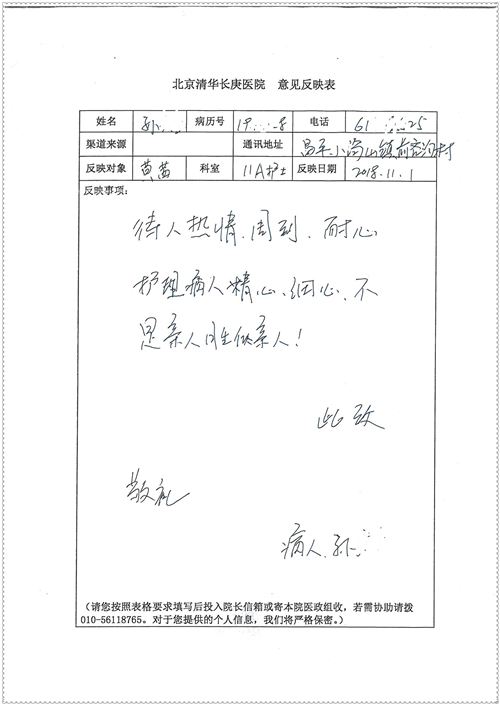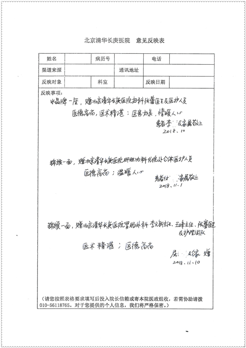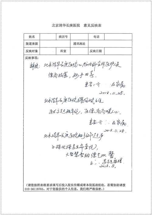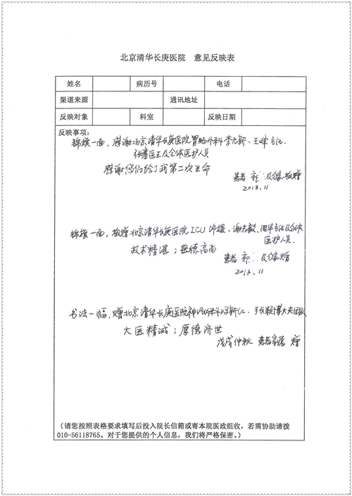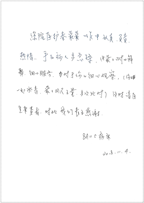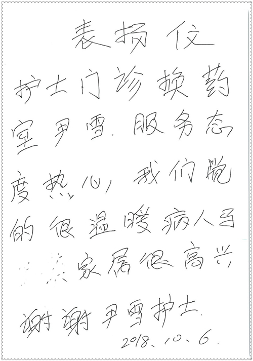 2018年11月,我院共接到患者及家属感谢信75封,其中肝胆胰外科董家鸿主任医师、卢倩副主任医师、汤睿主治医师、王学栋主治医师、李昂医师、李易津医师、李鹏医师,神经外科王贵怀主任医师、姜除寒主任医师、梁士凯医师、刘东康医师,普通外科郭丽婧主治医师,胃肠外科李元新主任医师、王峰副主任医师、蔺宏伟副主任医师、张骞主治医师、刘伯涛主治医师,骨科肖嵩华主任医师、刘华玮主治医师,泌尿外科李建兴主任医师、陈松副主任医师、胡卫国副主任医师、王强副主任医师,心脏内科缪国斌主任医师、佘飞副主任医师、薛亚军主治医师,神经内科冯新红副主任医师、张菁副主任医师、张颖博医师,肾脏内科庄震副主任医师,消化内科唐红卫主任医师、相马宁主任医师、任渝棠主治医师、王佳主治医师、郭晓娟医师、王瑞刚医师,肝胆内科黄缘主任医师,血液肿瘤内科黄月华主治医师,妇产科张蕾副主任医师、刘瑛主治医师,康复科张丽春,皮肤科蒋源副主任医师、舒丹主治医师、周毅辉医师,眼科刘瑄副主任医师,中医科秦建婷医师,ICU许媛主任医师、谢志毅副主任医师、周华副主任医师,检验科赵志鹏,医事处刘嘉然、闪迪,护理部李硕、孔宇佳、位莎、张莎、徐瑞、管琦、赵杰、樊景春、辛扬眉、赵宝晶、刘翚、邵婷婷、李慧、秦蒙蒙、赵雪莲、田静静、郝运茹、覃丽妮、朱绍红、王鑫、尹雪、徐丽娜、李慧敏,8B全体护士以及肝胆内科、ICU、肾脏内科、临床药学科、妇产科全体医护人员收到具名表扬。特此公告,以资鼓励!
