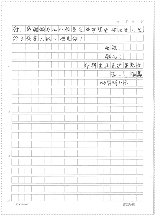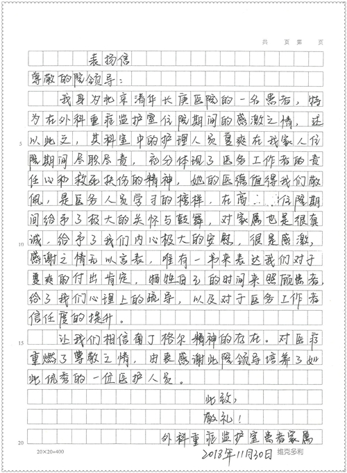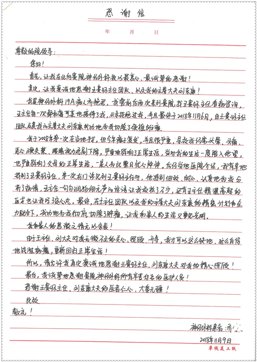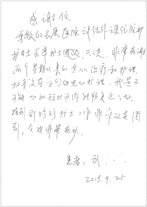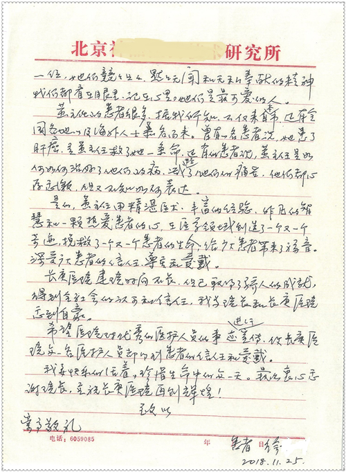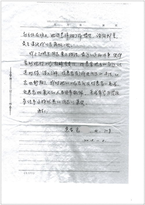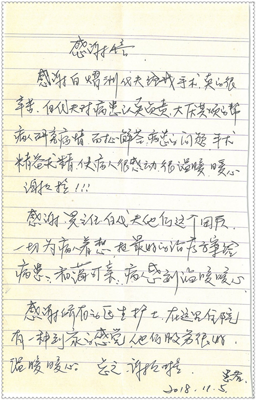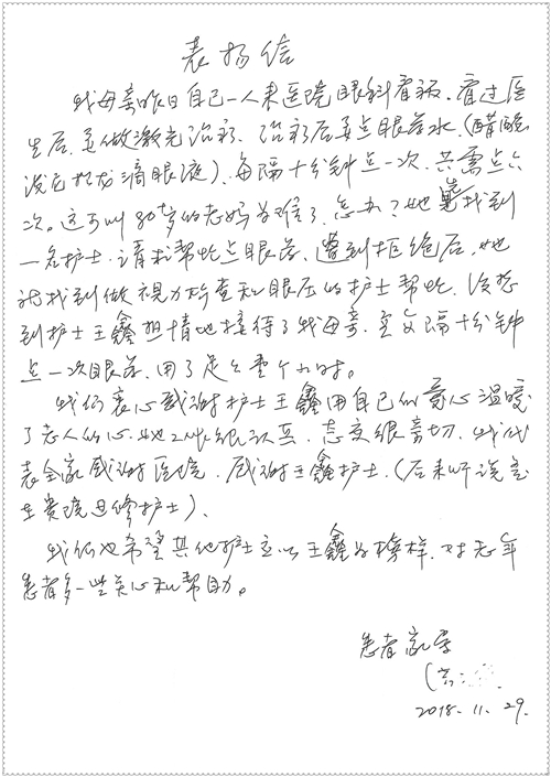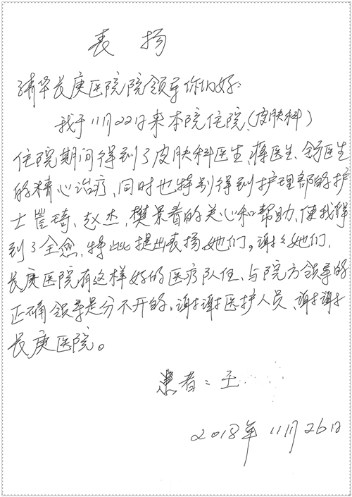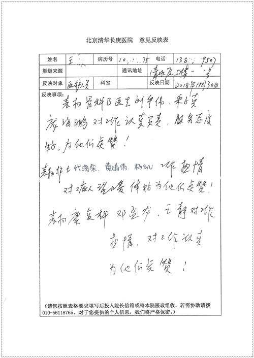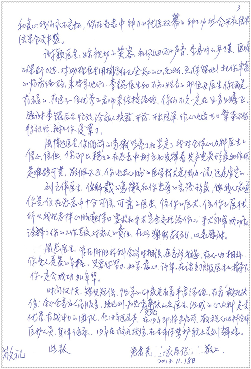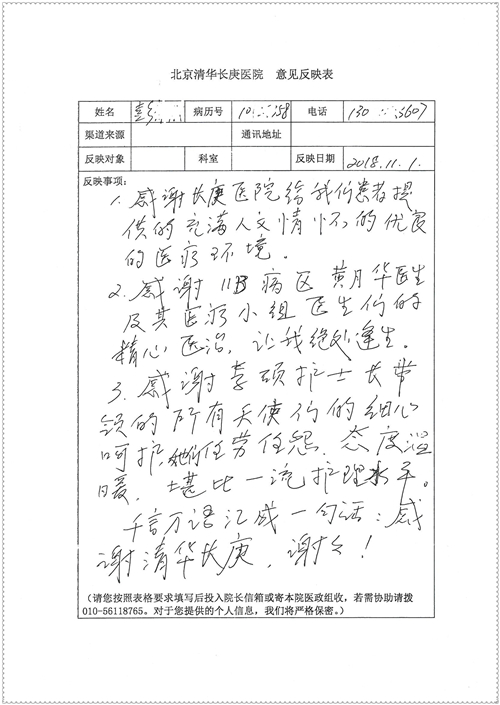 2018年11月,我院共接到患者及家属感谢信75封,其中肝胆胰外科董家鸿主任医师、卢倩副主任医师、汤睿主治医师、王学栋主治医师、李昂医师、李易津医师、李鹏医师,神经外科王贵怀主任医师、姜除寒主任医师、梁士凯医师、刘东康医师,普通外科郭丽婧主治医师,胃肠外科李元新主任医师、王峰副主任医师、蔺宏伟副主任医师、张骞主治医师、刘伯涛主治医师,骨科肖嵩华主任医师、刘华玮主治医师,泌尿外科李建兴主任医师、陈松副主任医师、胡卫国副主任医师、王强副主任医师,心脏内科缪国斌主任医师、佘飞副主任医师、薛亚军主治医师,神经内科冯新红副主任医师、张菁副主任医师、张颖博医师,肾脏内科庄震副主任医师,消化内科唐红卫主任医师、相马宁主任医师、任渝棠主治医师、王佳主治医师、郭晓娟医师、王瑞刚医师,肝胆内科黄缘主任医师,血液肿瘤内科黄月华主治医师,妇产科张蕾副主任医师、刘瑛主治医师,康复科张丽春,皮肤科蒋源副主任医师、舒丹主治医师、周毅辉医师,眼科刘瑄副主任医师,中医科秦建婷医师,ICU许媛主任医师、谢志毅副主任医师、周华副主任医师,检验科赵志鹏,医事处刘嘉然、闪迪,护理部李硕、孔宇佳、位莎、张莎、徐瑞、管琦、赵杰、樊景春、辛扬眉、赵宝晶、刘翚、邵婷婷、李慧、秦蒙蒙、赵雪莲、田静静、郝运茹、覃丽妮、朱绍红、王鑫、尹雪、徐丽娜、李慧敏,8B全体护士以及肝胆内科、ICU、肾脏内科、临床药学科、妇产科全体医护人员收到具名表扬。特此公告,以资鼓励!