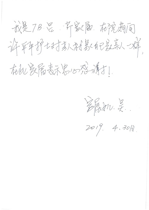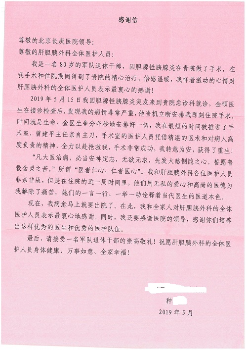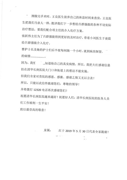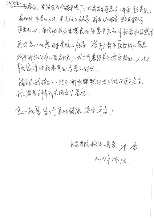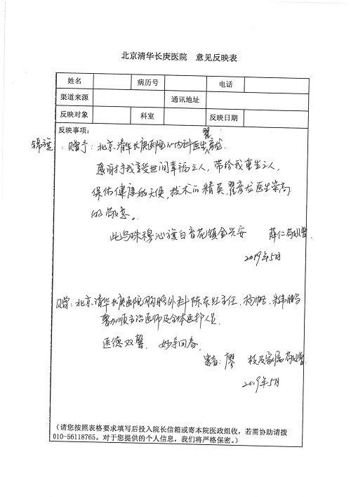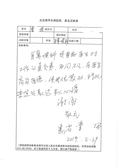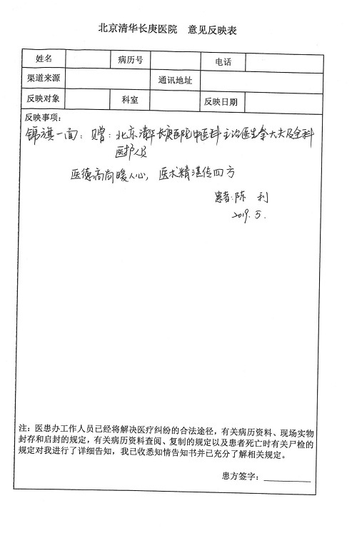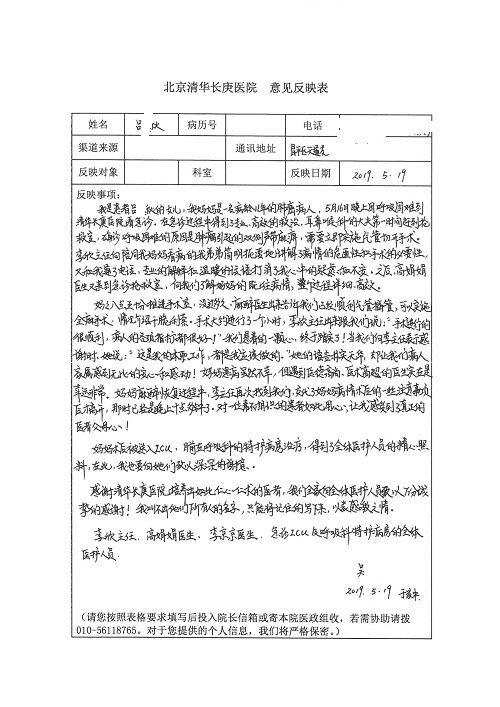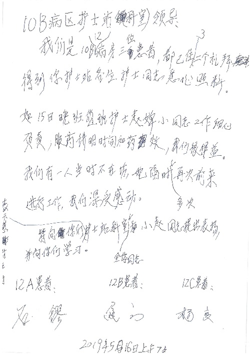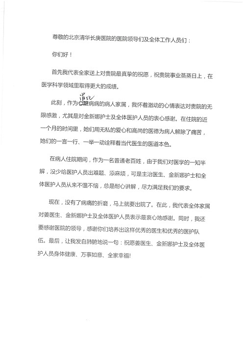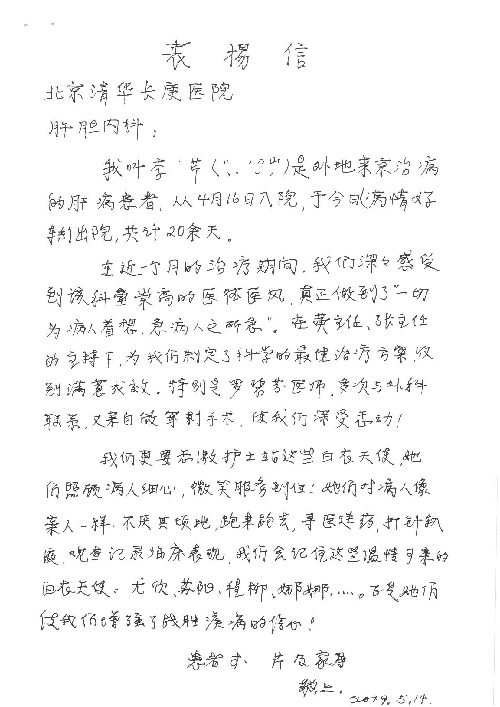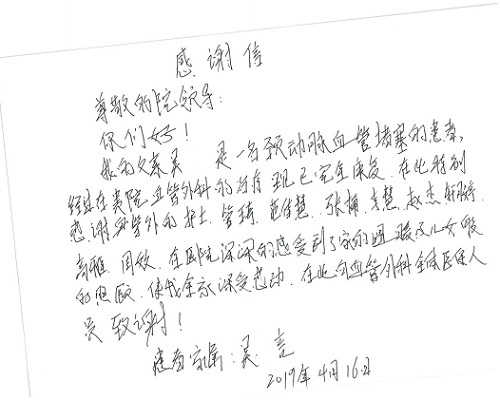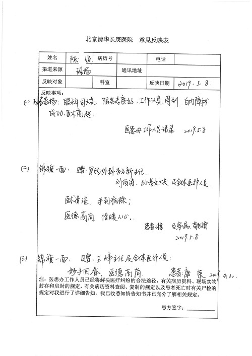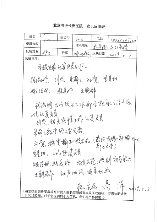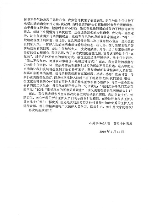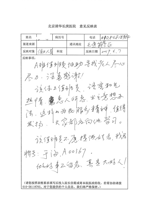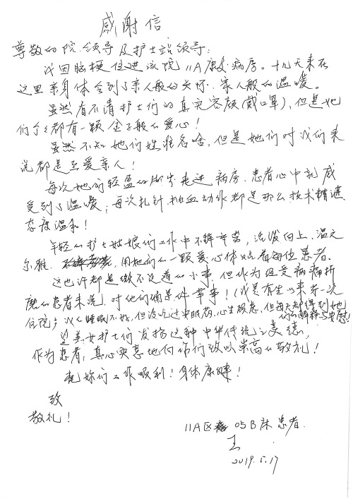 2019年5月,我院共接到患者及家属感谢信61封,其中肝胆胰外科董家鸿主任医师、项灿宏主任医师、曾建平副主任医师、王良主治医师、金烁医师,肝胆介入科张跃伟主任医师,肝胆内科黄缘主任医师、罗碧芬主治医师,神经外科王劲主任医师、王贵怀主任医师、郭毅主任医师、刘东康医师,神经内科武剑主任医师、冯新红副主任医师、张小峰主治医师,胃肠外科李元新主任医师、王峰副主任医师、张鹏主治医师、刘伯涛主治医师、孙孝文主治医师、张骞主治医师、马天翼医师,胸前外科陈东红副主任医师、杨帆主治医师、朱伟鹏医师、曹加顺医师,骨科顾苏熙主治医师、胡冬医师,泌尿外科李建兴主任医师、肖博主治医师,心脏内科缪国斌主任医师、李艳芳主任医师、刘元伟副主任医师、何榕副主任医师、薛亚军主治医师、周博达主治医师、谢颖主治医师、乔宇医师、周杰医师、赵兰婷医师、王银堂医师、翟彦龙技师,心脏外科沈冬焱主任医师、邹鹏医师,呼吸与危重症医学科牟向东主任医师、郭军副主任医师、蔡存良主治医师、赵景全主治医师、高博医师,消化内科王佳主治医师、魏正杰医师,内分泌与代谢科严楠医师,血管外科赵俊来主治医师,血液肿瘤科黄月华主治医师、庄先静医生,康复医学科潘钰主任医师、吴琼主治医师、徐泉主治医师、付莉莉、严红松、孙小花、白玉冬、马丽娜、张丽春,眼科郭立斌副主任医师、司山成主治医师,耳鼻咽喉头颈外科李欣副主任医师、顼晋昆主治医师、曲玥主治医师、高娟娟医师、李京京医师,放射治疗科李广欣主治医师,肾脏内科李月红主任医师、李敏俠主治医师,口腔科吕娇主治医师,中医科刘承主治医师、秦建婷医师,儿科季丽娜主任医师,产科冯宗昊医师、尚梦远医师,院长办公室志愿者老师们、朱家绚老师,保卫处于海,护理部何亚惠、石晨燕、崔淑婷、刘杰、朱萌萌、孙贺、李星阳、姚洁琳、程美玲、王朝群、许平平、邵娜娜、赵禅、刘天玉、李慧、周娇、管琦、范佳慧、张楠、李慧、赵杰、轩月婷、高雅、周枚、金新娜、王翠萍、郝金荣、史金凤、尤欣、苏阳、程柳、薄艳娜、曹丽萍、李硕、韩莹、宋真真、马飞飞、王静,呼吸内科全体医护人员,胃肠外科全体医护人员,胸外科全体医护士们,血液肿瘤科护理团队,肝胆胰外科全体医护人员,神经内科全体医护人员,急诊全体医护人员收到具名表扬。特此公告,以资鼓励!