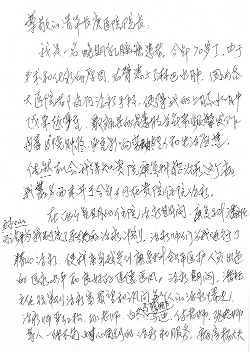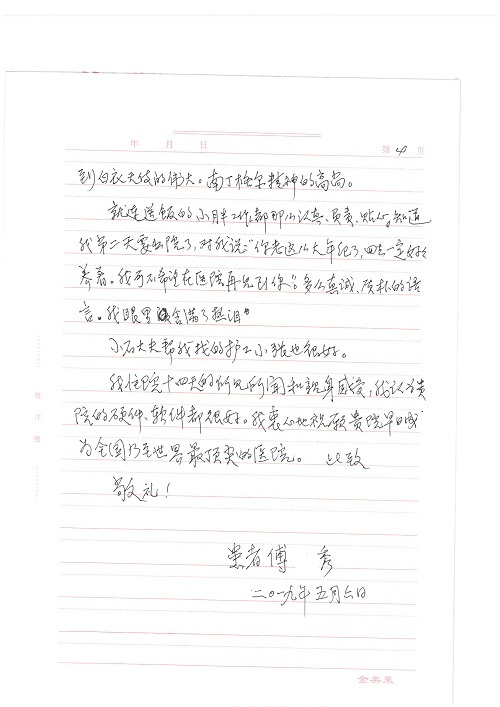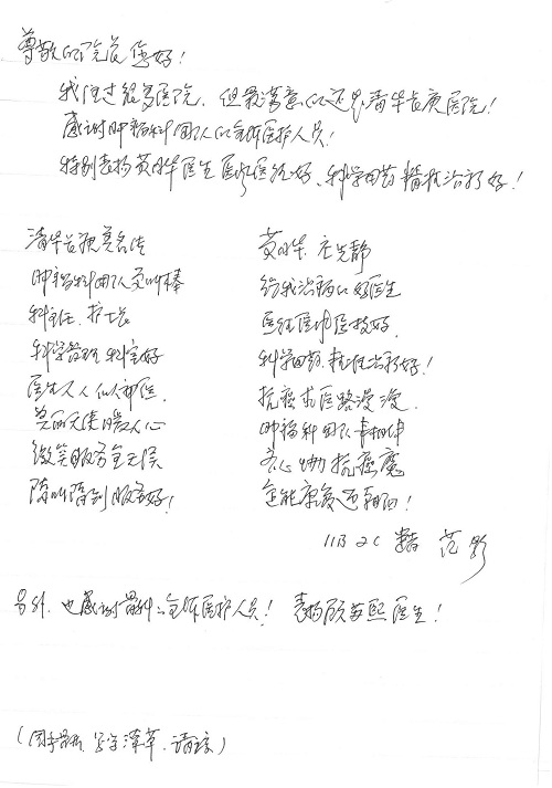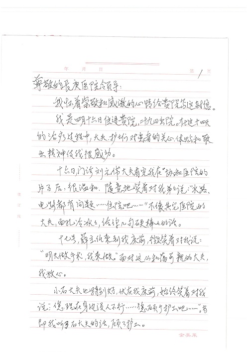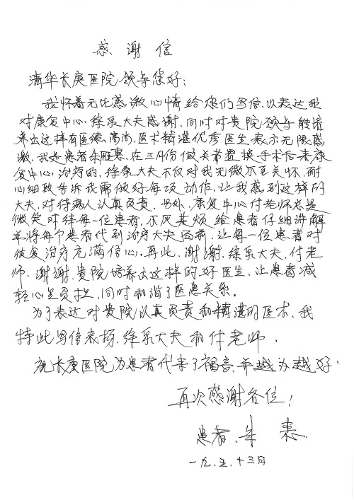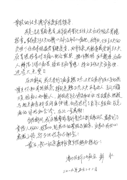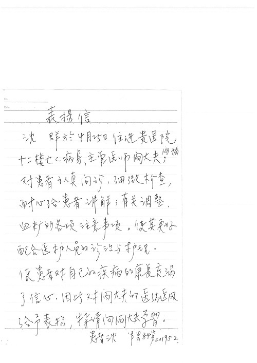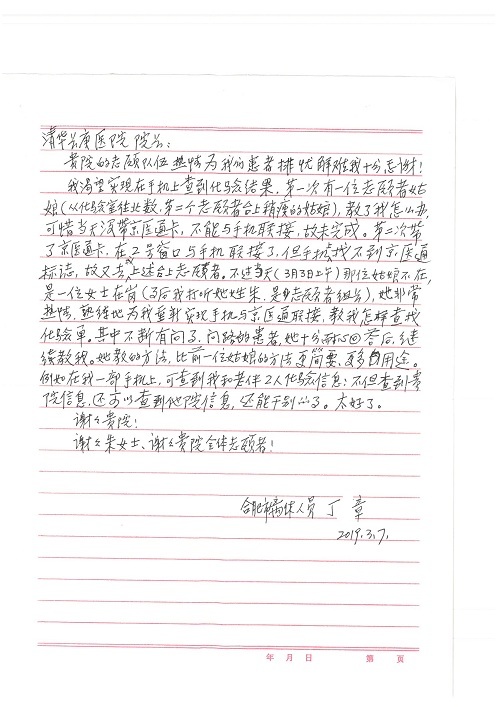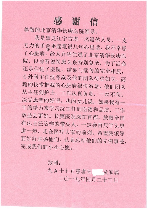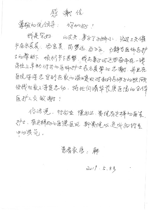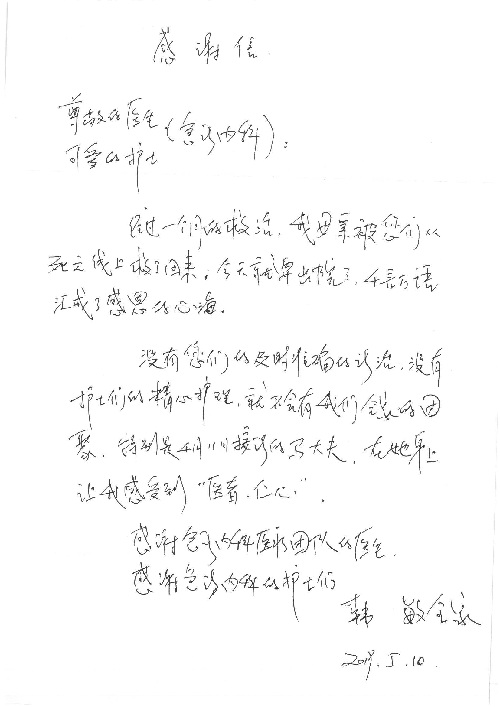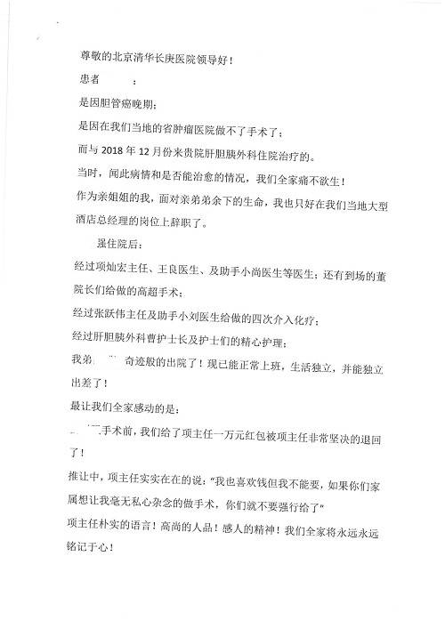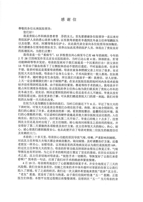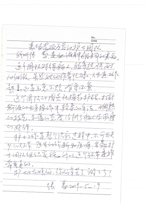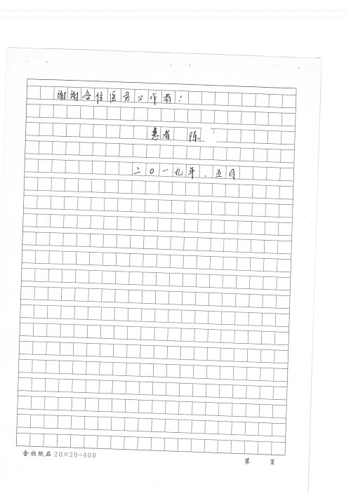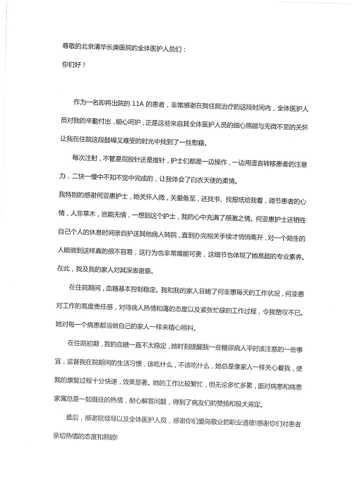 2019年5月,我院共接到患者及家属感谢信61封,其中肝胆胰外科董家鸿主任医师、项灿宏主任医师、曾建平副主任医师、王良主治医师、金烁医师,肝胆介入科张跃伟主任医师,肝胆内科黄缘主任医师、罗碧芬主治医师,神经外科王劲主任医师、王贵怀主任医师、郭毅主任医师、刘东康医师,神经内科武剑主任医师、冯新红副主任医师、张小峰主治医师,胃肠外科李元新主任医师、王峰副主任医师、张鹏主治医师、刘伯涛主治医师、孙孝文主治医师、张骞主治医师、马天翼医师,胸前外科陈东红副主任医师、杨帆主治医师、朱伟鹏医师、曹加顺医师,骨科顾苏熙主治医师、胡冬医师,泌尿外科李建兴主任医师、肖博主治医师,心脏内科缪国斌主任医师、李艳芳主任医师、刘元伟副主任医师、何榕副主任医师、薛亚军主治医师、周博达主治医师、谢颖主治医师、乔宇医师、周杰医师、赵兰婷医师、王银堂医师、翟彦龙技师,心脏外科沈冬焱主任医师、邹鹏医师,呼吸与危重症医学科牟向东主任医师、郭军副主任医师、蔡存良主治医师、赵景全主治医师、高博医师,消化内科王佳主治医师、魏正杰医师,内分泌与代谢科严楠医师,血管外科赵俊来主治医师,血液肿瘤科黄月华主治医师、庄先静医生,康复医学科潘钰主任医师、吴琼主治医师、徐泉主治医师、付莉莉、严红松、孙小花、白玉冬、马丽娜、张丽春,眼科郭立斌副主任医师、司山成主治医师,耳鼻咽喉头颈外科李欣副主任医师、顼晋昆主治医师、曲玥主治医师、高娟娟医师、李京京医师,放射治疗科李广欣主治医师,肾脏内科李月红主任医师、李敏俠主治医师,口腔科吕娇主治医师,中医科刘承主治医师、秦建婷医师,儿科季丽娜主任医师,产科冯宗昊医师、尚梦远医师,院长办公室志愿者老师们、朱家绚老师,保卫处于海,护理部何亚惠、石晨燕、崔淑婷、刘杰、朱萌萌、孙贺、李星阳、姚洁琳、程美玲、王朝群、许平平、邵娜娜、赵禅、刘天玉、李慧、周娇、管琦、范佳慧、张楠、李慧、赵杰、轩月婷、高雅、周枚、金新娜、王翠萍、郝金荣、史金凤、尤欣、苏阳、程柳、薄艳娜、曹丽萍、李硕、韩莹、宋真真、马飞飞、王静,呼吸内科全体医护人员,胃肠外科全体医护人员,胸外科全体医护士们,血液肿瘤科护理团队,肝胆胰外科全体医护人员,神经内科全体医护人员,急诊全体医护人员收到具名表扬。特此公告,以资鼓励!