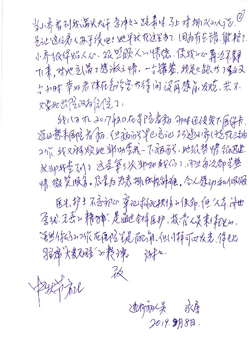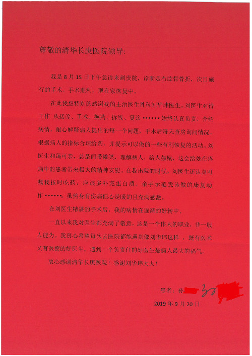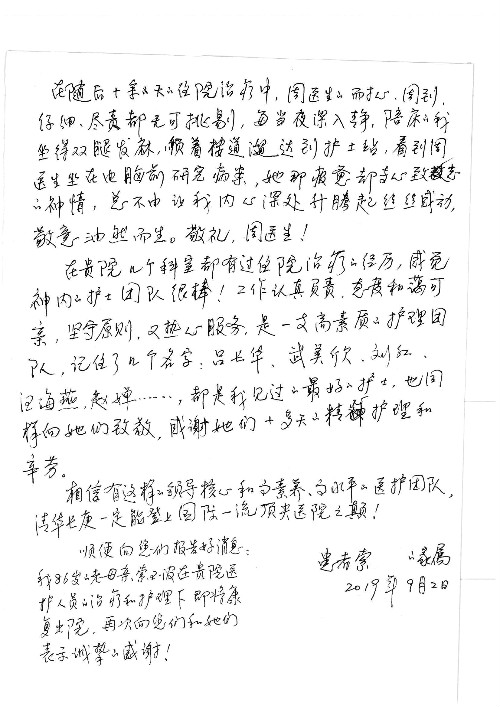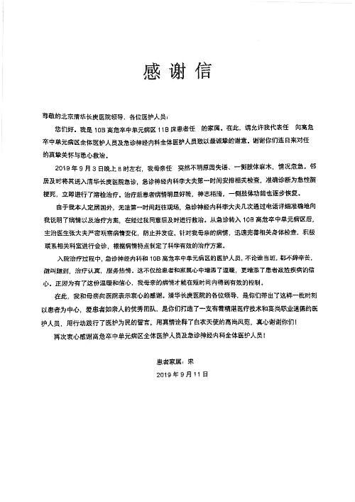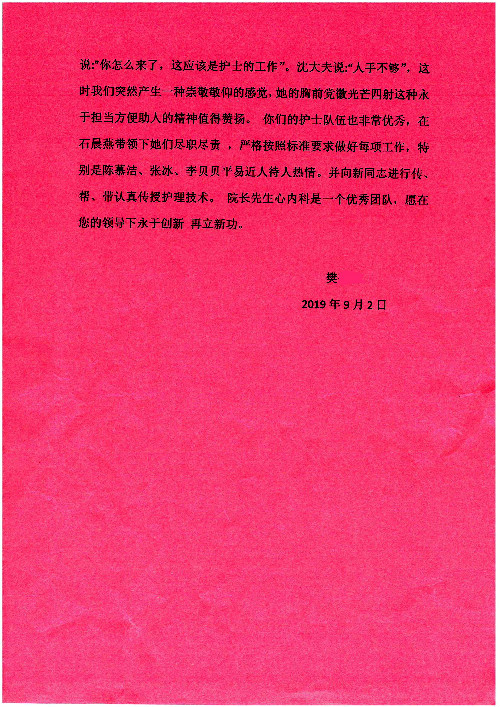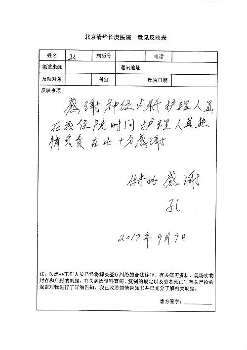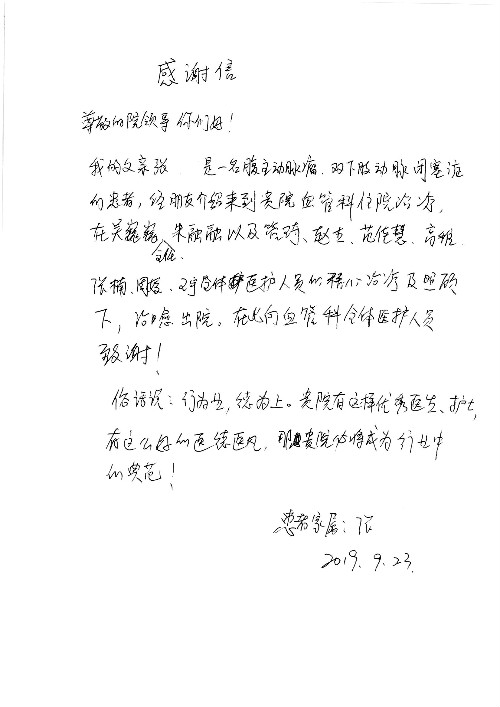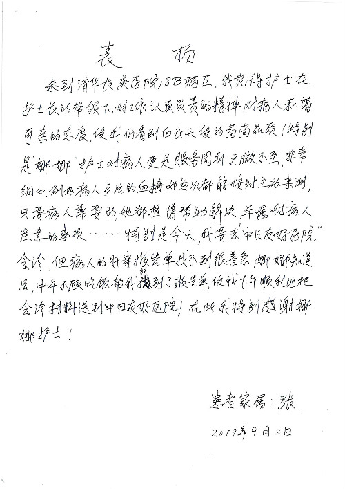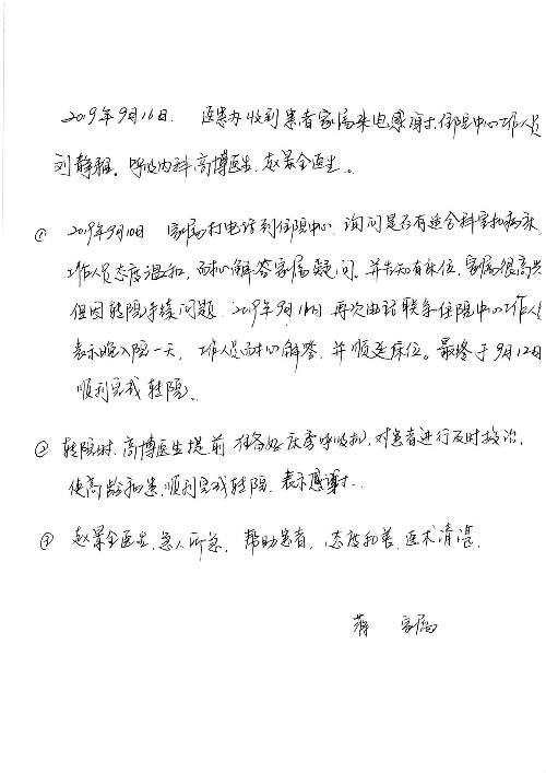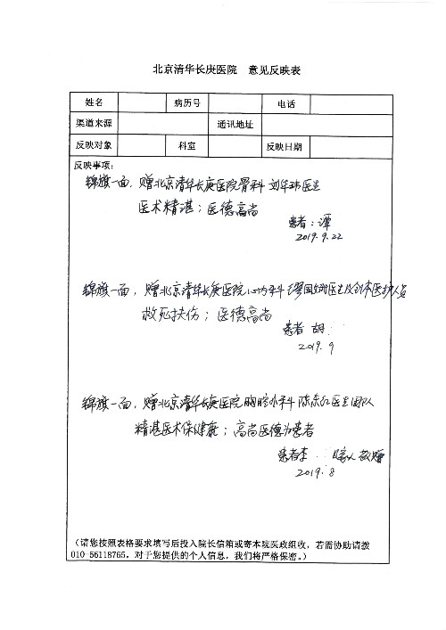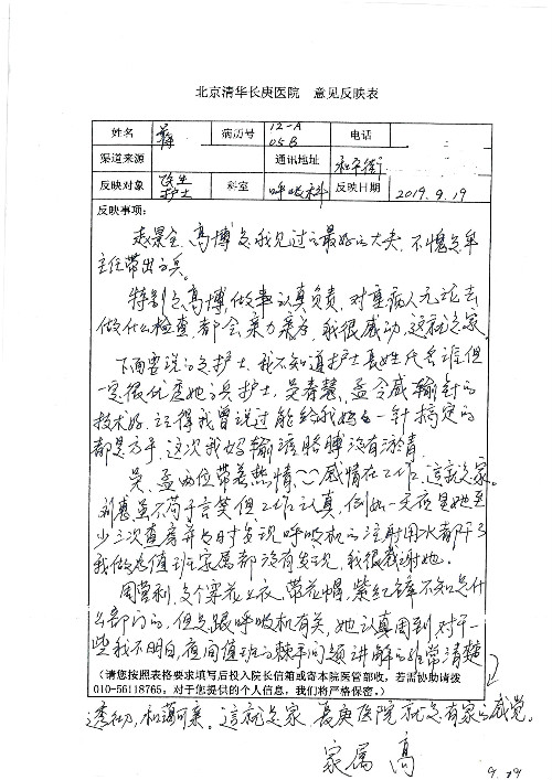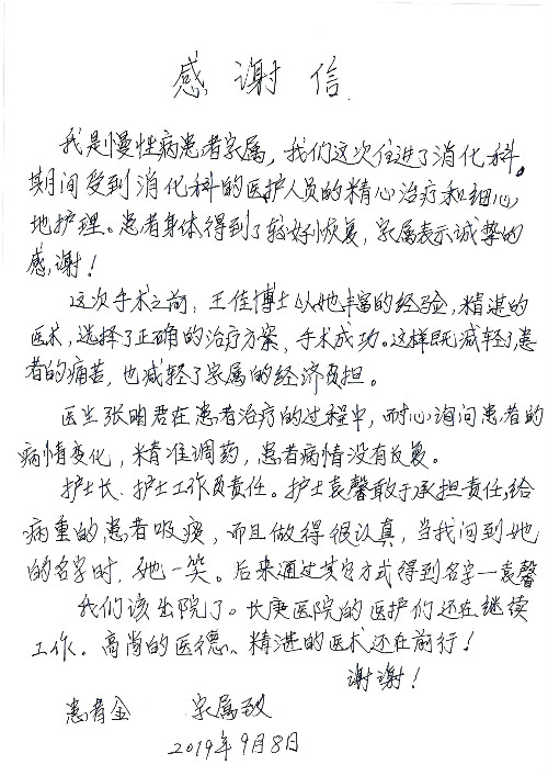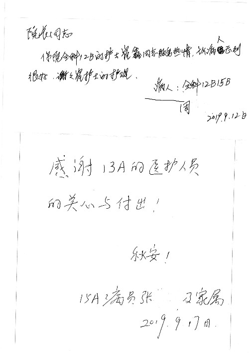 2019年9月,我院共接到患者及家属感谢信55封,锦旗31面,其中耳鼻咽喉头颈外科叶京英主任医师、伊海金主任医师、李欣副主任医师、顼晋昆主治医师,骨科肖嵩华主任医师、刘华玮主治医师,全科医学科王仲主任医师、丁磊副主任医师、邹晓昭医师,神经内科冯新红副主任医师、张小峰主治医师、李秀丽主治医师、杨骊鹏医师、周明医师,胃肠外科李元新主任医师、刘伯涛主治医师,胸腔外科陈东红主任医师,泌尿外科李建兴主任医师、张刚副主任医师,血管外科吴巍巍主任医师、朱融融医师,心脏内科繆国斌主任医师、李艳芳主任医师、刘元伟副主任医师、何榕副主任医师、薛亚军主治医师、周博达主治医师、张鸥医师、周杰医师、王雪莹医师、徐碧荷医师、沈懿医师、翟彦龙技师,呼吸与危重症医学科赵景全主治医师、高博医师、刘金哲医师,康复医学科潘钰主任医师、李欣主治医师、翟晓雪医师、李颜杝治疗师、李华晨治疗师、赵靖宇治疗师、蔡小娥治疗师,放射治疗科黎功主任医师、李广欣主治医师,眼科胡运韬主任医师、司山成主治医师,感染性疾病科林明贵主任医师,消化内科任渝棠主治医师,风湿免疫科黄彦弘主任医师,儿科季丽娜主任医师,医患办武丽,医事处李晓娜、刘静雅、张勇涛、乔威如、杨新蕊,TC王宏宇、李雪,护理部:管琦、赵杰、范佳慧、张楠、周媛、王宇、高稚、吴春慧、孟令威、周营利、张金鹏、李贝贝、于爱洋、蒲媛、何晓亮、梁园园、崔鑫、刘杰、李星阳、薄艳娜、送辉辉、马阳阳、袁馨、张冰、陈慕洁、刘娅、刘晶,胸腔外科病区全体医护人员、血管外科全体护理人员、神经内科全体医护人员、心脏内科全体医护人员、全体全体医护人员、全科医学科全体医护人员、医患办全体员工收到具名表扬。特此公告,以资鼓励!