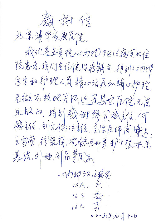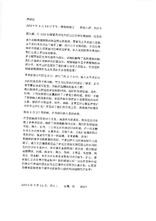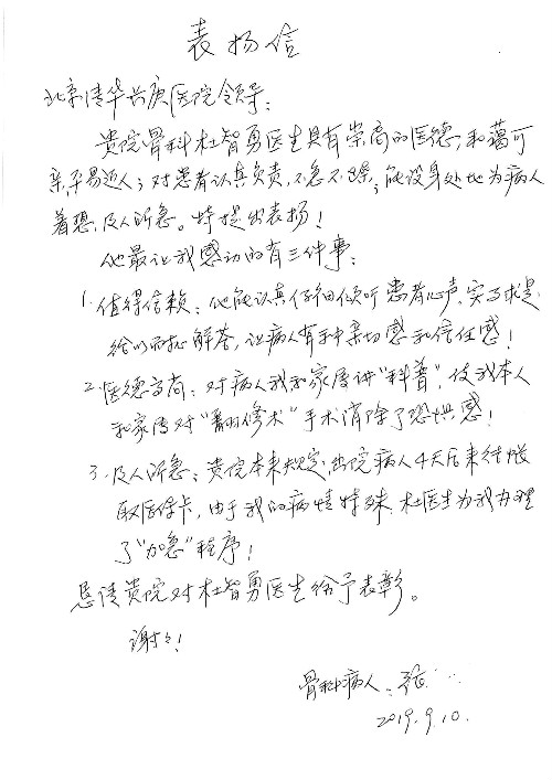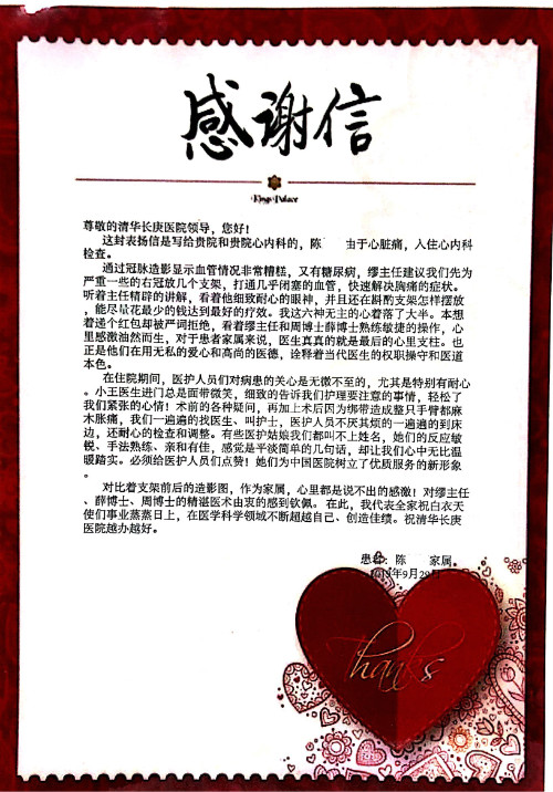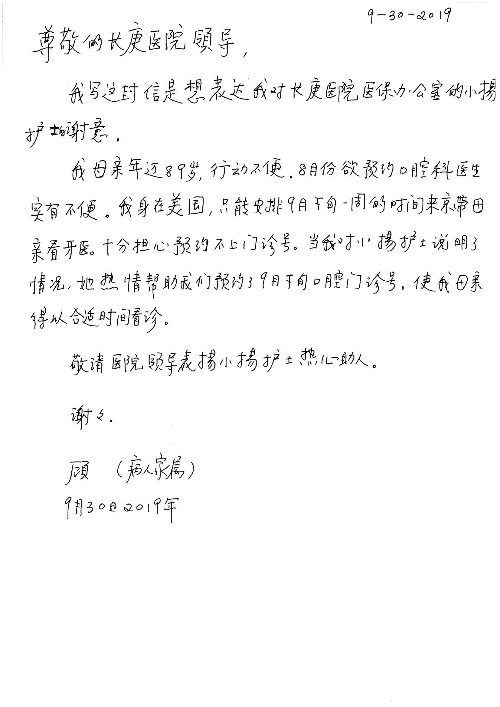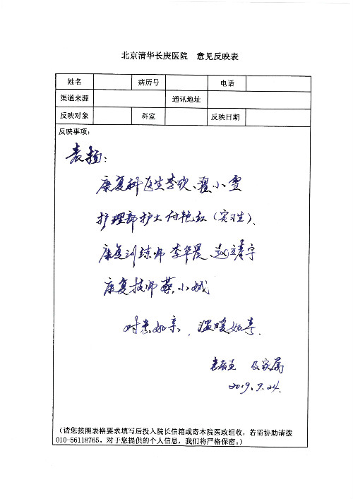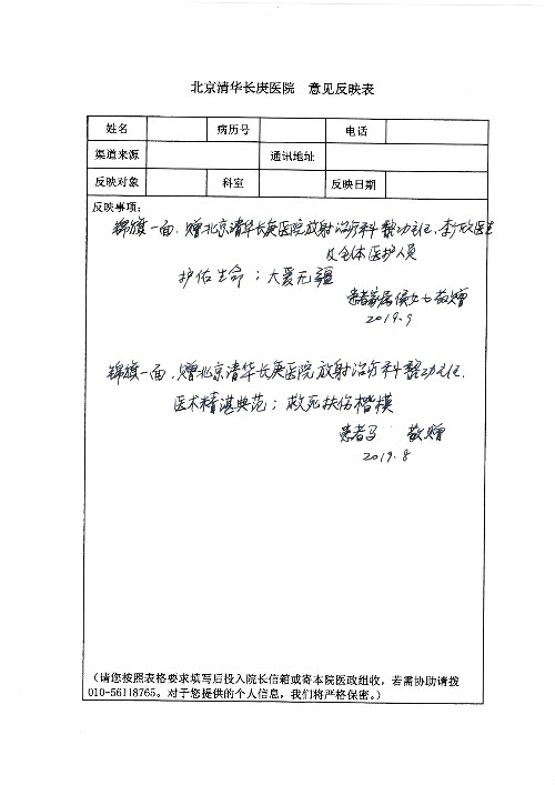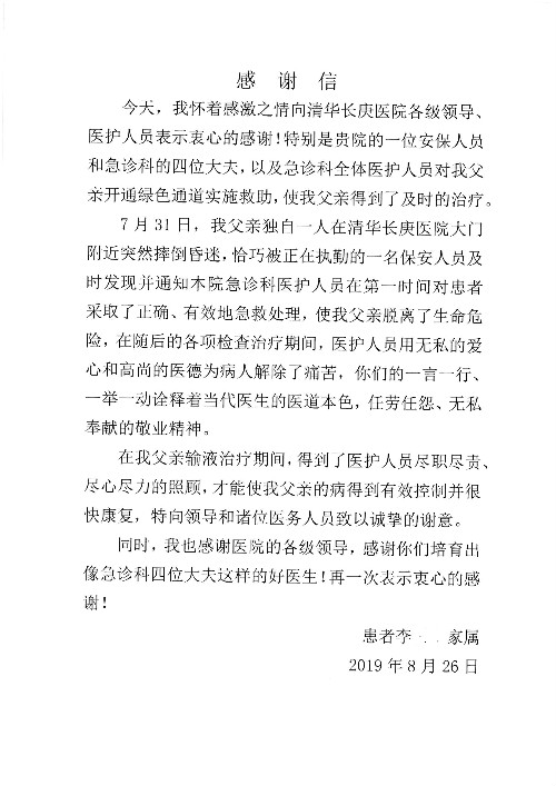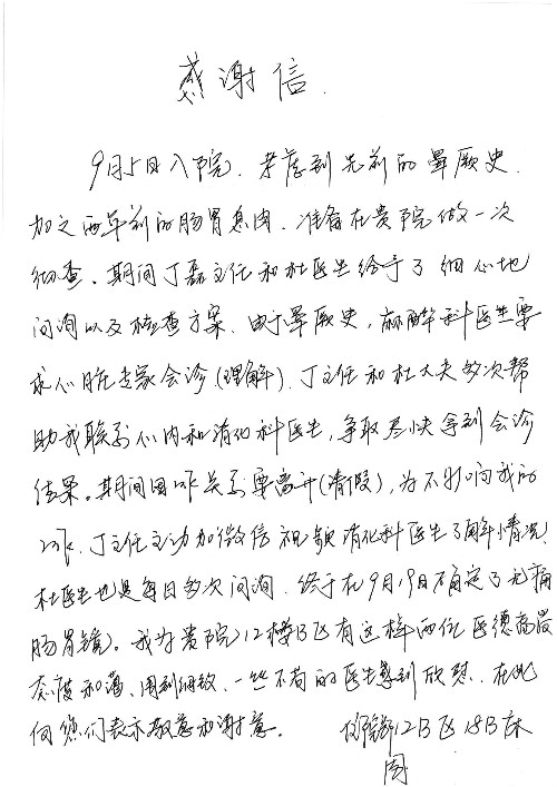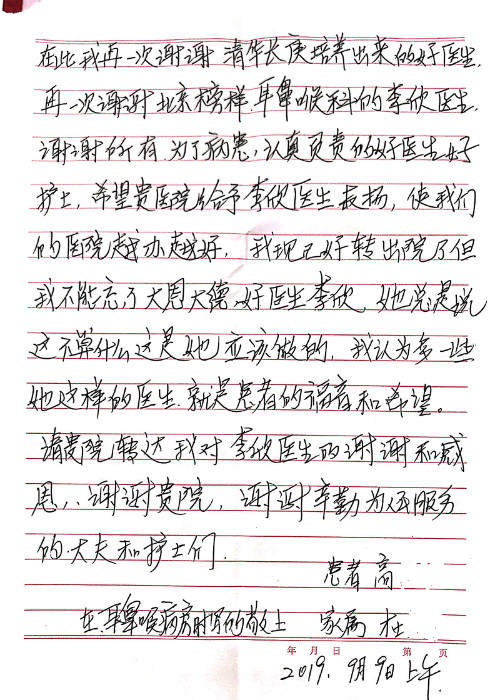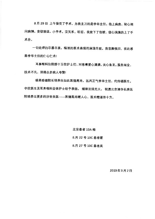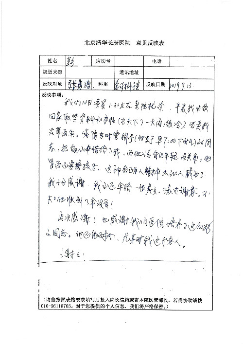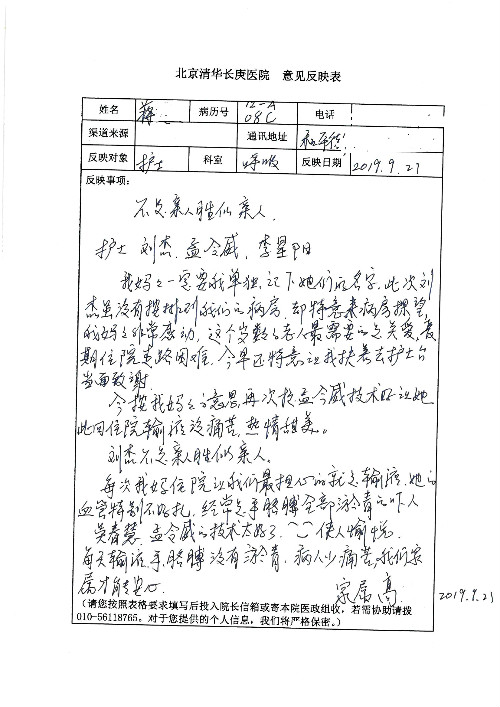 2019年9月,我院共接到患者及家属感谢信55封,锦旗31面,其中耳鼻咽喉头颈外科叶京英主任医师、伊海金主任医师、李欣副主任医师、顼晋昆主治医师,骨科肖嵩华主任医师、刘华玮主治医师,全科医学科王仲主任医师、丁磊副主任医师、邹晓昭医师,神经内科冯新红副主任医师、张小峰主治医师、李秀丽主治医师、杨骊鹏医师、周明医师,胃肠外科李元新主任医师、刘伯涛主治医师,胸腔外科陈东红主任医师,泌尿外科李建兴主任医师、张刚副主任医师,血管外科吴巍巍主任医师、朱融融医师,心脏内科繆国斌主任医师、李艳芳主任医师、刘元伟副主任医师、何榕副主任医师、薛亚军主治医师、周博达主治医师、张鸥医师、周杰医师、王雪莹医师、徐碧荷医师、沈懿医师、翟彦龙技师,呼吸与危重症医学科赵景全主治医师、高博医师、刘金哲医师,康复医学科潘钰主任医师、李欣主治医师、翟晓雪医师、李颜杝治疗师、李华晨治疗师、赵靖宇治疗师、蔡小娥治疗师,放射治疗科黎功主任医师、李广欣主治医师,眼科胡运韬主任医师、司山成主治医师,感染性疾病科林明贵主任医师,消化内科任渝棠主治医师,风湿免疫科黄彦弘主任医师,儿科季丽娜主任医师,医患办武丽,医事处李晓娜、刘静雅、张勇涛、乔威如、杨新蕊,TC王宏宇、李雪,护理部:管琦、赵杰、范佳慧、张楠、周媛、王宇、高稚、吴春慧、孟令威、周营利、张金鹏、李贝贝、于爱洋、蒲媛、何晓亮、梁园园、崔鑫、刘杰、李星阳、薄艳娜、送辉辉、马阳阳、袁馨、张冰、陈慕洁、刘娅、刘晶,胸腔外科病区全体医护人员、血管外科全体护理人员、神经内科全体医护人员、心脏内科全体医护人员、全体全体医护人员、全科医学科全体医护人员、医患办全体员工收到具名表扬。特此公告,以资鼓励!
