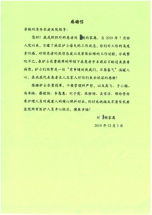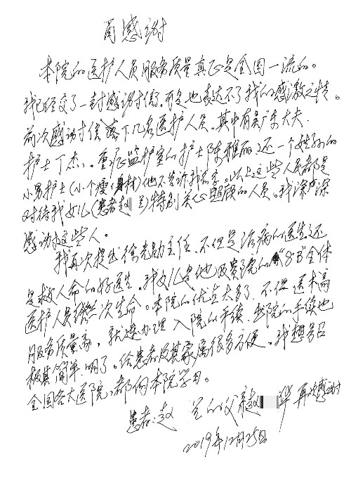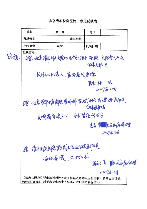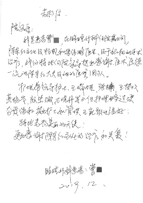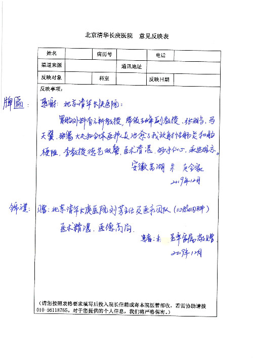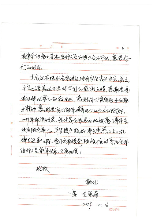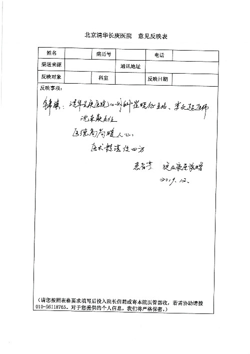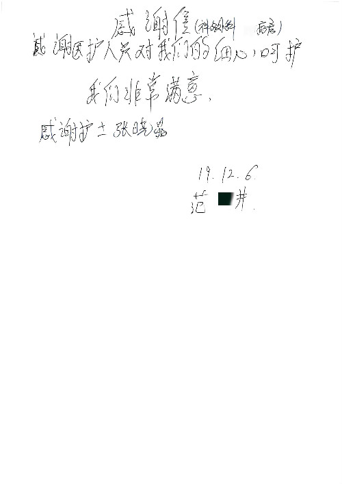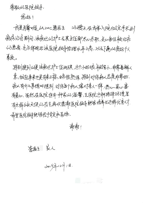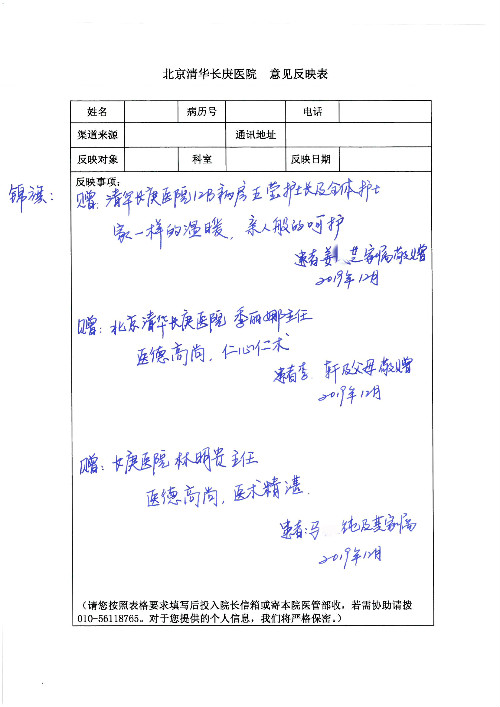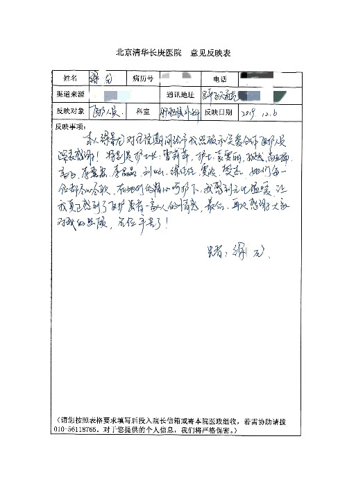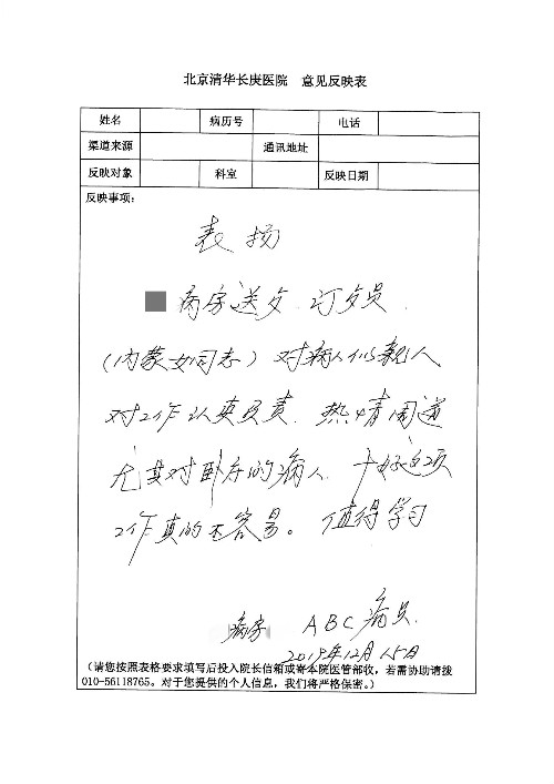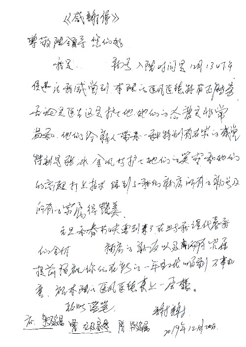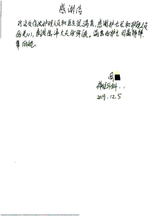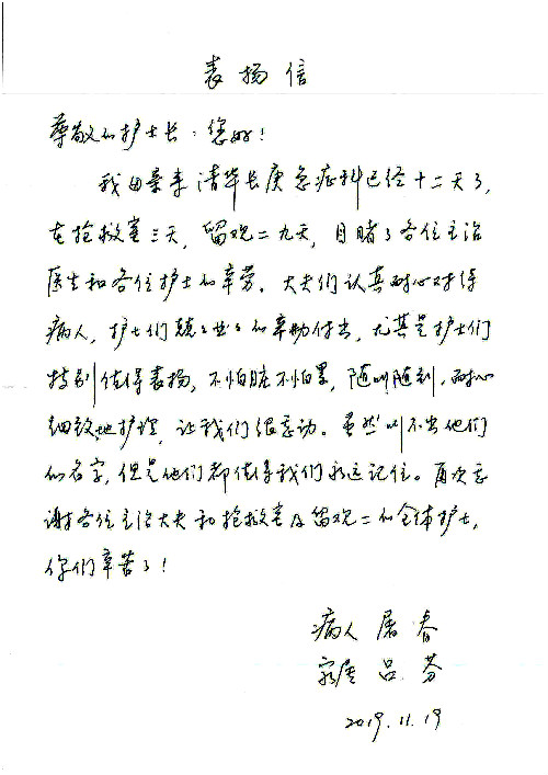 2019年12月,我院共接到患者及家属感谢信64封,锦旗32面,匾额1个,现场表扬4次;其中医院党委周月红书记;肝胆胰中心董家鸿主任医师、项灿宏主任医师、张跃伟主任医师、卢倩副主任医师、孙百军主任医师、徐光勋副主任医师、王良主治医师、曾建平主治医师、公磊主治医师、刘影医师、吴广东医师、周虎医师、黄鑫医师、金烁医师、王文然医师、赵国静医师、王尧医师、周新红医师、张琪佳医师;神经内科武剑主任医师、黄光主任医师、付伟副主任医师、张菁副主任医师、黄丽主治医师、沈懿医师、杨骊鹏;神经外科王贵怀主任医师;普通内科冯莉莉主治医师;普通外科罗斌主任医师、白熠洲主治医师;心脏内科张萍主任医师、缪国斌主任医师、李艳芳主任医师、何榕副主任医师、薛亚军主治医师、谢颖主治医师、周博达主治医师、周杰医师、袁亦方医师、张鸥医师、刘金哲医师、翟彦龙技师;心脏外科沈冬焱副主任医师、崔晓征主治医师、李永超医师;骨科潘勇卫主任医师、蔡谞主任医师、宋飞副主任医师;胃肠外科李元新主任医师、王峰副主任医师、刘伯涛主治医师、张鹏主治医师、张骞主治医师、张骞医师;胸腔外科陈东红主任医师、杨帆主治医师、朱伟鹏医师;康复医学科潘钰主任医师、李欣主治医师、吴琼主治医师、徐泉主治医师、翟晓雪医师、樊森朝技师、苏胜民技师、尹航技师、李平技师;耳鼻咽喉头颈外科叶京英主任医师;眼科乔荣华副主任医师、司山成主治医师、郭立斌医师;口腔科张雪梅主治医师;妇产科廖秦平主任医师;儿科季丽娜主任医师;呼吸内科牟向东主任医师、郭军副主任医师、赵景全主治医师;消化内科蒋绚主任医师、任渝棠主治医师、周智勇医师;内分泌科金丽霞主治医师;血液肿瘤科李昕权主任医师、于卓副主任医师;皮肤科蒋源副主任医师、陈典主治医师、张竹影医师;全科医学科王仲主任医师、邹晓昭医师、严楠医师、杜丽雪医师;药剂科王兰药剂师;医事处住院中心全体工作人员、TC人员(总务、检验科);护理部:任丽琪、张金鹏、徐洁、毕书娇、赵春梅、张冰(11A)、文坤、史金凤(11A)、林景熠、薄燕娜、曲珊珊、唐建建、张晓晶,张雪芹、赵雪莲、张晓晶、刘灿、尚亚楠、丁杰、陈雅丽、曹静萍、曹莉萍、蔡敏丽、张雅绯、刘子霞、吴雪洁、李惠惠、李晶晶、高飞、于小梅、刘侠、秦蒙蒙、邓玲、王莹、刘帅、刘灿、徐佳佳、贾波、樊杰、严哲、袁雯丽、孙越、常秀、张小蒙、王宇、王瑞娅、张楠、王梦欢、黄梅苓、颜紫薇、石晓丹、管琪、王凯歌、甄姣、张坤,以及肝胆胰中心全体医护人员、血管外科全体医护人员、神经外科全体医护人员、普通外科全体医护人员、胃肠外科全体医护人员、心脏内科全体医护人员、消化内科全体医护人员、皮肤科全体医护人员、检验科全体医护人员、日间病房全体医护人员、急诊全体医护人员、社会服务科志愿者收到具名表扬。