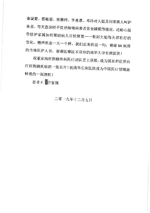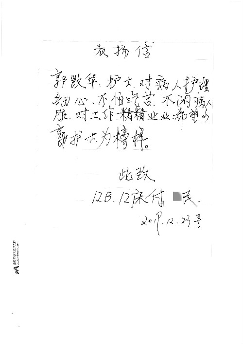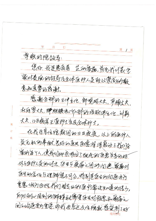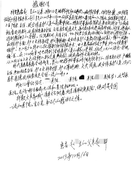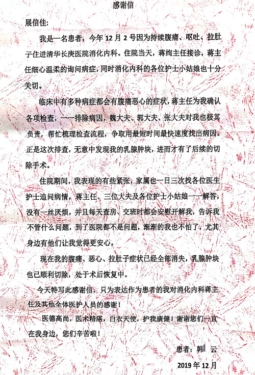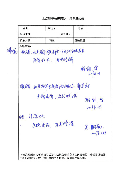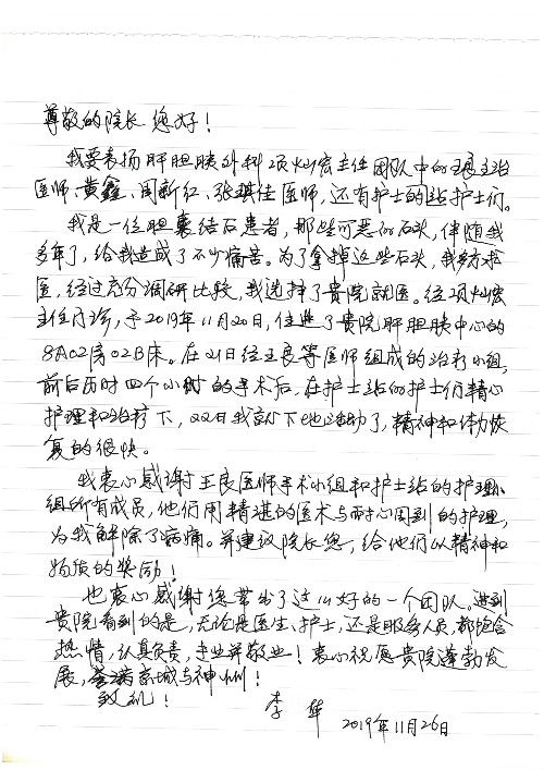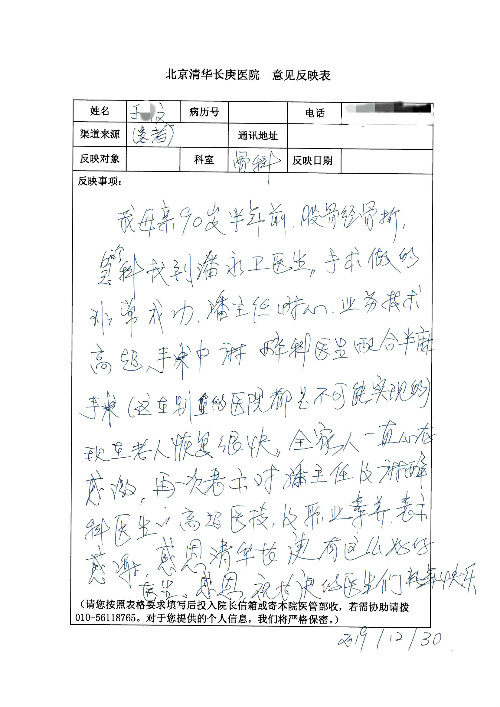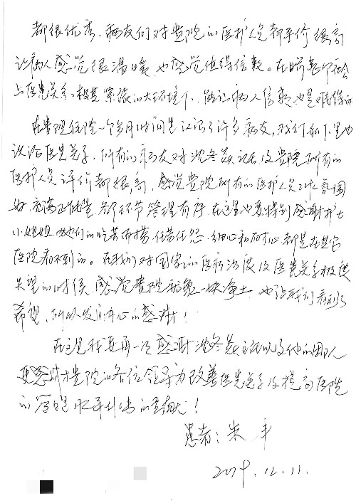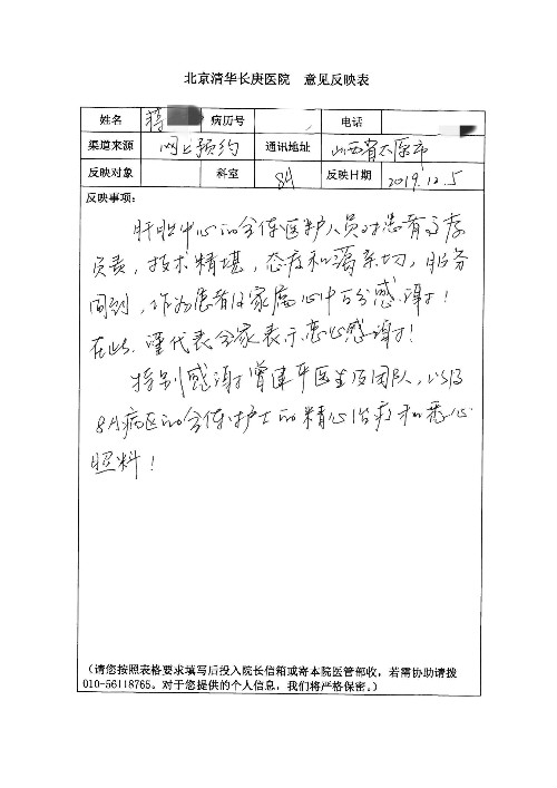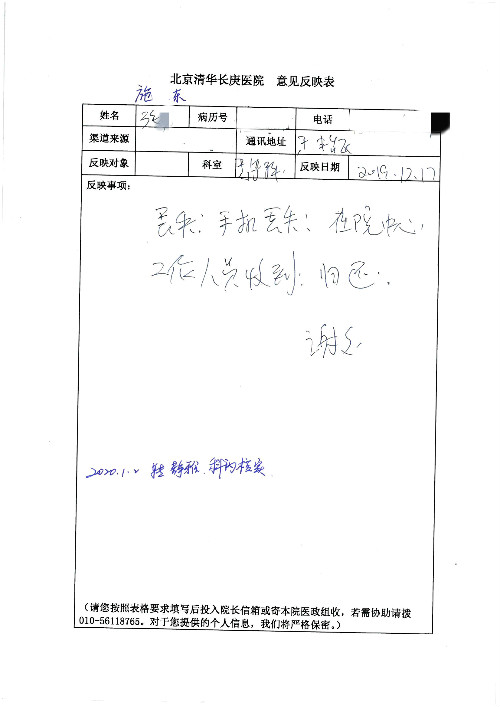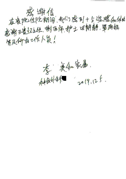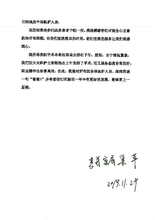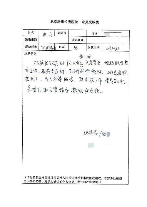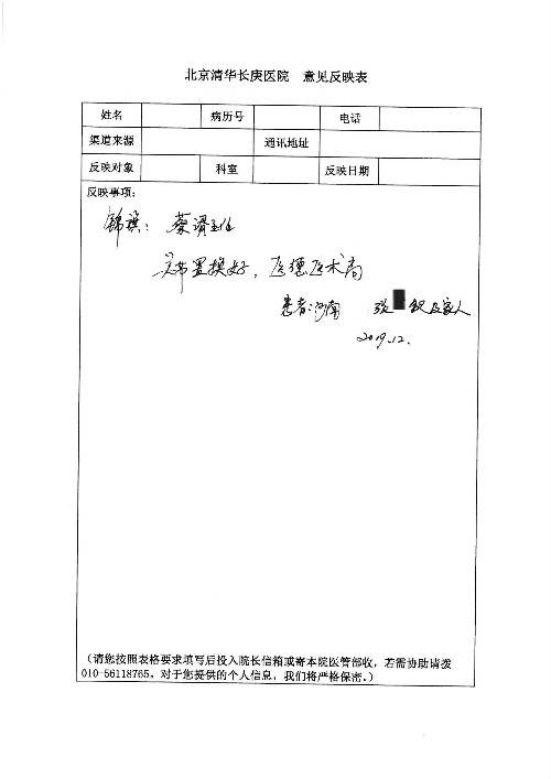2019年12月,我院共接到患者及家属感谢信64封,锦旗32面,匾额1个,现场表扬4次;其中医院党委周月红书记;肝胆胰中心董家鸿主任医师、项灿宏主任医师、张跃伟主任医师、卢倩副主任医师、孙百军主任医师、徐光勋副主任医师、王良主治医师、曾建平主治医师、公磊主治医师、刘影医师、吴广东医师、周虎医师、黄鑫医师、金烁医师、王文然医师、赵国静医师、王尧医师、周新红医师、张琪佳医师;神经内科武剑主任医师、黄光主任医师、付伟副主任医师、张菁副主任医师、黄丽主治医师、沈懿医师、杨骊鹏;神经外科王贵怀主任医师;普通内科冯莉莉主治医师;普通外科罗斌主任医师、白熠洲主治医师;心脏内科张萍主任医师、缪国斌主任医师、李艳芳主任医师、何榕副主任医师、薛亚军主治医师、谢颖主治医师、周博达主治医师、周杰医师、袁亦方医师、张鸥医师、刘金哲医师、翟彦龙技师;心脏外科沈冬焱副主任医师、崔晓征主治医师、李永超医师;骨科潘勇卫主任医师、蔡谞主任医师、宋飞副主任医师;胃肠外科李元新主任医师、王峰副主任医师、刘伯涛主治医师、张鹏主治医师、张骞主治医师、张骞医师;胸腔外科陈东红主任医师、杨帆主治医师、朱伟鹏医师;康复医学科潘钰主任医师、李欣主治医师、吴琼主治医师、徐泉主治医师、翟晓雪医师、樊森朝技师、苏胜民技师、尹航技师、李平技师;耳鼻咽喉头颈外科叶京英主任医师;眼科乔荣华副主任医师、司山成主治医师、郭立斌医师;口腔科张雪梅主治医师;妇产科廖秦平主任医师;儿科季丽娜主任医师;呼吸内科牟向东主任医师、郭军副主任医师、赵景全主治医师;消化内科蒋绚主任医师、任渝棠主治医师、周智勇医师;内分泌科金丽霞主治医师;血液肿瘤科李昕权主任医师、于卓副主任医师;皮肤科蒋源副主任医师、陈典主治医师、张竹影医师;全科医学科王仲主任医师、邹晓昭医师、严楠医师、杜丽雪医师;药剂科王兰药剂师;医事处住院中心全体工作人员、TC人员(总务、检验科);护理部:任丽琪、张金鹏、徐洁、毕书娇、赵春梅、张冰(11A)、文坤、史金凤(11A)、林景熠、薄燕娜、曲珊珊、唐建建、张晓晶,张雪芹、赵雪莲、张晓晶、刘灿、尚亚楠、丁杰、陈雅丽、曹静萍、曹莉萍、蔡敏丽、张雅绯、刘子霞、吴雪洁、李惠惠、李晶晶、高飞、于小梅、刘侠、秦蒙蒙、邓玲、王莹、刘帅、刘灿、徐佳佳、贾波、樊杰、严哲、袁雯丽、孙越、常秀、张小蒙、王宇、王瑞娅、张楠、王梦欢、黄梅苓、颜紫薇、石晓丹、管琪、王凯歌、甄姣、张坤,以及肝胆胰中心全体医护人员、血管外科全体医护人员、神经外科全体医护人员、普通外科全体医护人员、胃肠外科全体医护人员、心脏内科全体医护人员、消化内科全体医护人员、皮肤科全体医护人员、检验科全体医护人员、日间病房全体医护人员、急诊全体医护人员、社会服务科志愿者收到具名表扬。