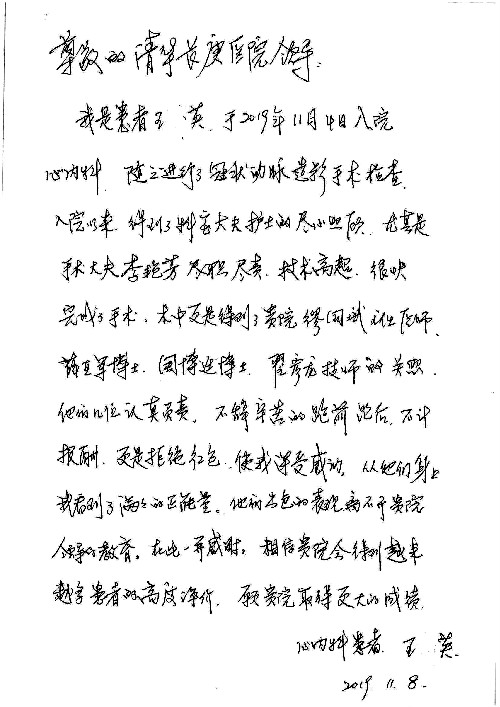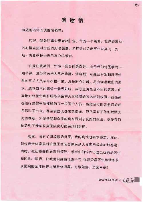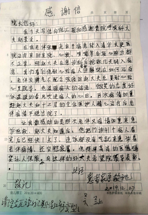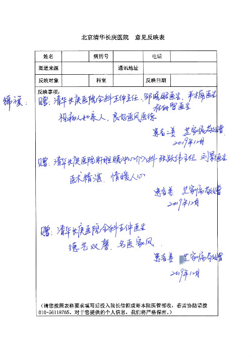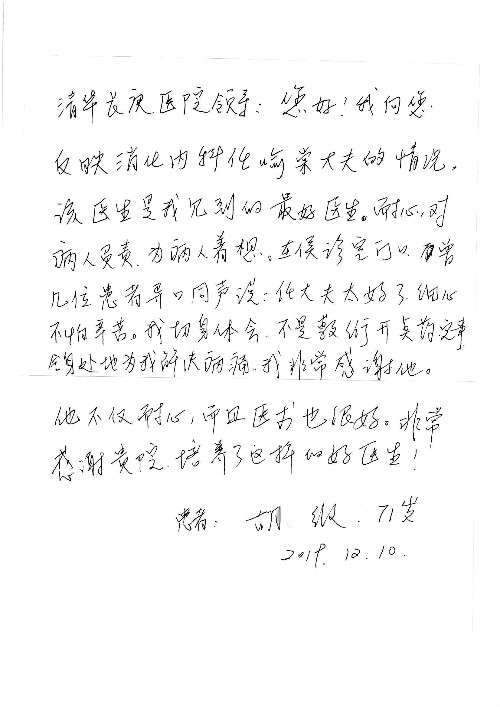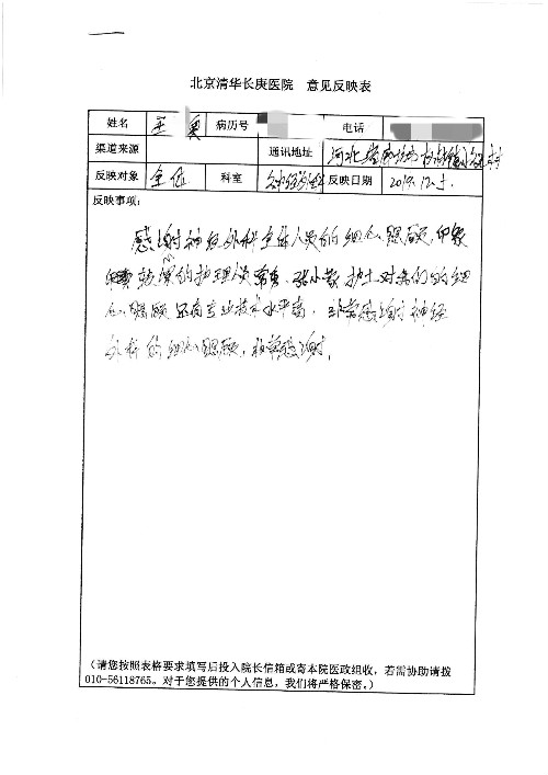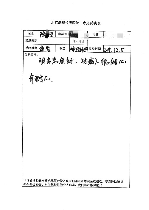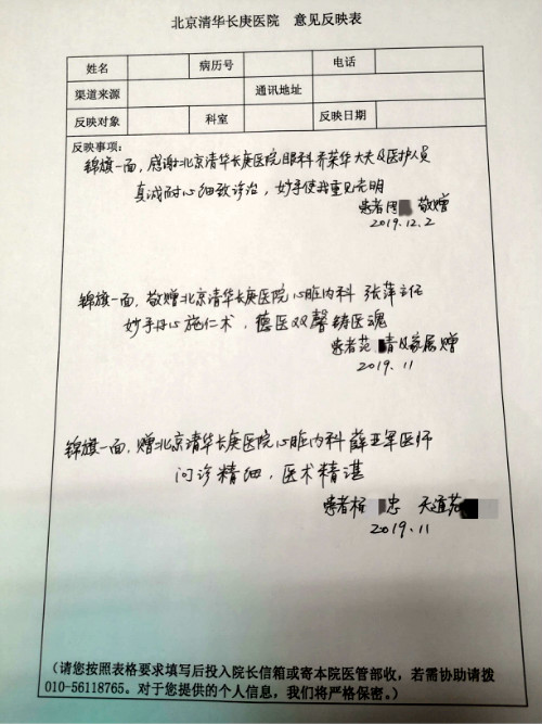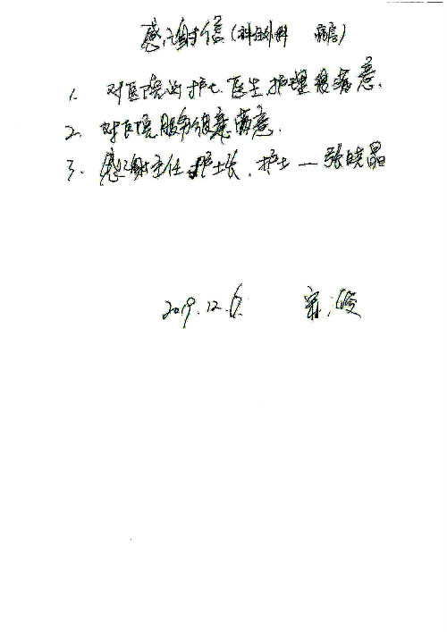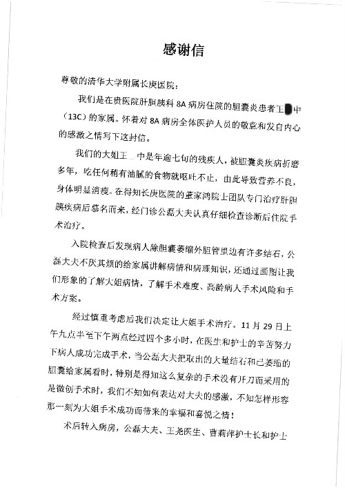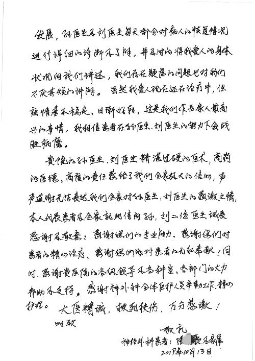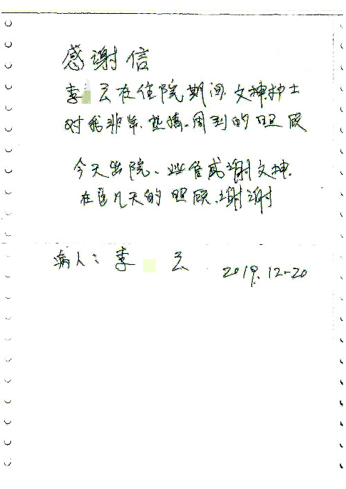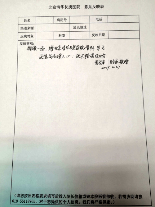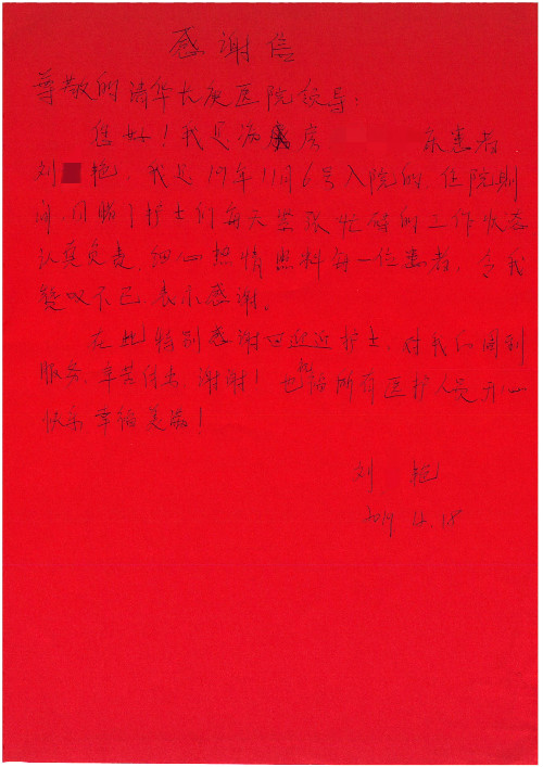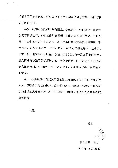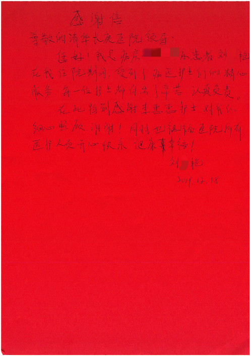 2019年12月,我院共接到患者及家属感谢信64封,锦旗32面,匾额1个,现场表扬4次;其中医院党委周月红书记;肝胆胰中心董家鸿主任医师、项灿宏主任医师、张跃伟主任医师、卢倩副主任医师、孙百军主任医师、徐光勋副主任医师、王良主治医师、曾建平主治医师、公磊主治医师、刘影医师、吴广东医师、周虎医师、黄鑫医师、金烁医师、王文然医师、赵国静医师、王尧医师、周新红医师、张琪佳医师;神经内科武剑主任医师、黄光主任医师、付伟副主任医师、张菁副主任医师、黄丽主治医师、沈懿医师、杨骊鹏;神经外科王贵怀主任医师;普通内科冯莉莉主治医师;普通外科罗斌主任医师、白熠洲主治医师;心脏内科张萍主任医师、缪国斌主任医师、李艳芳主任医师、何榕副主任医师、薛亚军主治医师、谢颖主治医师、周博达主治医师、周杰医师、袁亦方医师、张鸥医师、刘金哲医师、翟彦龙技师;心脏外科沈冬焱副主任医师、崔晓征主治医师、李永超医师;骨科潘勇卫主任医师、蔡谞主任医师、宋飞副主任医师;胃肠外科李元新主任医师、王峰副主任医师、刘伯涛主治医师、张鹏主治医师、张骞主治医师、张骞医师;胸腔外科陈东红主任医师、杨帆主治医师、朱伟鹏医师;康复医学科潘钰主任医师、李欣主治医师、吴琼主治医师、徐泉主治医师、翟晓雪医师、樊森朝技师、苏胜民技师、尹航技师、李平技师;耳鼻咽喉头颈外科叶京英主任医师;眼科乔荣华副主任医师、司山成主治医师、郭立斌医师;口腔科张雪梅主治医师;妇产科廖秦平主任医师;儿科季丽娜主任医师;呼吸内科牟向东主任医师、郭军副主任医师、赵景全主治医师;消化内科蒋绚主任医师、任渝棠主治医师、周智勇医师;内分泌科金丽霞主治医师;血液肿瘤科李昕权主任医师、于卓副主任医师;皮肤科蒋源副主任医师、陈典主治医师、张竹影医师;全科医学科王仲主任医师、邹晓昭医师、严楠医师、杜丽雪医师;药剂科王兰药剂师;医事处住院中心全体工作人员、TC人员(总务、检验科);护理部:任丽琪、张金鹏、徐洁、毕书娇、赵春梅、张冰(11A)、文坤、史金凤(11A)、林景熠、薄燕娜、曲珊珊、唐建建、张晓晶,张雪芹、赵雪莲、张晓晶、刘灿、尚亚楠、丁杰、陈雅丽、曹静萍、曹莉萍、蔡敏丽、张雅绯、刘子霞、吴雪洁、李惠惠、李晶晶、高飞、于小梅、刘侠、秦蒙蒙、邓玲、王莹、刘帅、刘灿、徐佳佳、贾波、樊杰、严哲、袁雯丽、孙越、常秀、张小蒙、王宇、王瑞娅、张楠、王梦欢、黄梅苓、颜紫薇、石晓丹、管琪、王凯歌、甄姣、张坤,以及肝胆胰中心全体医护人员、血管外科全体医护人员、神经外科全体医护人员、普通外科全体医护人员、胃肠外科全体医护人员、心脏内科全体医护人员、消化内科全体医护人员、皮肤科全体医护人员、检验科全体医护人员、日间病房全体医护人员、急诊全体医护人员、社会服务科志愿者收到具名表扬。