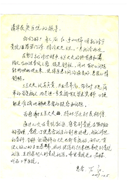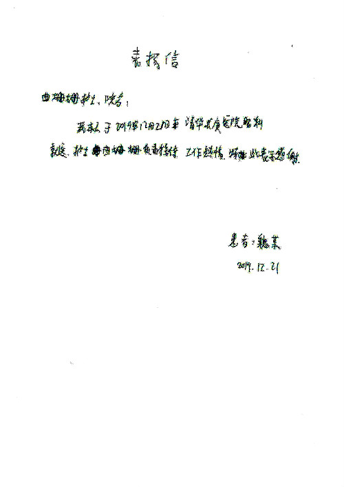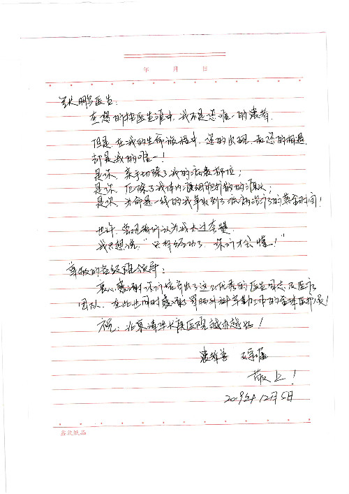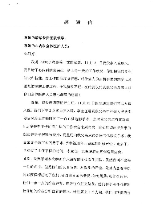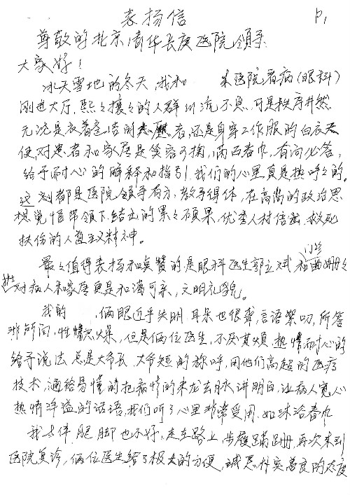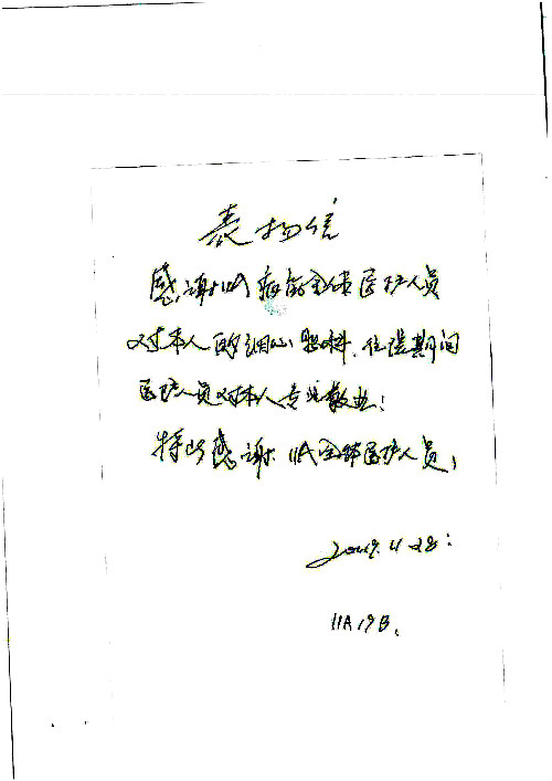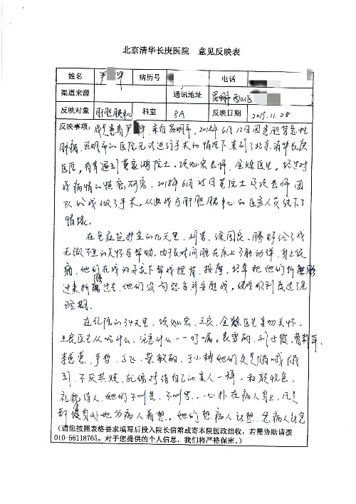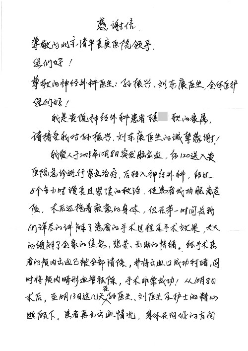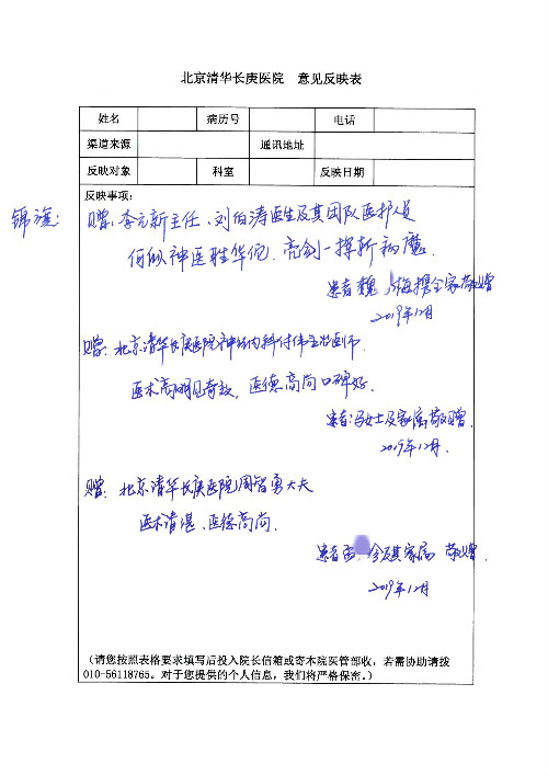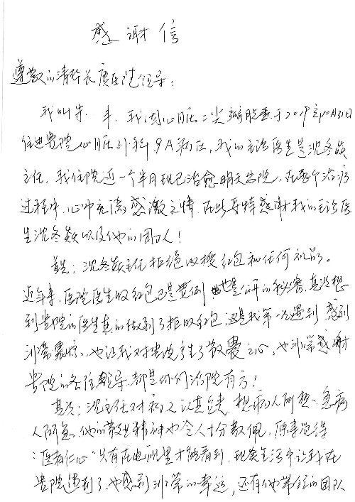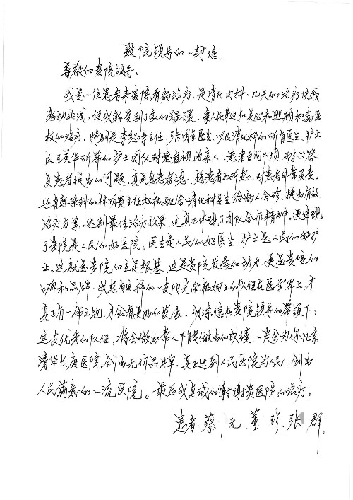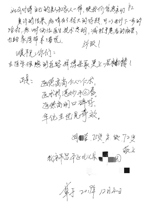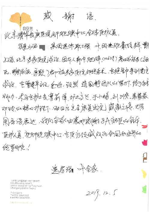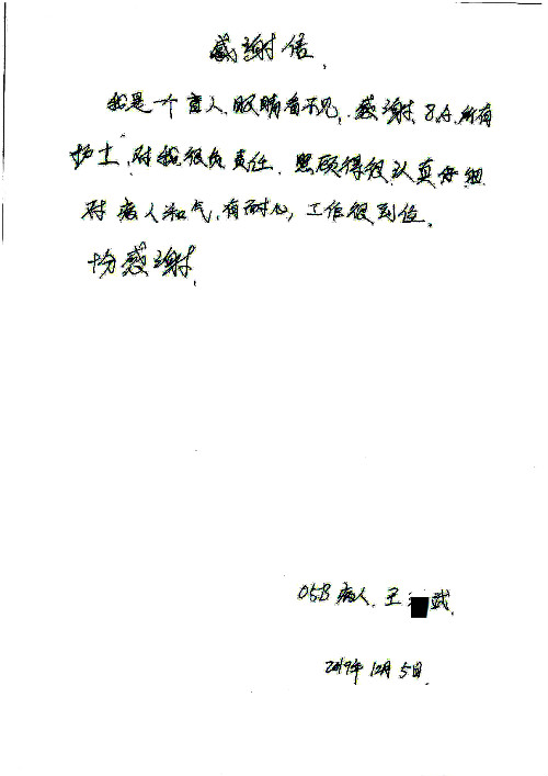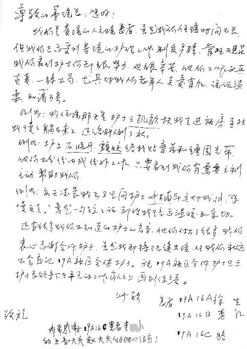2019年12月,我院共接到患者及家属感谢信64封,锦旗32面,匾额1个,现场表扬4次;其中医院党委周月红书记;肝胆胰中心董家鸿主任医师、项灿宏主任医师、张跃伟主任医师、卢倩副主任医师、孙百军主任医师、徐光勋副主任医师、王良主治医师、曾建平主治医师、公磊主治医师、刘影医师、吴广东医师、周虎医师、黄鑫医师、金烁医师、王文然医师、赵国静医师、王尧医师、周新红医师、张琪佳医师;神经内科武剑主任医师、黄光主任医师、付伟副主任医师、张菁副主任医师、黄丽主治医师、沈懿医师、杨骊鹏;神经外科王贵怀主任医师;普通内科冯莉莉主治医师;普通外科罗斌主任医师、白熠洲主治医师;心脏内科张萍主任医师、缪国斌主任医师、李艳芳主任医师、何榕副主任医师、薛亚军主治医师、谢颖主治医师、周博达主治医师、周杰医师、袁亦方医师、张鸥医师、刘金哲医师、翟彦龙技师;心脏外科沈冬焱副主任医师、崔晓征主治医师、李永超医师;骨科潘勇卫主任医师、蔡谞主任医师、宋飞副主任医师;胃肠外科李元新主任医师、王峰副主任医师、刘伯涛主治医师、张鹏主治医师、张骞主治医师、张骞医师;胸腔外科陈东红主任医师、杨帆主治医师、朱伟鹏医师;康复医学科潘钰主任医师、李欣主治医师、吴琼主治医师、徐泉主治医师、翟晓雪医师、樊森朝技师、苏胜民技师、尹航技师、李平技师;耳鼻咽喉头颈外科叶京英主任医师;眼科乔荣华副主任医师、司山成主治医师、郭立斌医师;口腔科张雪梅主治医师;妇产科廖秦平主任医师;儿科季丽娜主任医师;呼吸内科牟向东主任医师、郭军副主任医师、赵景全主治医师;消化内科蒋绚主任医师、任渝棠主治医师、周智勇医师;内分泌科金丽霞主治医师;血液肿瘤科李昕权主任医师、于卓副主任医师;皮肤科蒋源副主任医师、陈典主治医师、张竹影医师;全科医学科王仲主任医师、邹晓昭医师、严楠医师、杜丽雪医师;药剂科王兰药剂师;医事处住院中心全体工作人员、TC人员(总务、检验科);护理部:任丽琪、张金鹏、徐洁、毕书娇、赵春梅、张冰(11A)、文坤、史金凤(11A)、林景熠、薄燕娜、曲珊珊、唐建建、张晓晶,张雪芹、赵雪莲、张晓晶、刘灿、尚亚楠、丁杰、陈雅丽、曹静萍、曹莉萍、蔡敏丽、张雅绯、刘子霞、吴雪洁、李惠惠、李晶晶、高飞、于小梅、刘侠、秦蒙蒙、邓玲、王莹、刘帅、刘灿、徐佳佳、贾波、樊杰、严哲、袁雯丽、孙越、常秀、张小蒙、王宇、王瑞娅、张楠、王梦欢、黄梅苓、颜紫薇、石晓丹、管琪、王凯歌、甄姣、张坤,以及肝胆胰中心全体医护人员、血管外科全体医护人员、神经外科全体医护人员、普通外科全体医护人员、胃肠外科全体医护人员、心脏内科全体医护人员、消化内科全体医护人员、皮肤科全体医护人员、检验科全体医护人员、日间病房全体医护人员、急诊全体医护人员、社会服务科志愿者收到具名表扬。
