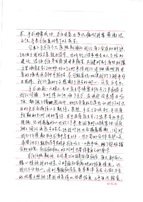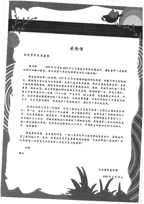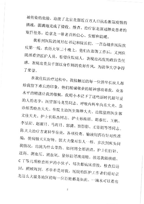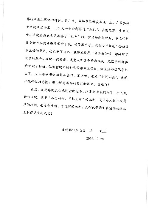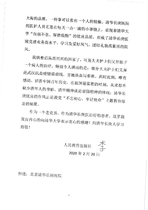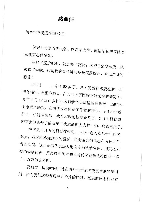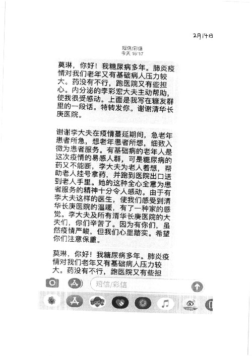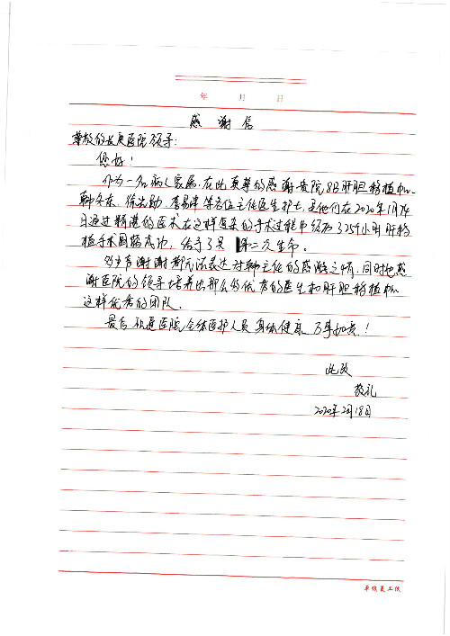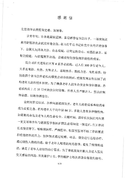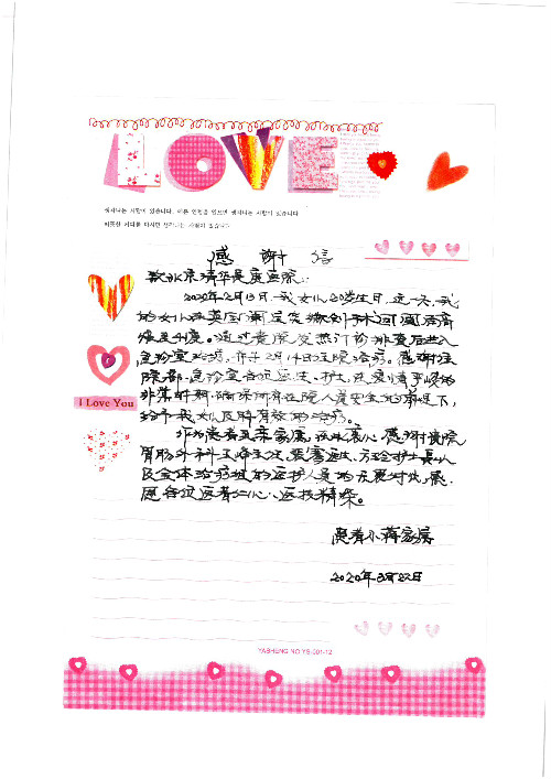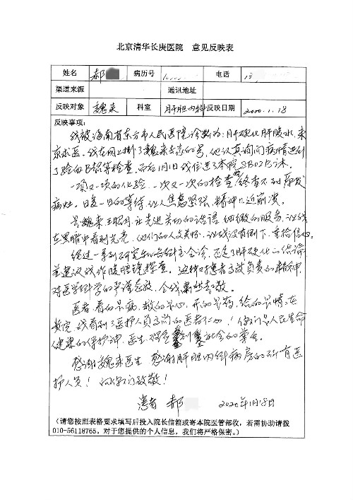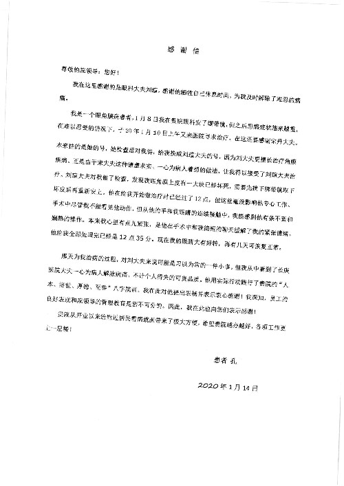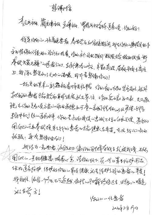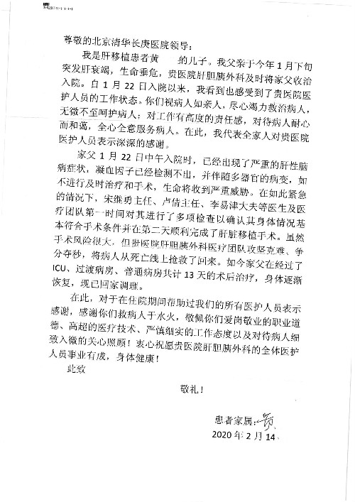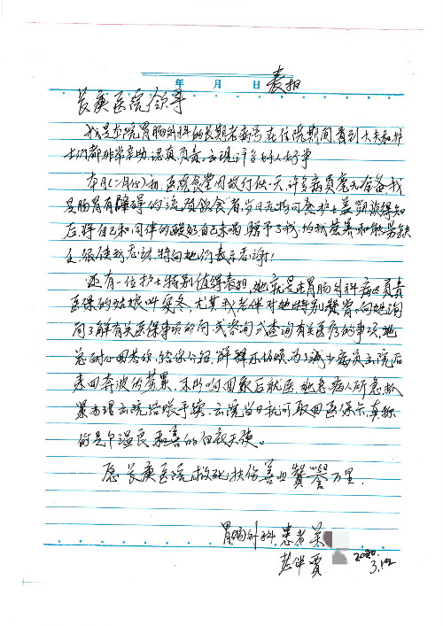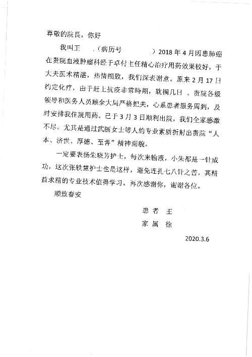 2020年2月至3月,我院共接到患者及家属感谢信17封,锦旗1面;其中医院党委及周月红书记、普通内科第一党支部;肝胆胰中心董家鸿主任医师、魏来主任医师、陈虹主任医师、张跃伟主任医师、徐光勋副主任医师、卢倩副主任医师、汤睿主治医师、宋继勇医师、周虎医师、李昂医师、李津易医师、王昭月医师;OPO办公室孙百军主任医师;普通外科罗斌主任医师;普通内科龚晓杰主治医师;神经内科陈晔医师;呼吸内科牟向东主任医师;胃肠外科李元新主任医师、蔺宏伟副主任医师、王峰副主任医师、张骞主治医师;泌尿外科张刚副主任医师、肖博主治医师;心脏内科郭文佳医师;胸腔外科陈东红主任医师、朱伟鹏医师;皮肤科赵邑主任医师;眼科刘瑄副主任医师、宋丹副主任医师;口腔科徐军主任医师;中医科刘承主治医师;血液肿瘤科于卓副主任医师;全科医学科王仲主任医师、严楠医师、杜丽雪医师、邹晓昭医师;医务管理部马龙男、武丽、黄杰、安冬;护理部:韩杰、孙姝研、胡春红、王帆、李星阳、赵丽月、马海月、郭潇、贾影影、王青娟、朱晓芳、张轶慧、宋美娜、李艳梅、周娇、甄娇、盖凯旋、方玲、李彩宏。麻醉科全体医护人员;急诊科全体医护人员;胃肠外科全体医护人员、皮肤科全体医护人员、中医科全体医护人员、肝胆内科病房医护人员收到具名表扬。