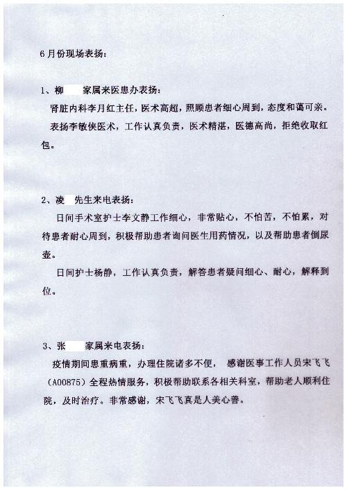 2020年6月,我院共接到患者及家属感谢信29封,锦旗18面,其他形式表扬4个;其中心脏内科缪国斌主任医师、薛亚军副主任医师、周博达主治医师、张鸥主治医师、向伟主治医师、耿雨医师、杨靖医师;心脏外科沈冬焱副主任医师、杨栩鹏医师;胸腔外科陈东红主任医师、朱伟鹏主治医师、曹加顺主治医师、李子澎医师;胃肠外科李元新主任医师、王峰副主任医师、朱志东副主任医师、孙孝文主治医师、庄卓男医师、朱长真医师;消化内科任渝棠副主任医师;肾脏内科李月红主任医师、李敏侠主治医师;呼吸及危重症科赵景全主治医师;骨科宋杨华东主治医师、王振医师;神经内科冯新红副主任医师;妇产科马珂副主任医师、张蕾副主任医师、王晓茜主治医师;急诊科范春杨医师;耳鼻咽喉头颈外科伊海金主任医师、秦贺副主任医师、胡斌医师;眼科胡运韬主任医师;血液肿瘤科于卓副主任医师;医事处宋飞飞;护理部:李童、任野、李文静、杨静、范佳慧、石晓丹、王瑞娅、樊景春、马阳阳、辛铜、宋辉辉、王梦丽、赵灿、张惠文、蔡娟、许乐、;胃肠外科全体医护人员、心脏内科全体医护人员、神经内科全体医护人员、消化内科全体医护人员、妇产科全体医护人员、急诊科全体医护人员、骨科全体医护人员、日间病房全体医护人员、耳鼻咽喉头颈外科全体医护人员、保卫处全体工作人员收到具名表扬。