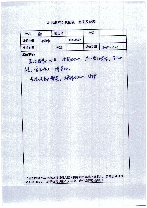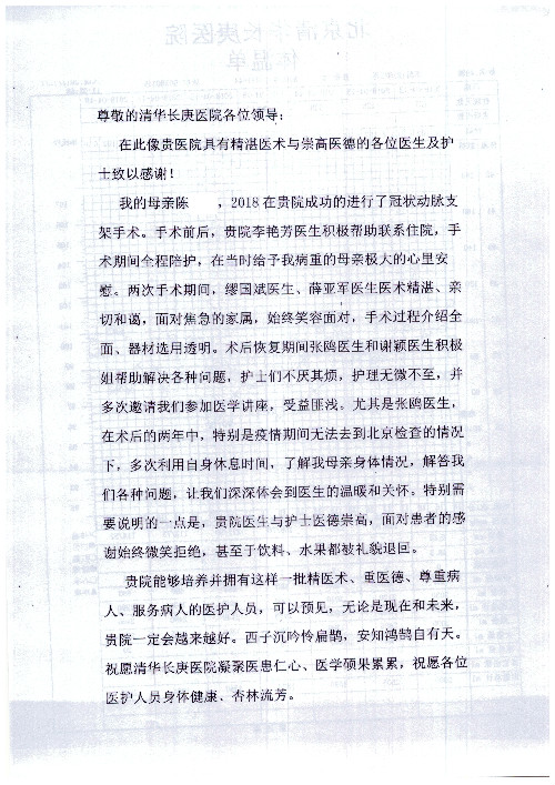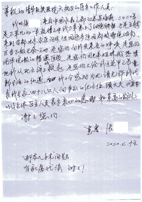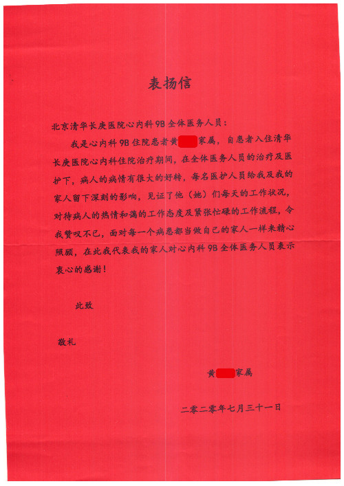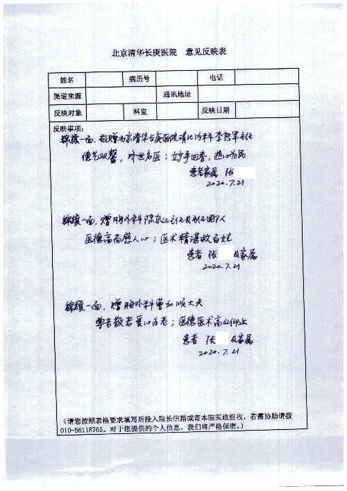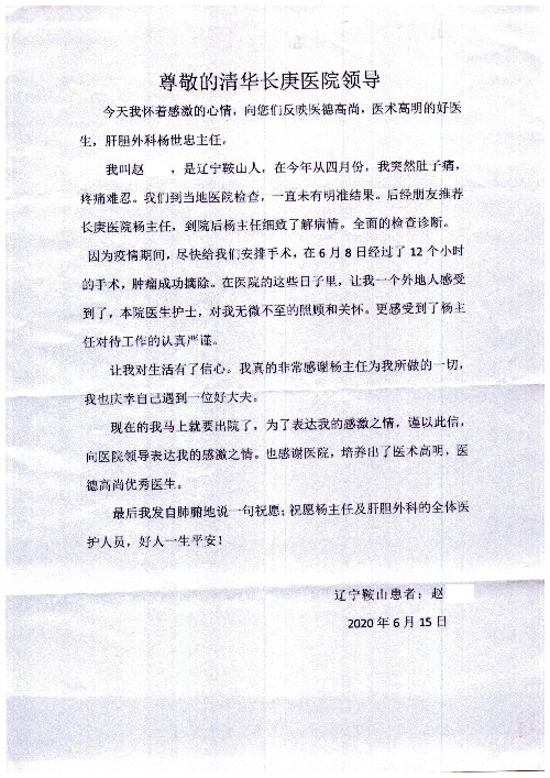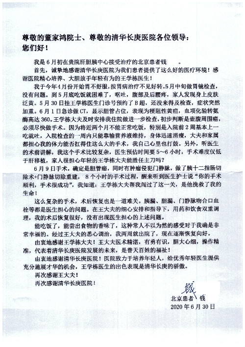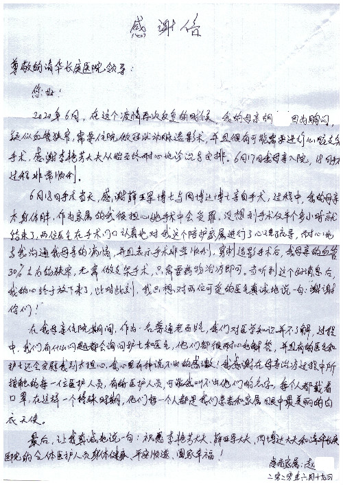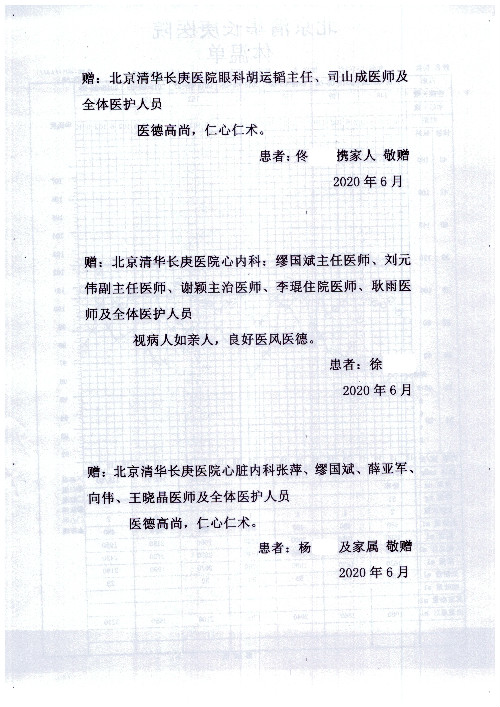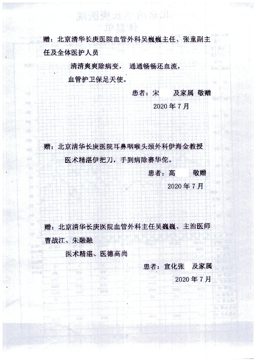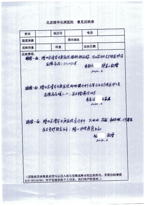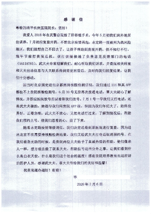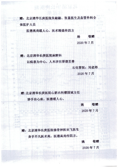 公告北京清华长庚医院患者及家属感谢信【2020年7月份】