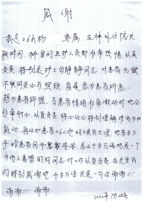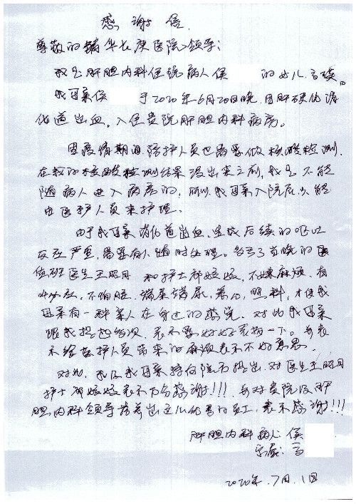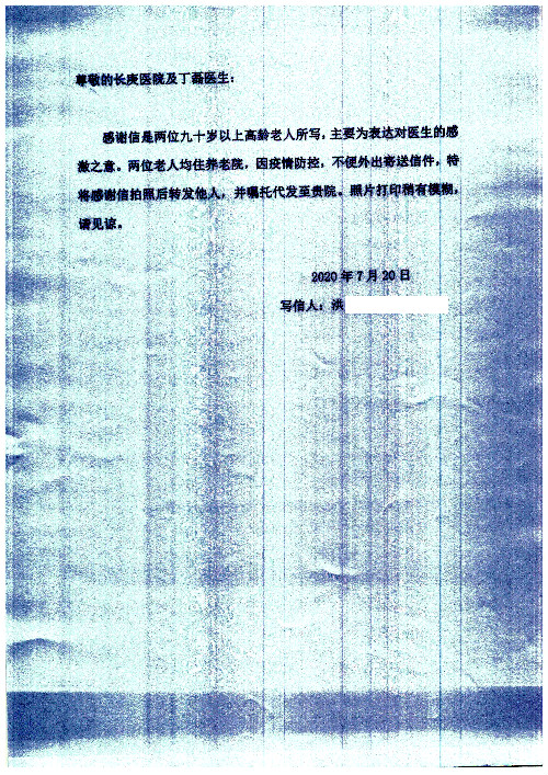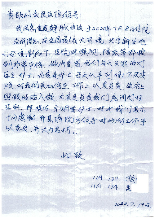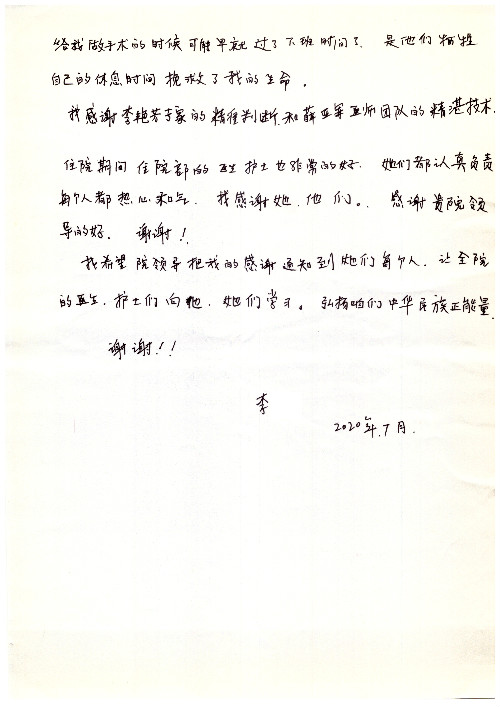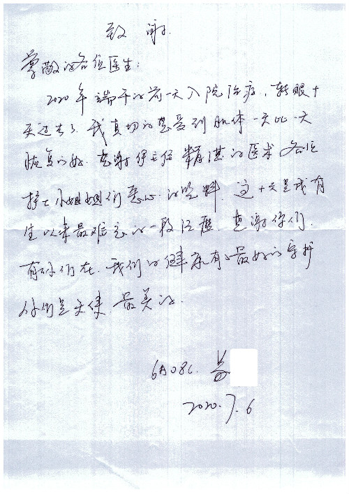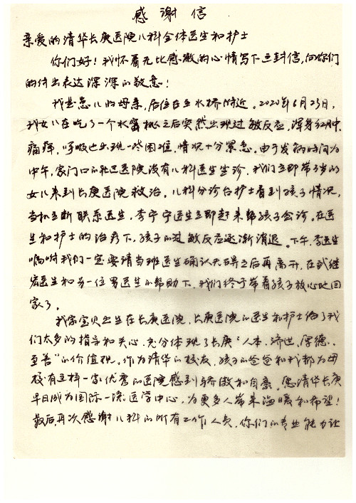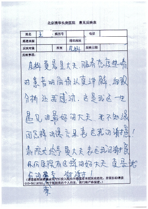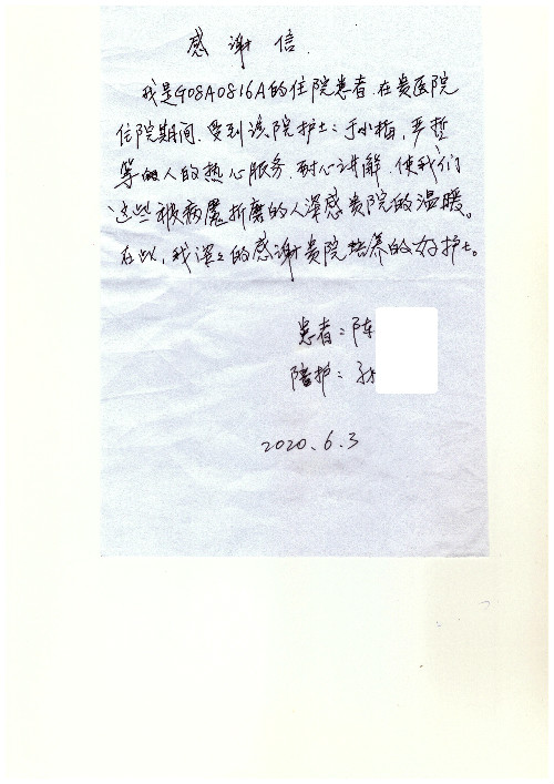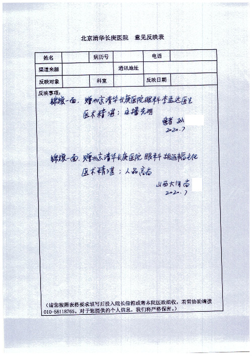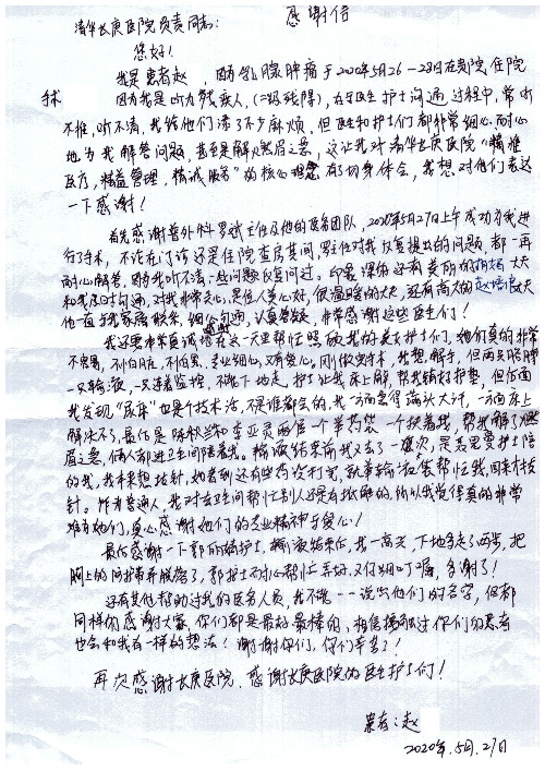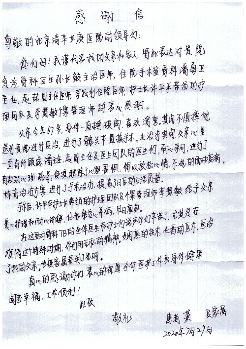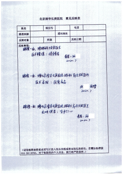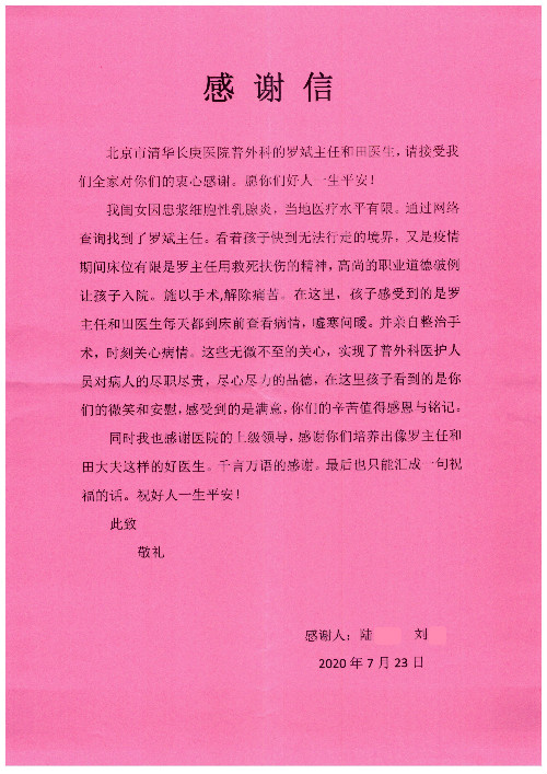 公告北京清华长庚医院患者及家属感谢信【2020年7月份】