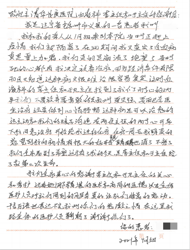 血液科副主任医师于凡接到了一份来自辽宁的信件,拆开一看,里面包着三封手写信。患者回忆着2021年初迎着疫情,从外地到北京清华长庚医院求医的经历,连连感谢着带队到临时隔离留观区一一探望患者的副院长魏来,帮助他发现病因的耳鼻喉科主任医师吴彦桥,以及最终救下性命的血液科主任李利红团队。