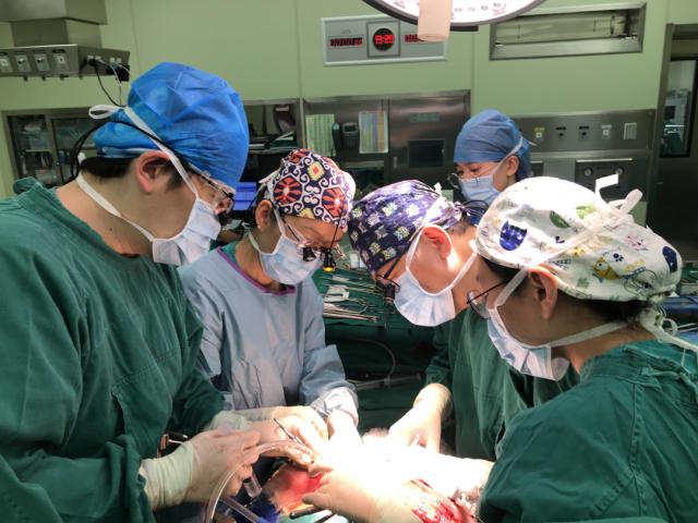 ▲董家鸿(左三)、卢倩(左二)进行手术