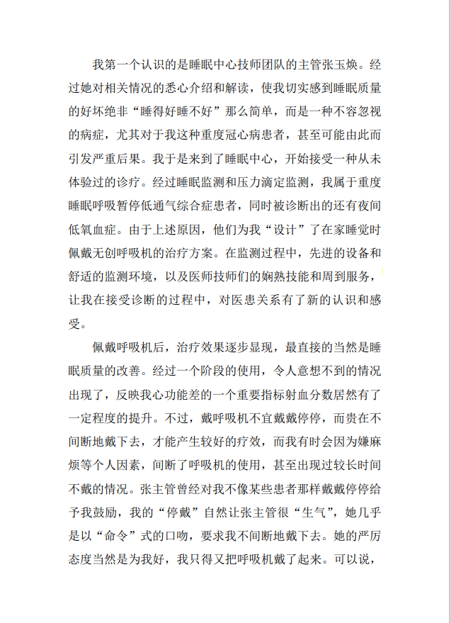 随着规律的复查,陶大爷与睡眠医学中心团队的联系越来越紧密,也让他对医患关系有了新的认识和感受:“我每次去睡眠中心都会油然而生‘宾至如归’的感觉。在我看来,这个医疗团队在叶京英教授带领下、在睡眠中心技术主管张玉焕的管理下,每一个成员,都在工作中自觉地展现着敬业精神,他们以专业素养和专业技能为患者服务的同时,还让患者时时处处感受到发自他们内心的亲和力。”